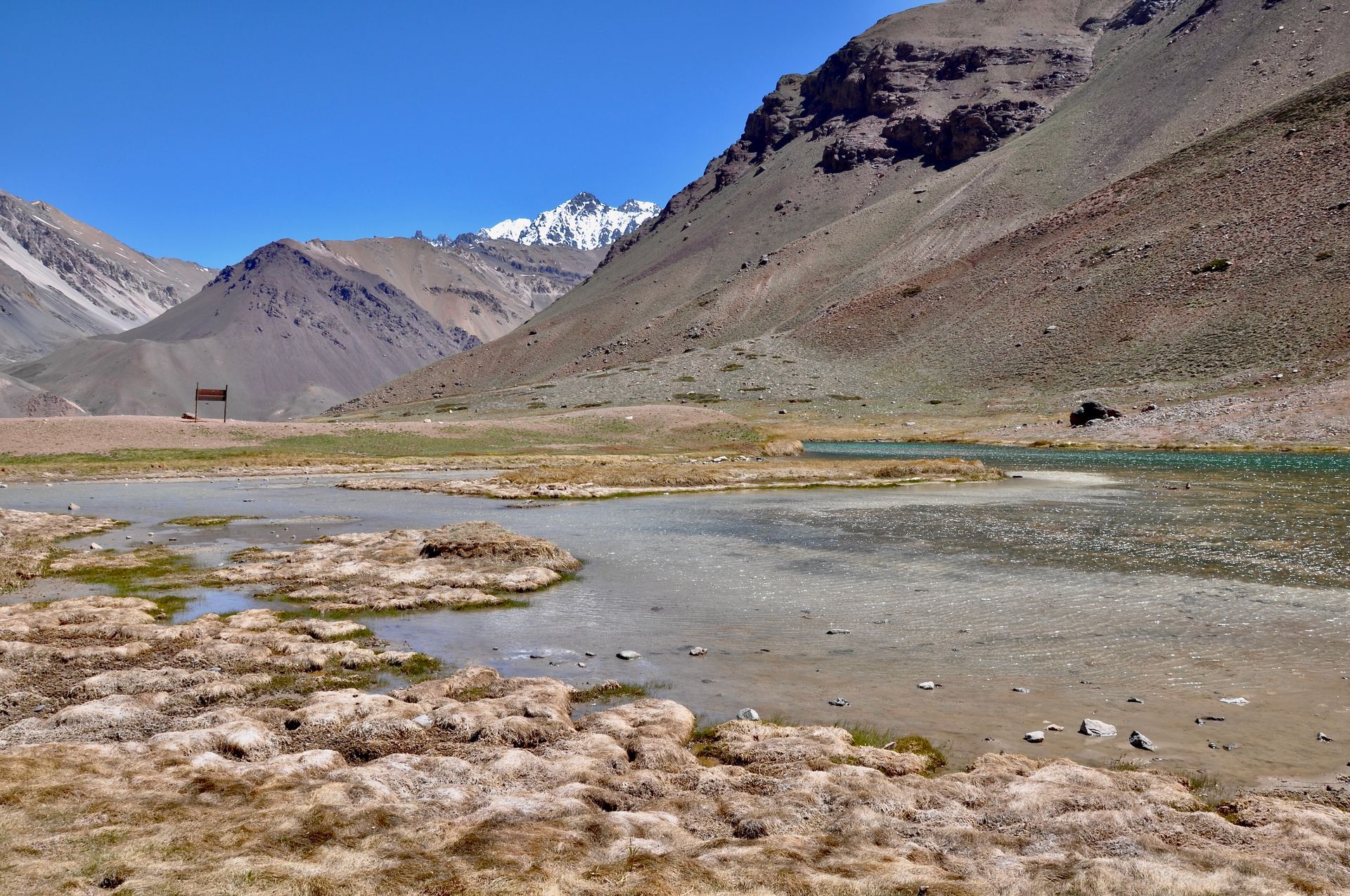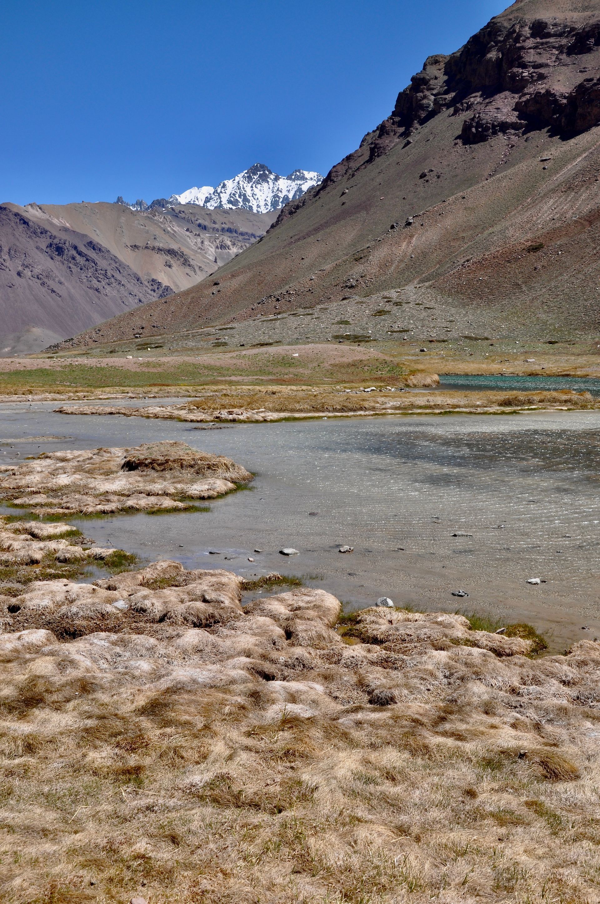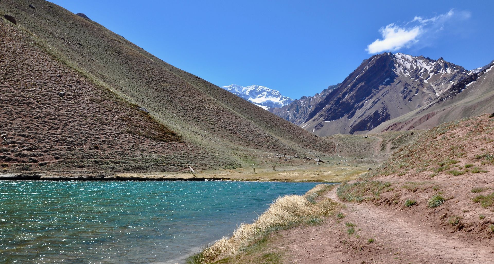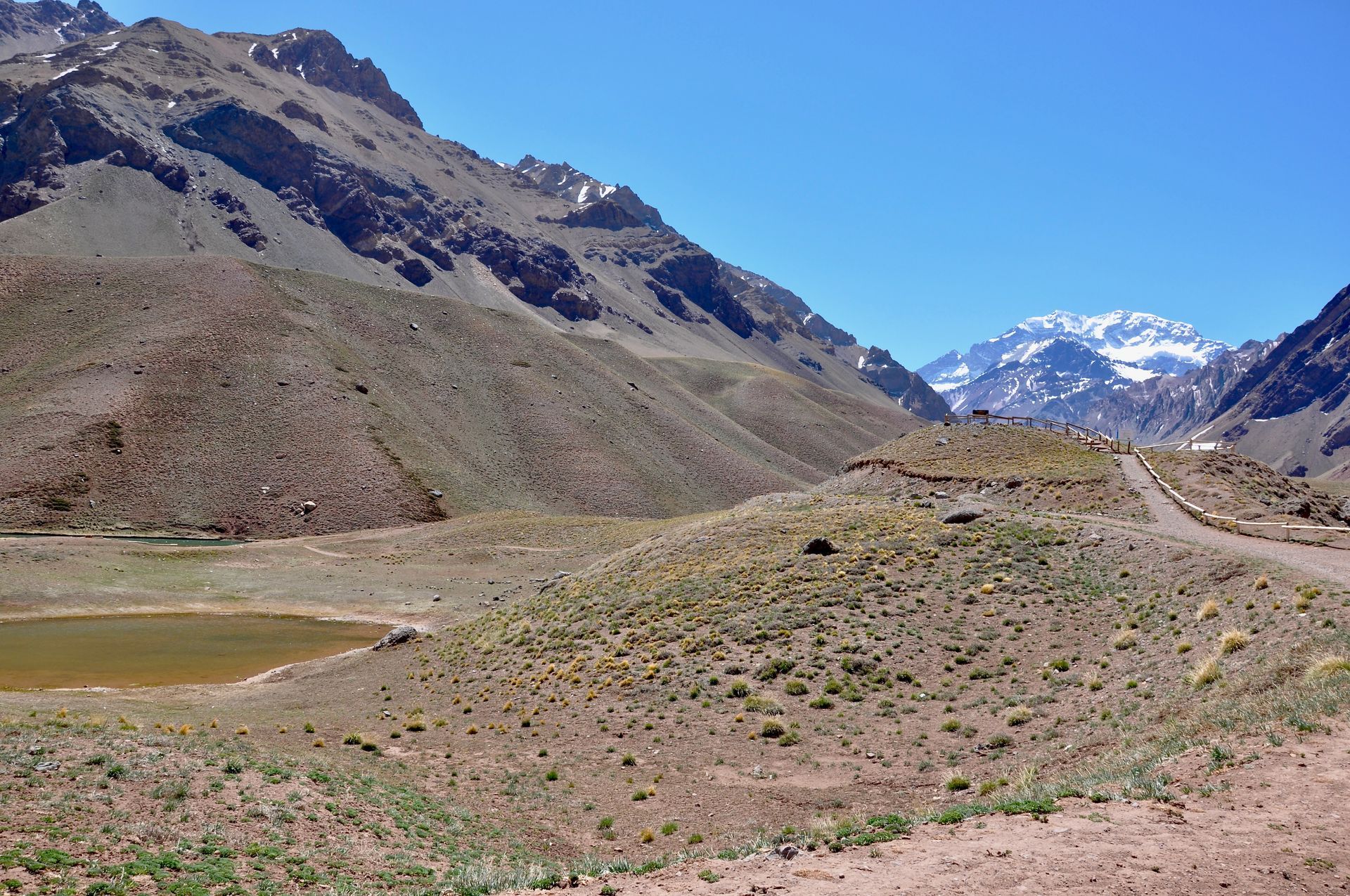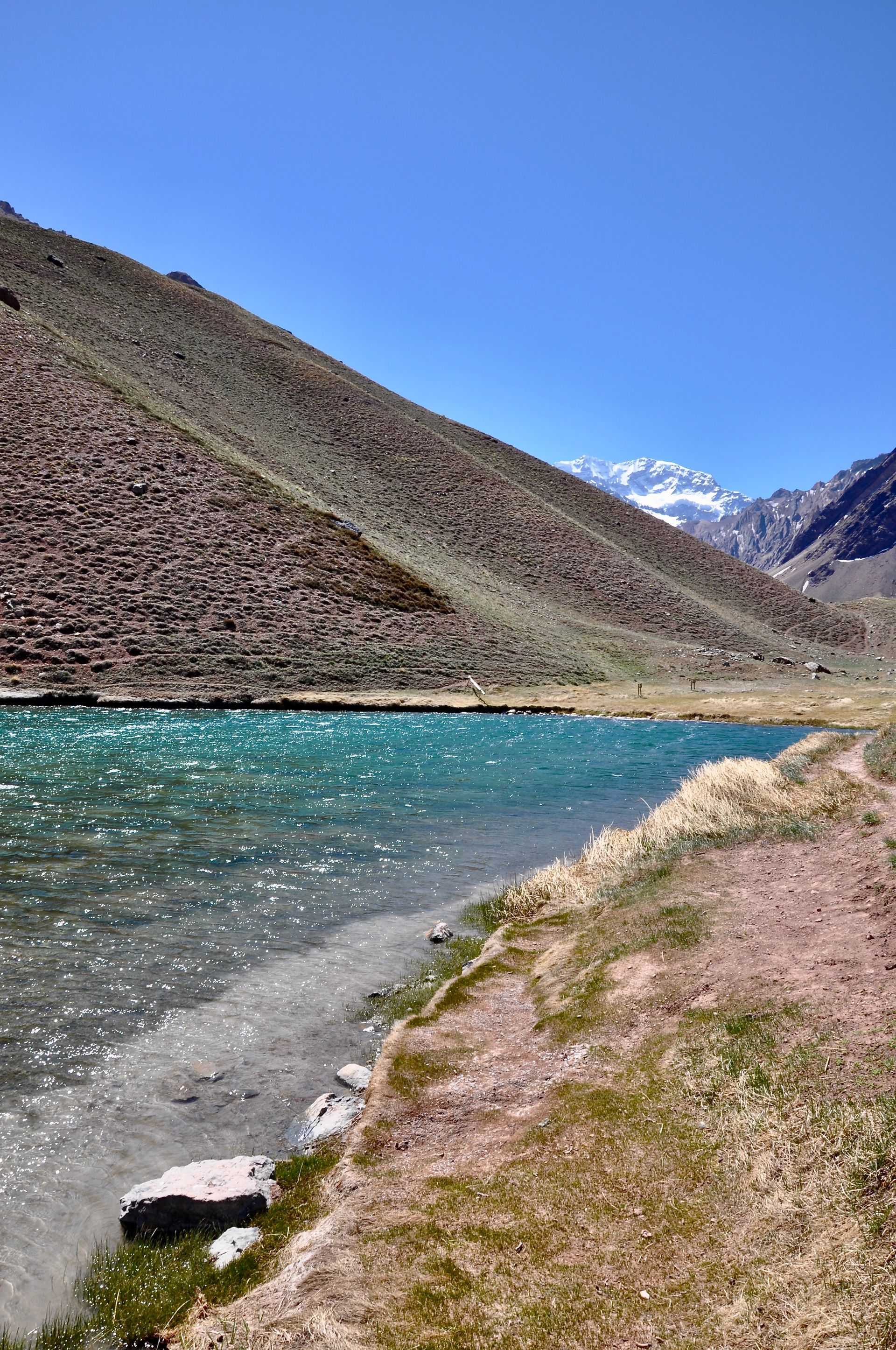 Der Parkplatz des Parque Provincial Aconcagua liegt nahe der Hauptverkehrsader. Von hier aus müssen wir uns per Pedes bewegen. Das geht nicht ganz so schnell, wir befinden uns nicht weit entfernt von der 3.000 Meter Marke und die Strecke führt bergauf. Zuhause ständen wir beinahe schon auf dem Gipfel der Zugspitze. Nachdem wir die zwar nicht allzu heftige, jedoch atemraubende Steigung hinter uns gebracht haben, beginnt ein zwei Kilometer langer Rundkurs, der uns an der Laguna Espejo und der Laguna de Horcones entlangführt und am Wendepunkt mit einem nicht weniger atemberaubenden Blick auf den Giganten bei bestem Wetter belohnt. Wir sehen die Südseite des Berges und die Seraks, Gletscher, die 300 Meter hoch sind. Von hier unten kann ich mir diese Größe kaum vorstellen. Dieses Panorama finde ich überwältigend.