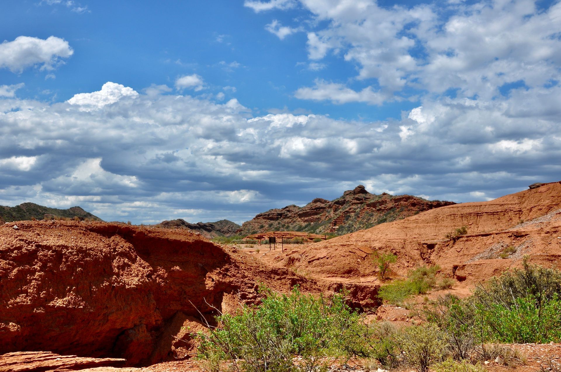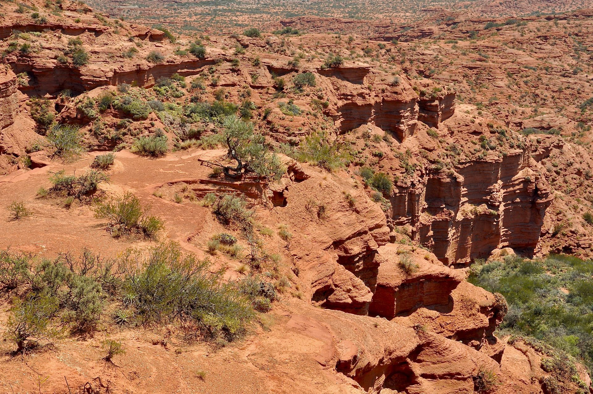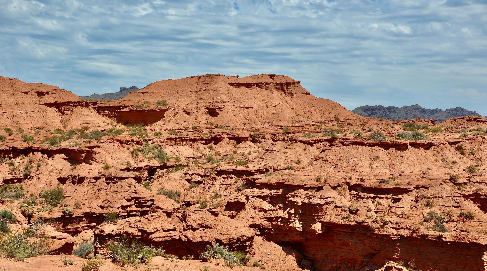 Die Strecke führt uns über kaum befahrene Straßen durch eine gänzlich andere Landschaft. Alles wird trockener. Nach einiger Zeit folgt die Abzweigung zum Parque Nacional Sierra de las Quijadas. Für uns bedeutet dies zwar einen Umweg, den wir aber gerne in Kauf nehmen. Dieser Park ist wenig besucht, zu weit abseits liegt er und für die nächste Unterkunftsmöglichkeit muss man eine größere Distanz zurücklegen. Umso mehr wundert es mich, ein kleines, jedoch sehr neues Besucherzentrum vorzufinden. Wir sind die einzigen Besucher. Der Parque Nacional Sierra de las Quijadas wird geologisch dem Parque Nacional Talampaya, den wir vor zwei Jahren besucht haben, zugeordnet. Er ist ein Kleinod und die rote, nur mit dem Grün der spärlichen Pflanzen versetzte Landschaft ist ein weiterer Kontrast zu allem Gesehenen auf der diesjährigen Route.