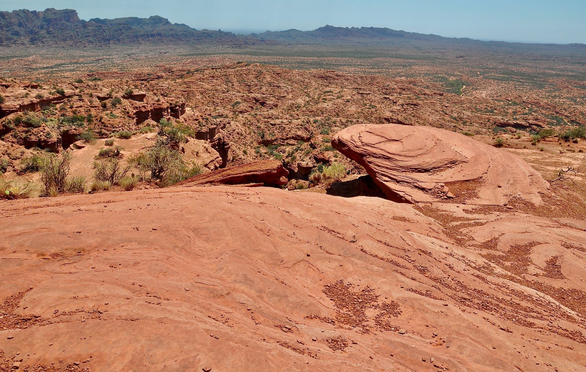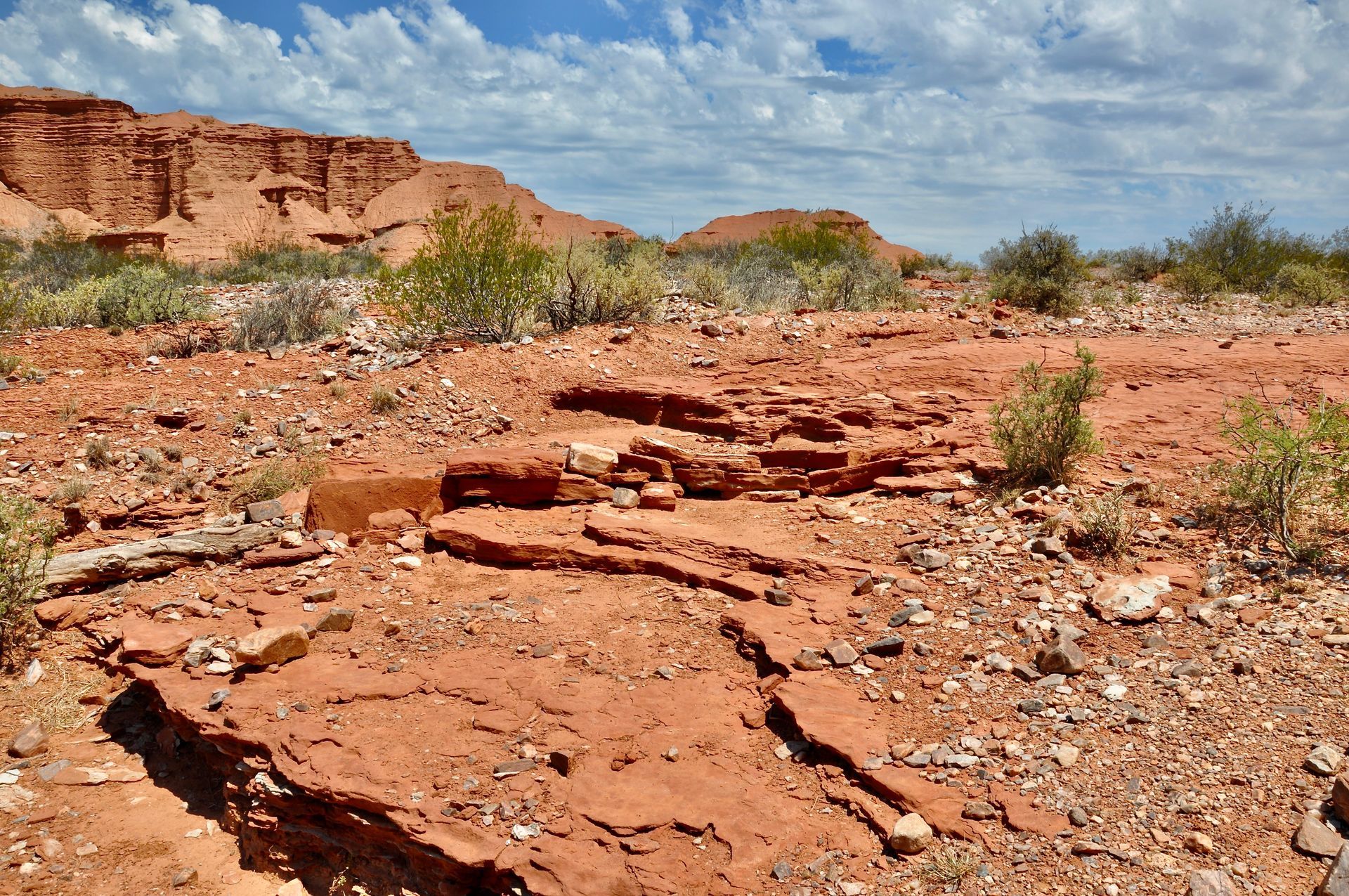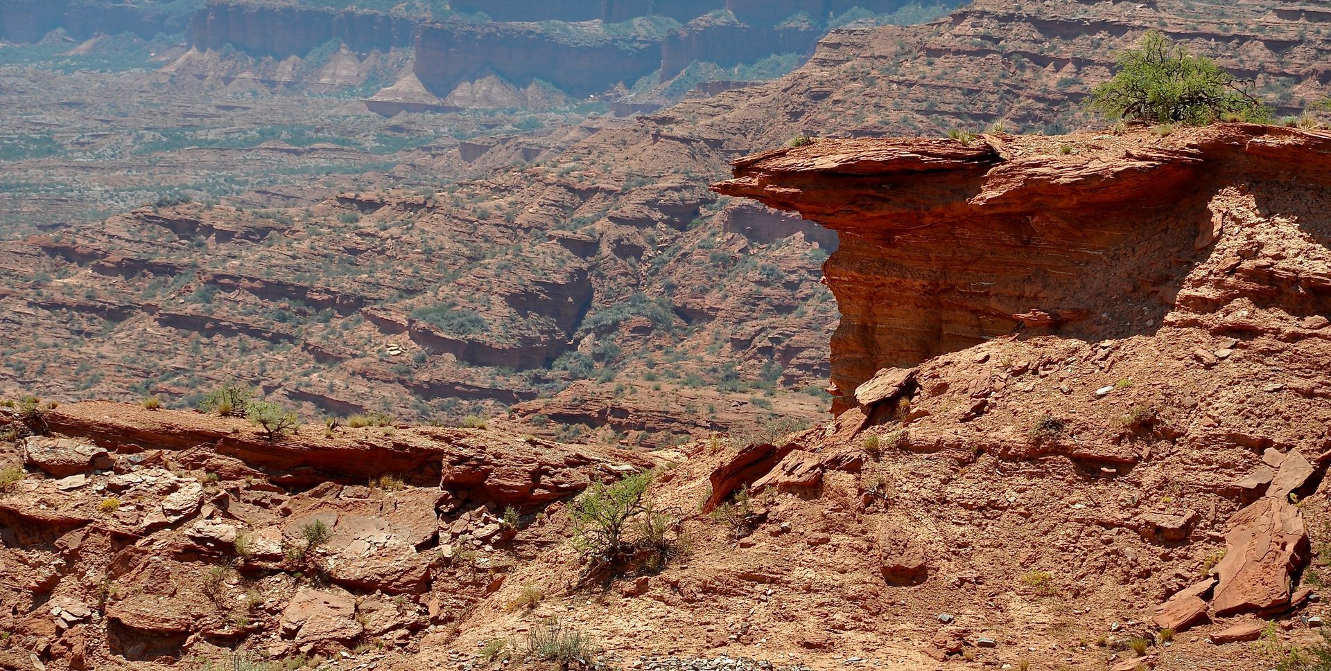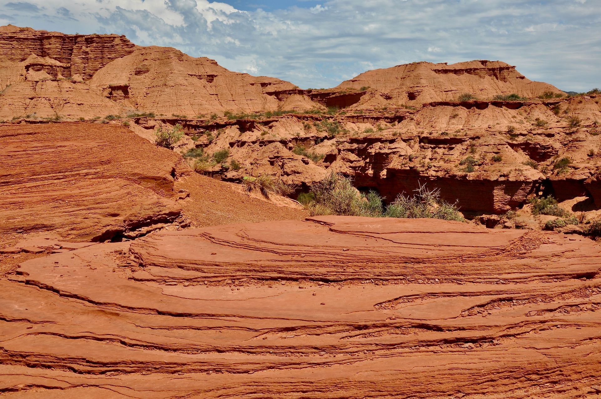 Die Strecke führt uns über kaum befahrene Straßen durch eine gänzlich andere Landschaft. Alles wird trockener. Nach einiger Zeit folgt die Abzweigung zum Parque Nacional Sierra de las Quijadas. Für uns bedeutet dies zwar einen Umweg, den wir aber gerne in Kauf nehmen. Dieser Park ist wenig besucht, zu weit abseits liegt er und für die nächste Unterkunftsmöglichkeit muss man eine größere Distanz zurücklegen. Umso mehr wundert es mich, ein kleines, jedoch sehr neues Besucherzentrum vorzufinden. Wir sind die einzigen Besucher. Der Parque Nacional Sierra de las Quijadas wird geologisch dem Parque Nacional Talampaya, den wir vor zwei Jahren besucht haben, zugeordnet. Er ist ein Kleinod und die rote, nur mit dem Grün der spärlichen Pflanzen versetzte Landschaft ist ein weiterer Kontrast zu allem Gesehenen auf der diesjährigen Route.
