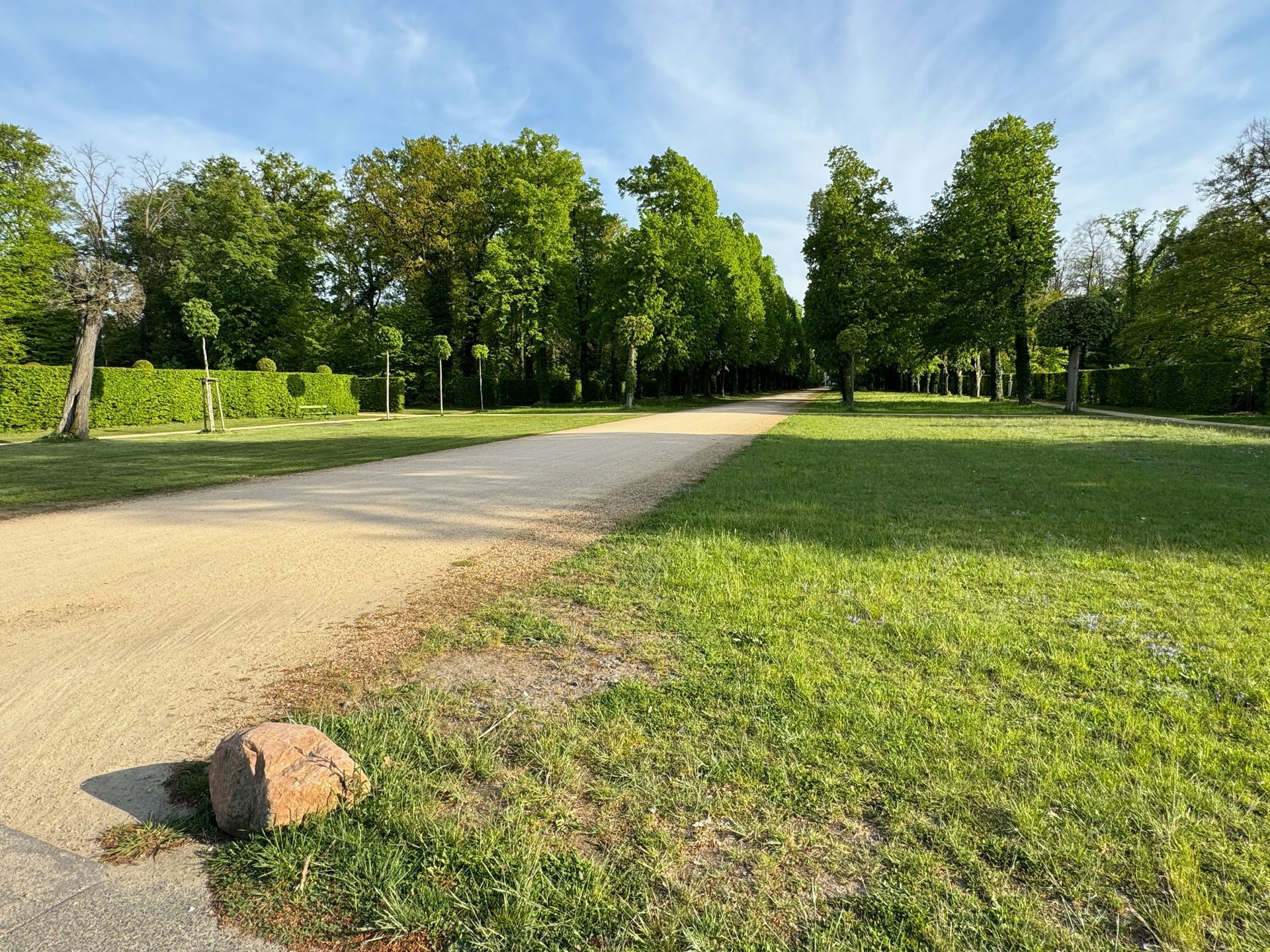 Unser Weg führt uns anschließend an der Mühle vorbei zum Orangerieschloss, das derzeit wegen Restaurierungsarbeiten geschlossen ist. Die Dichte an Schlössern und ähnlichen Bauten in diesem Park beeindruckt mich sehr.