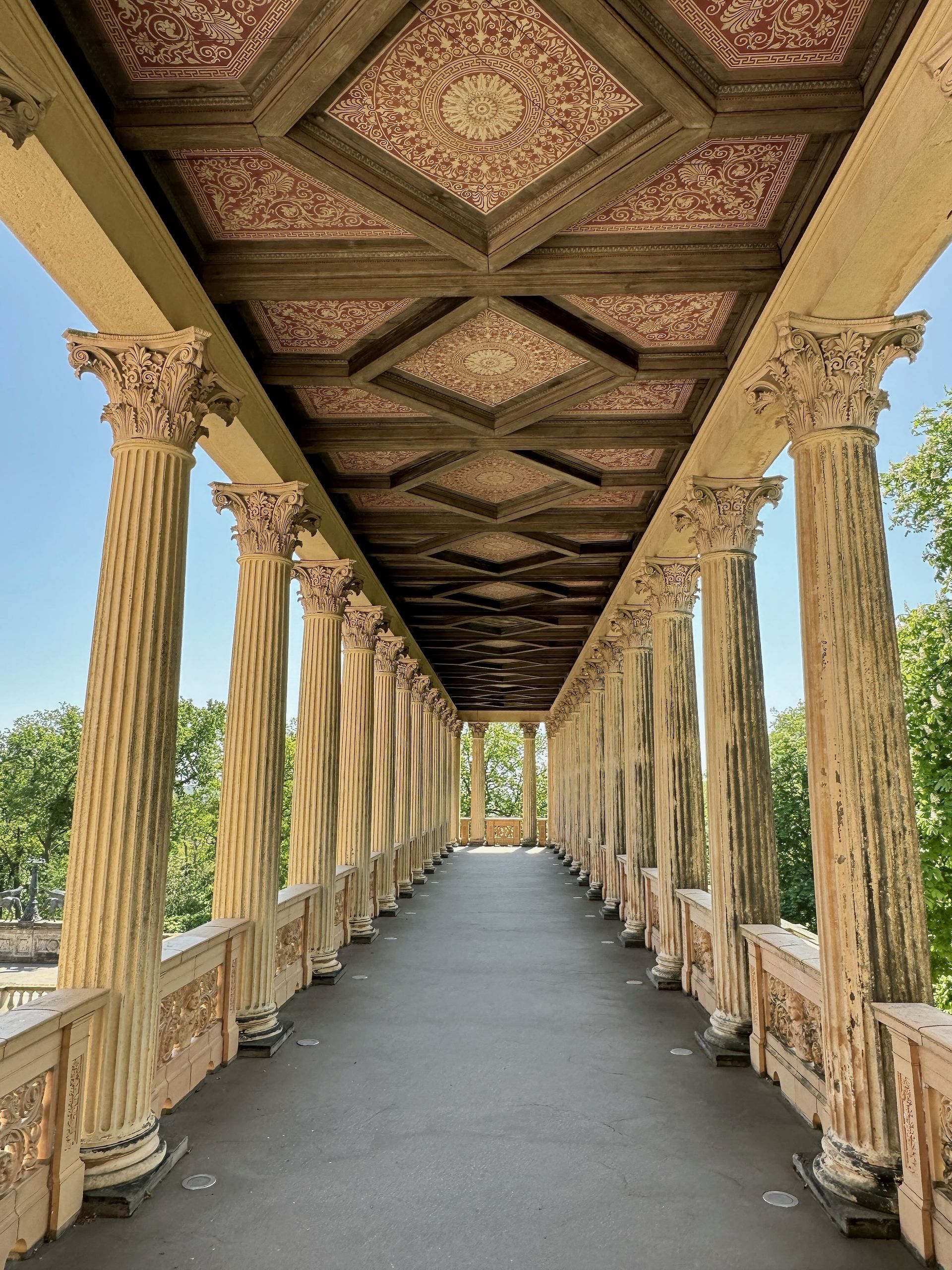 Mit einem Gebäude wie Belvedere auf dem Pfingstberg hatten wir in Deutschland so gar nicht gerechnet, vielleicht mag das naiv klingen, aber so ist es. Wir fühlen uns ein klitzekleinwenig an Andalusien und Italien erinnert bei all den Säulen, Verzierungen und dem Wasserbecken im Innenhof. Von den obersten Plattformen bietet sich ein grandioser Blick über Potsdam und sein Umland mit all dem Grün und seinen vielen Seen.