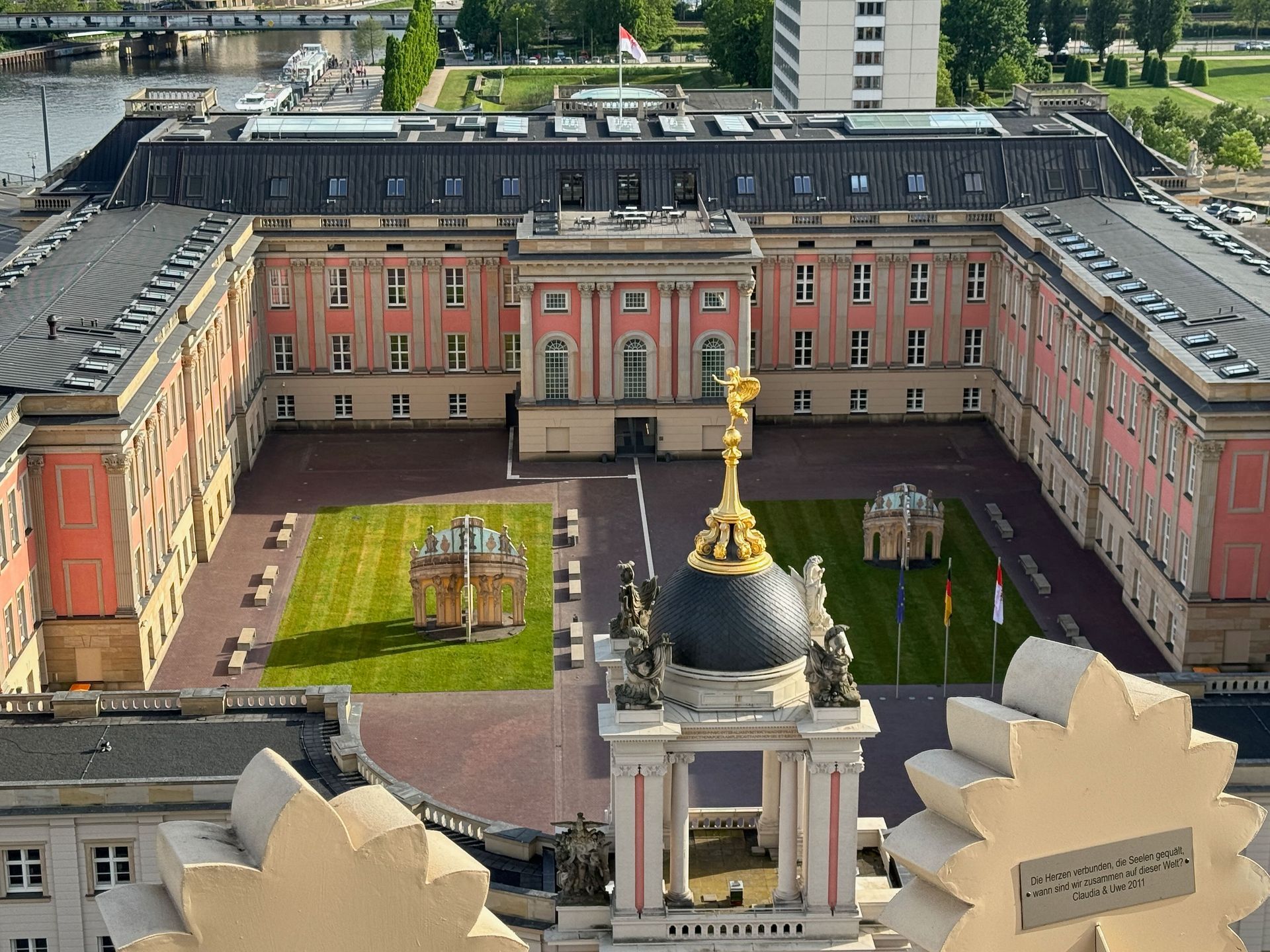Als allerletzte Besucherin des heutigen Tages darf ich noch die mehr als 200 Stufen erklimmen, die zum Kolonnadengang führen, währenddessen mein Mann unten auf dem Platz geduldig auf mich wartet. Von hier oben habe ich einen wunderbaren Blick über das so schöne Potsdam.