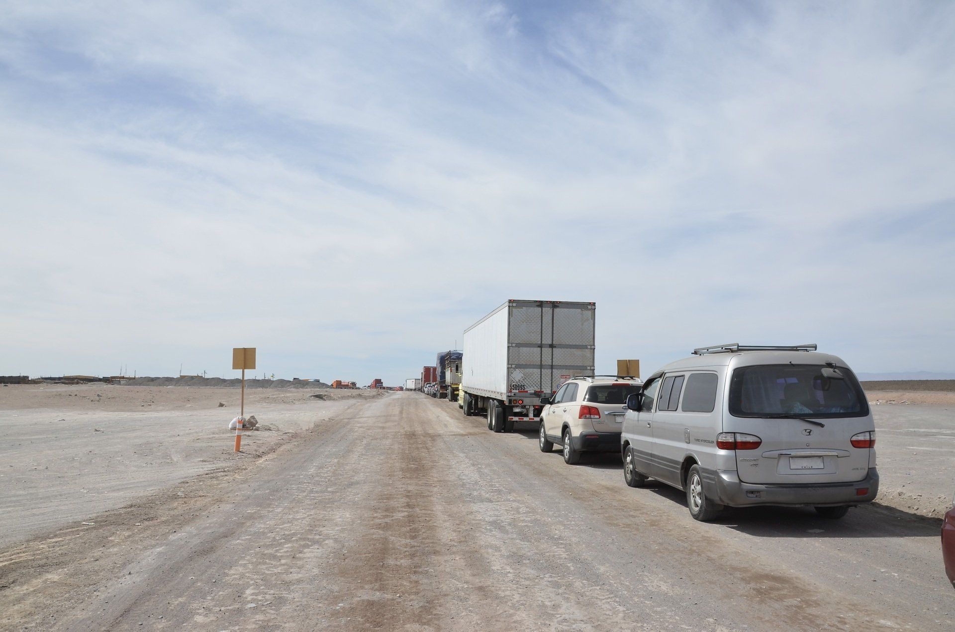 Zu allem Überfluss stellen wir in der Nähe von Cuyo fest, dass mal eben für Bauarbeiten und Sprengungen die Panamericana für mehrere Stunden gesperrt ist. So reihen wir uns in die immer länger werdende Schlange von Wartenden ein. Wir sind genervt, weil uns niemand, den wir fragen, sagen kann, wann die Panamericana wieder geöffnet wird. Umfahren geht hier auf mehreren Hundert Kilometern nicht, also bleibt uns nichts anderes übrig, als uns in Geduld zu üben. Nach über zwei Stunden, es ist mittlerweile schon kurz nach 17:00 Uhr, wird die Strecke wieder freigegeben. Die Chilenen fahren nicht gemäß ihrer Position in der Schlange los, sondern jeder rennt so schnell es geht zu seinem Wagen, springt rein und alle liefern sich ein Rennen, bei dem es scheinbar um jeden einzelnen Platz geht, irgendwann kommt dann natürlich auch der Gegenverkehr von der anderen Seite. Zu allem Überfluss gibt es keinerlei Sicherung zum steilen Abgrund. Wir hoffen nur, dass wir bei diesem irrsinnigen Fahrstil hier wieder heil herauskommen, was uns dann zum Glück auch gelingt.