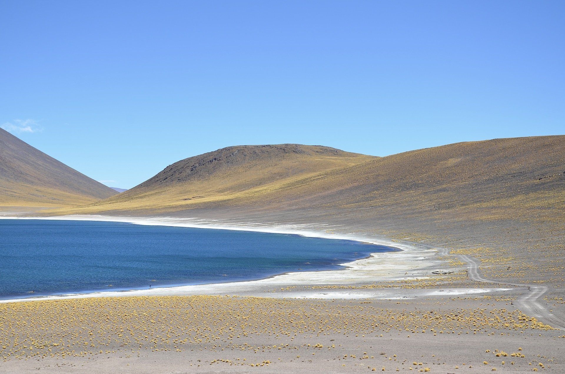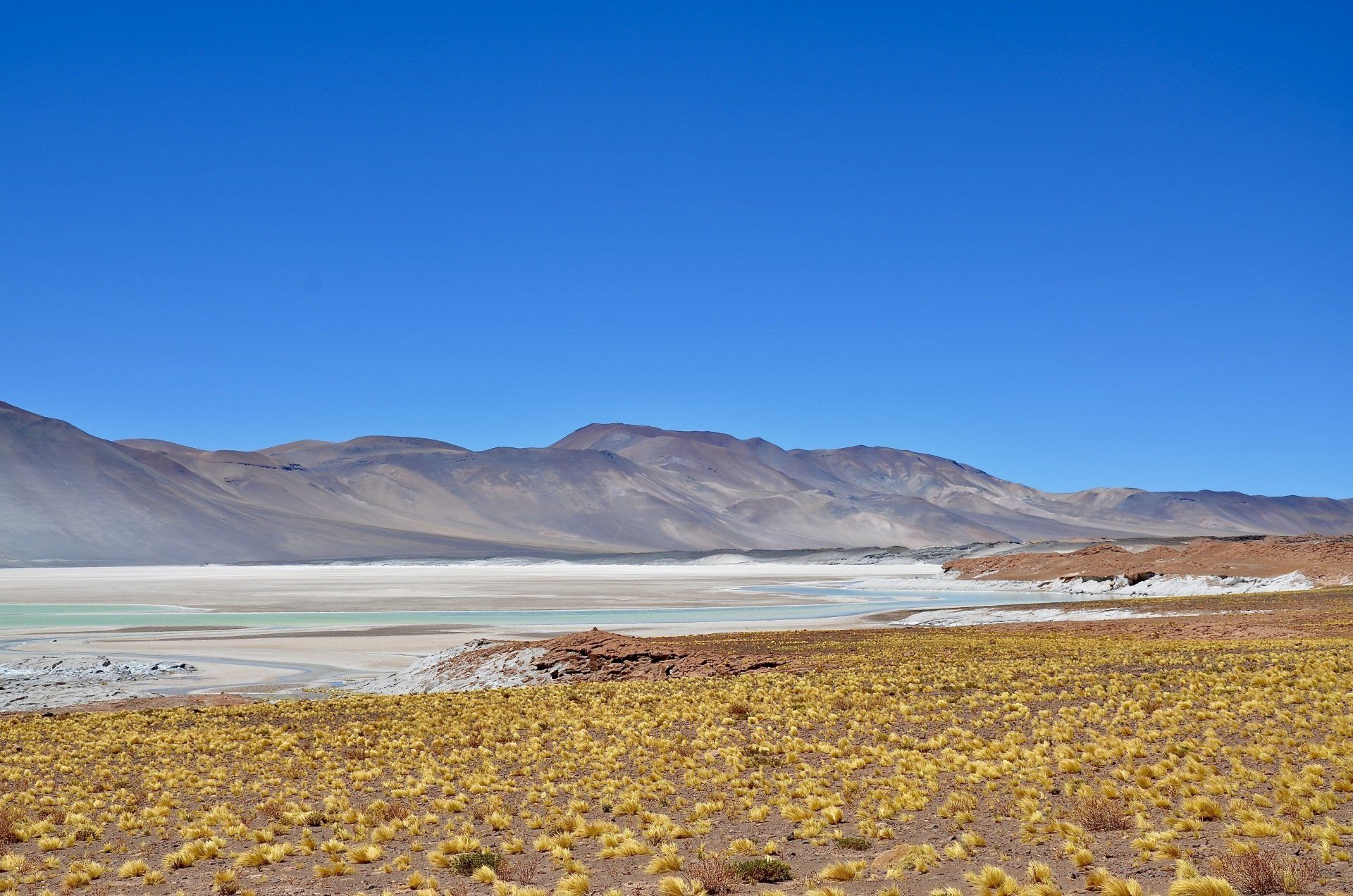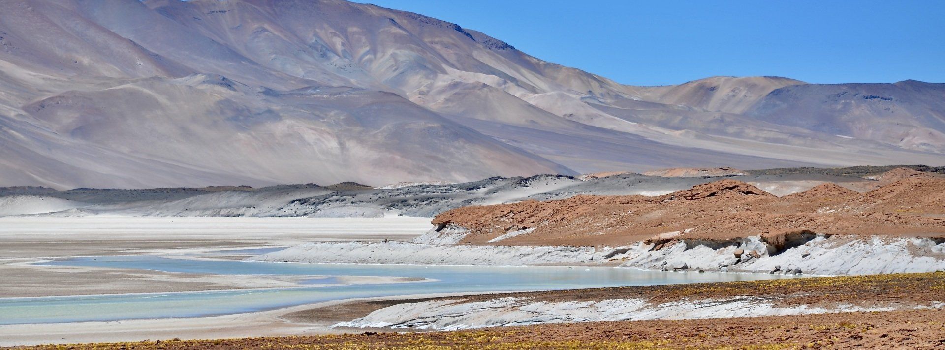 Wir fahren die Straße weiter bis zur Lagune, das letzte Stück muss man zu Fuß über rote Felsen gehen. Es ist phantastisch, diese roten Felsen (Piedras Rojas), dahinter die türkisfarbene Lagune, die an den Rändern in den unterschiedlichsten Farbnuancen von Türkis schimmert. Gleichzeitig bilden Wellen weiße Schaumkronen, die das Eis umspülen, das sich ebenfalls am Ufer findet. Im Hintergrund Vulkane, Berge und Steppe in den verschiedensten Erdtönen und über der Lagune fliegen Flamingos. Es ist spektakulär! Ich darf gar nicht daran denken, wie lange es diese Landschaften noch geben wird, denn in der Atacama liegen einige der weltweit größten Vorkommen von Lithium, das für unseren Wohlstand in Form von Batterien und Akkus in Smartphones, E-Autos und dergleichen benötigt wird.
