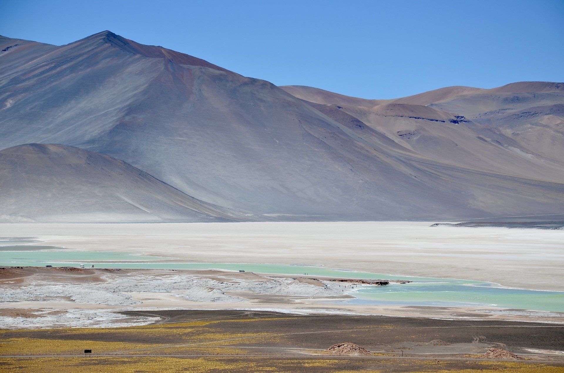 Irgendwann hört der Asphalt auf, aber die nun folgende Schotterstraße ist recht gut zu befahren. Seit einiger Zeit befinden wir uns bereits oberhalb von 4.000 Metern. Wir fahren um eine Kurve und blicken vor uns in ein Tal auf den Salar de Aguas Calientes oder auch Salar de Talar genannt. Bei diesem Anblick verschlägt es uns die Sprache, ich kann es nicht in Worte fassen, das ist wieder einer dieser Momente, die man selbst erlebt haben muss, auch Bilder können dies nur annähernd wieder geben. Scheinbar, so stellen wir fest, haben dieses Gebiet auch die Tourveranstalter aus San Pedro de Atacama mittlerweile für sich entdeckt. Zum Glück ist diese Gegend aber noch nicht überlaufen.