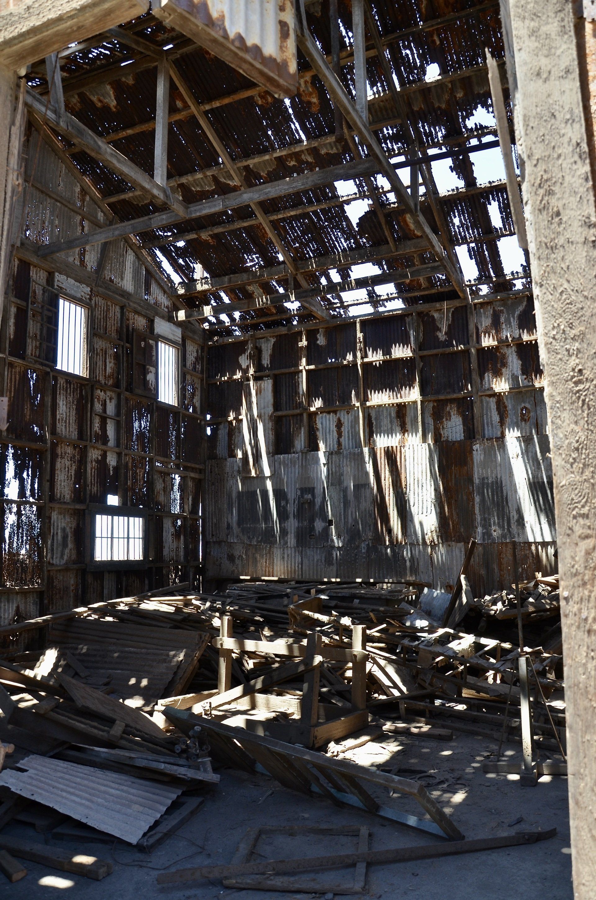 Die Förderanlagen haben aber ebenfalls eine beträchtliche Größe. Nachdem dann jedoch plötzlich ein starker Wind aufkommt und verschiedene Teile verdächtig versuchen, Halt zu finden, wir der Sache aber nicht ganz trauen, da auf dem Boden verstreut bereits Einzelteile herumliegen, entscheiden wir uns, einen größeren Abstand zu halten. Dies erweist sich als gute Entscheidung, denn nicht weit von uns entfernt, fällt ein größeres Teil vom Dach ab.