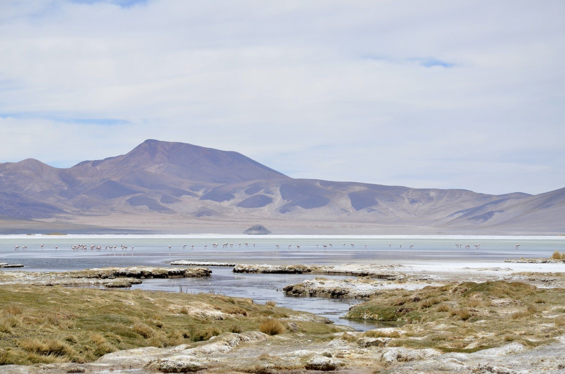 Die Strecke ist aber auch im nun folgenden Streckenabschnitt sehr gut zu befahren und wir finden den Salar – dieser sieht wieder ganz anders aus, als alle anderen Salare, die wir bisher gesehen haben und auch dieser ist einfach nur traumhaft. Das Wasser nimmt je nach Fahrtrichtung und Sonneneinstrahlung eine andere Farbe an. An den Ufern grasen Lamas mit bunten Bändern, dazwischen sehen wir Nandus und vereinzelt auch Vicuñas. In der Lagune sehen wir mindestens zwei verschiedene Arten Flamingos. Es ist zumeist windstill und aufgrund der intensiven Sonneneinstrahlung so angenehm warm, dass wir keine Jacke benötigen, obwohl die Temperaturanzeige etwas anderes verkündet.