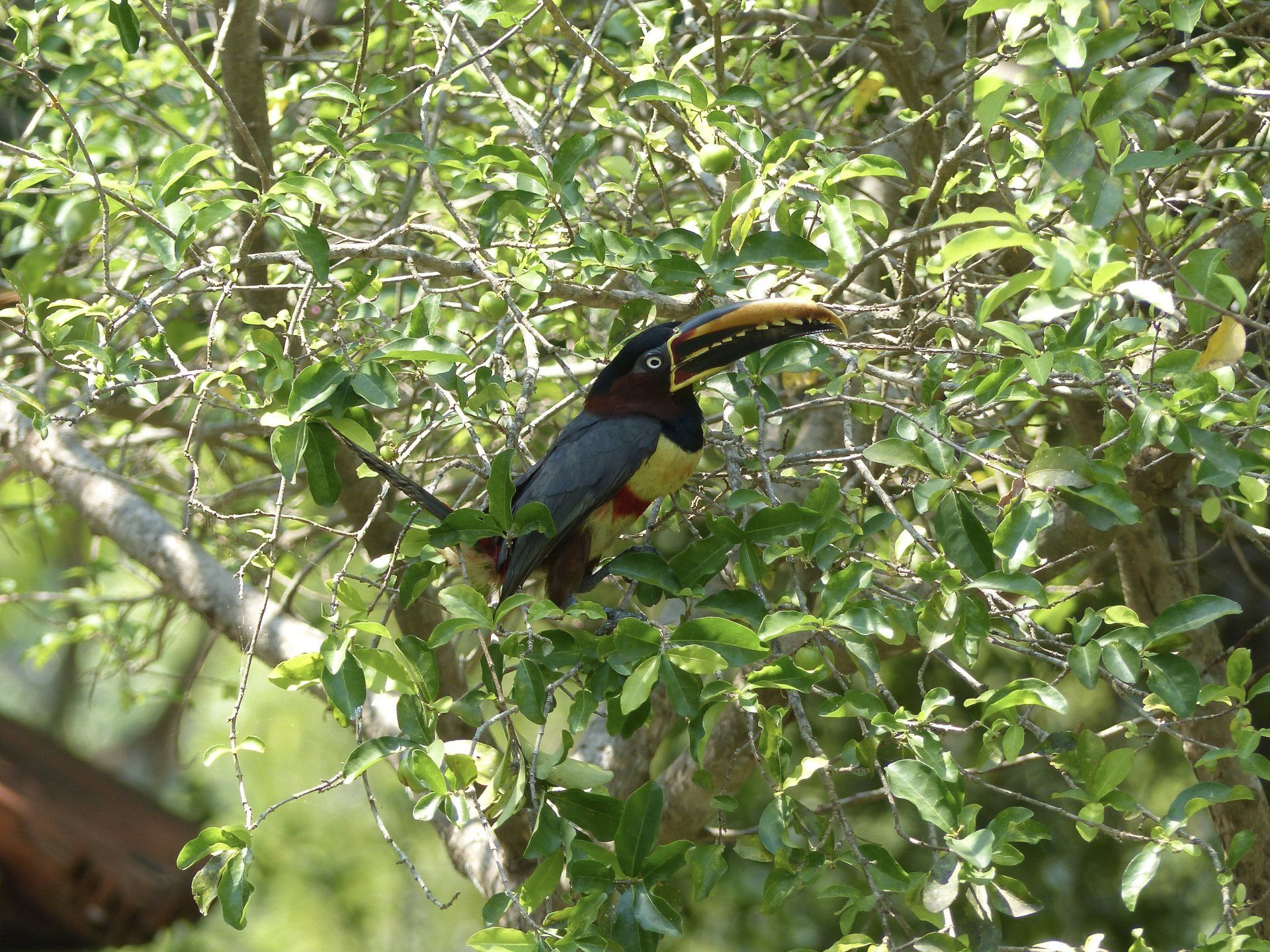 Tierbeobachtungen sind nichts für bekennende Langschläfer wie mich. Ich war immer eine Eule und werde immer eine bleiben. Aber auf diesen Reisen lebe ich, zugegebenermaßen mit großer Überwindung, gegen meinen Biorhythmus. Frühstück gibt es heute laut Adi allerdings erst später, da nahezu allen (bis auf uns) die lange Anreise noch in den Knochen steckt. So sitzen wir also erst um 06:30 Uhr (!) beim Frühstück. Um 07:00 Uhr sind wir dann startklar für unsere Fußsafari. Es sind bereits schon jetzt mehr als dreißig Grad Celsius und die Sonne brennt vom Himmel. Die Belohnung für den Fußmarsch in dieser Hitze erhalten wir in Form von vielen Vögeln, einer Landschildkröte, einem Krallenäffchen mit winzig kleinem Baby und einem Aguti. Gegen 09:00 Uhr sind wir wieder zurück.
