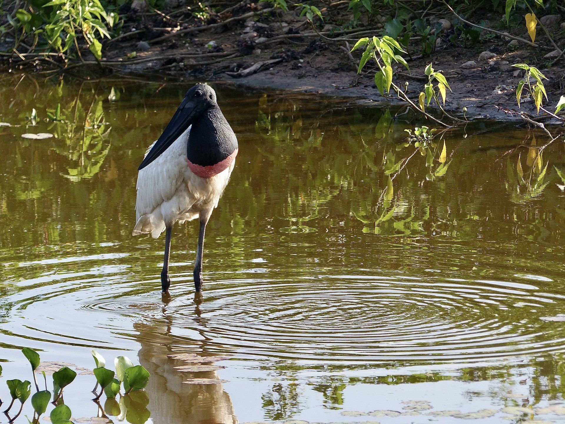 … aber dann passiert etwas für uns ganz Spektakuläres. Ich glaube, mein Mann und ich sehen es zuerst. Da es dermaßen unwahrscheinlich ist, diese Sichtung in diesem Gebiet, schaue ich auf die Wasserpflanzen und denke noch, so als sei es der hundertste Vogel der gleichen Art, den wir in den letzten 30 Minuten gesehen haben, Jaguar … dann dauert es einen Moment und ich realisiere, Jaguar! Mein Mann sieht ihn gleichzeitig, dann etwas später auch Adi, der alle anderen, die ihn bisher noch nicht erblickt haben, darauf aufmerksam macht.
