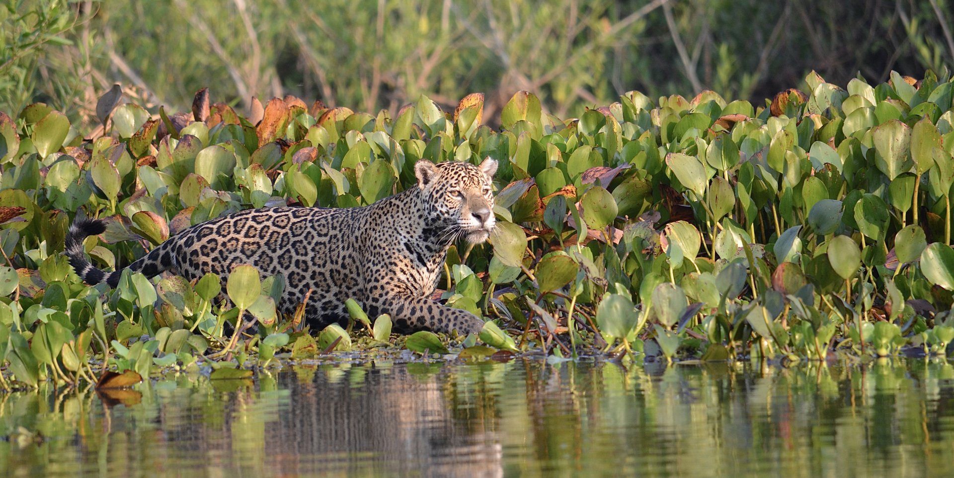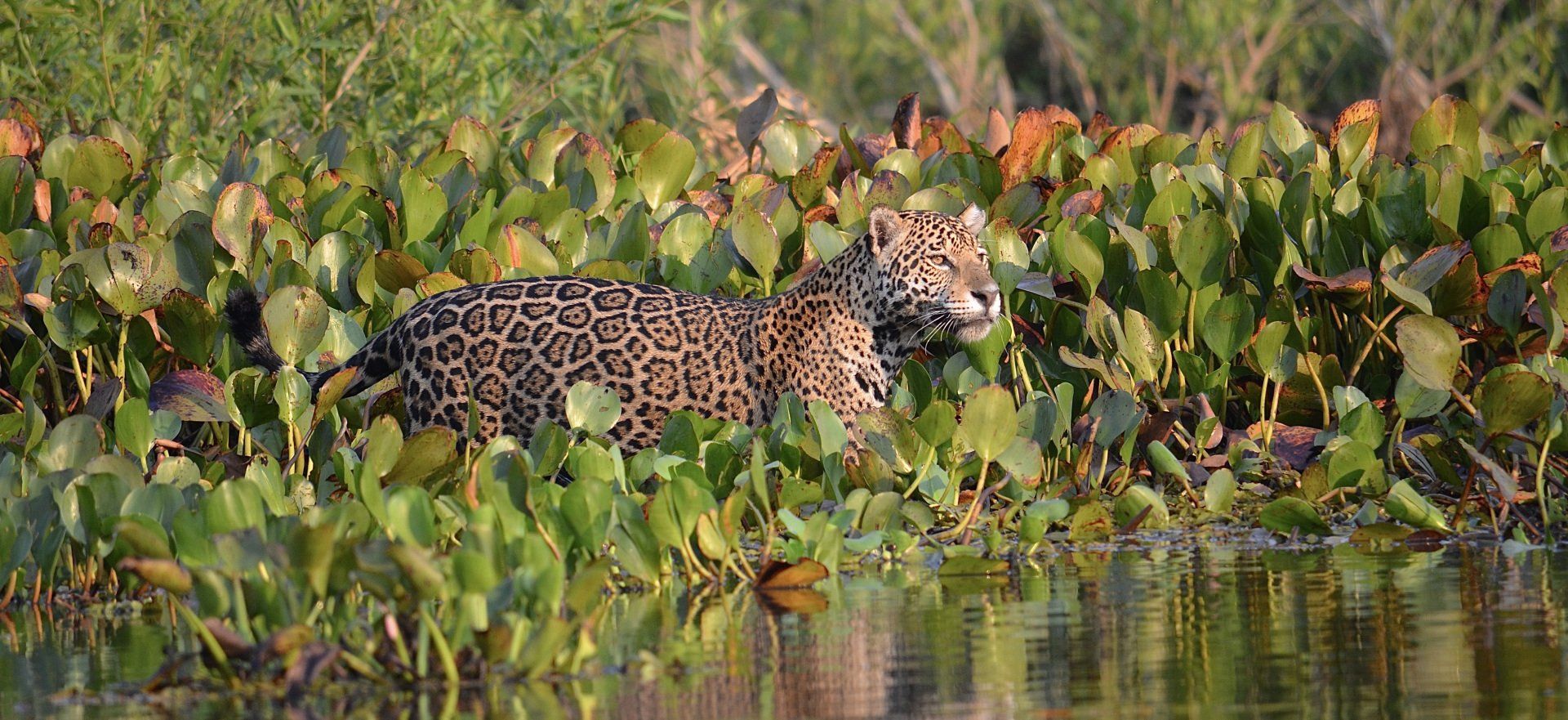 Es ist unglaublich, unbeschreiblich, grandios. Unser erster Jaguar. Es ist ein Weibchen und das absolut Perfekte ist zudem die Szenerie. Ein Morgenlicht, das nicht besser sein könnte und dieses Jaguar Weibchen inmitten der schwimmenden grünen Wasserhyazinthen. Sie schaut sogar einmal kurz in die Kamera, dann steht sie auf, wir sind nicht mehr von Interesse, und pirscht sich langsam über den schwimmenden Untergrund an … dann entdecken auch wir das potenzielle Opfer, ein Wasserschwein. Das Wasserschwein entwischt ihr zwar, aber wir können noch eine ganze Weile das Jaguar Weibchen in dem besten aller Morgenlichter genießen. Wir sind sprachlos. Wir haben gehofft, dass wir in Porto Jofre Jaguare sehen werden, aber nicht hier. Was sind wir heute für Glückskinder!