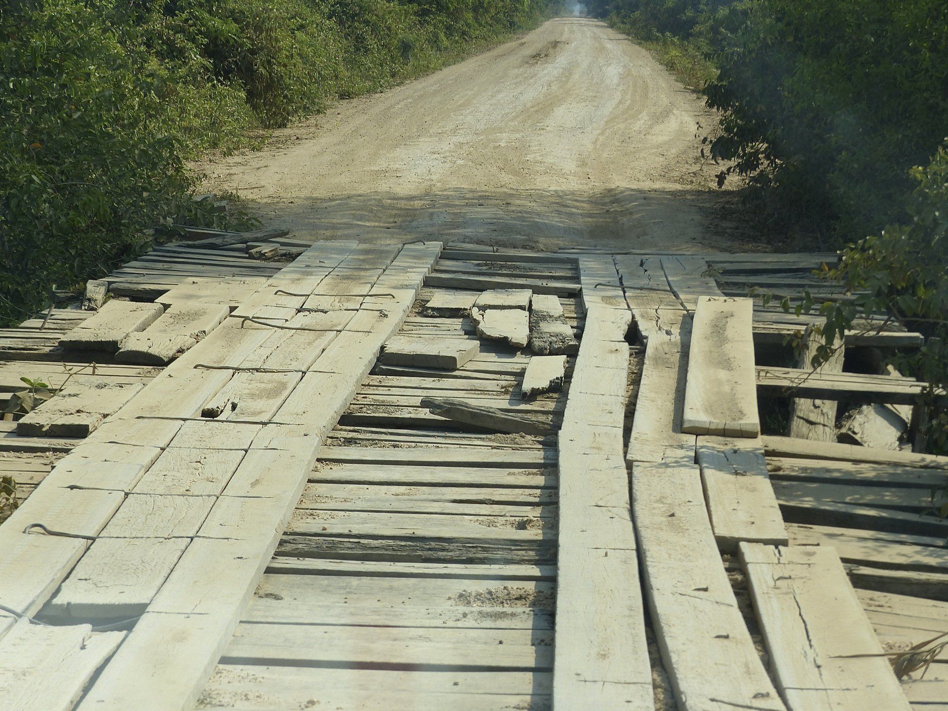 Kurz nach dem Mittagessen fahren wir los. Vor uns liegen 110 km sandige Piste, die merklich schlechter wird, ebenso auch die baufälligen Brücken. Bei vielen dieser Brücken fehlen Bretter, immer wieder hoffen wir, dass diese jetzt und auch später auf der Rückfahrt unser Auto tragen. Nahezu jede dieser Brücken wäre bei uns zuhause höchstwahrscheinlich auch für Fußgänger gesperrt, erst recht, wenn unter diesen die Kaimane warten.