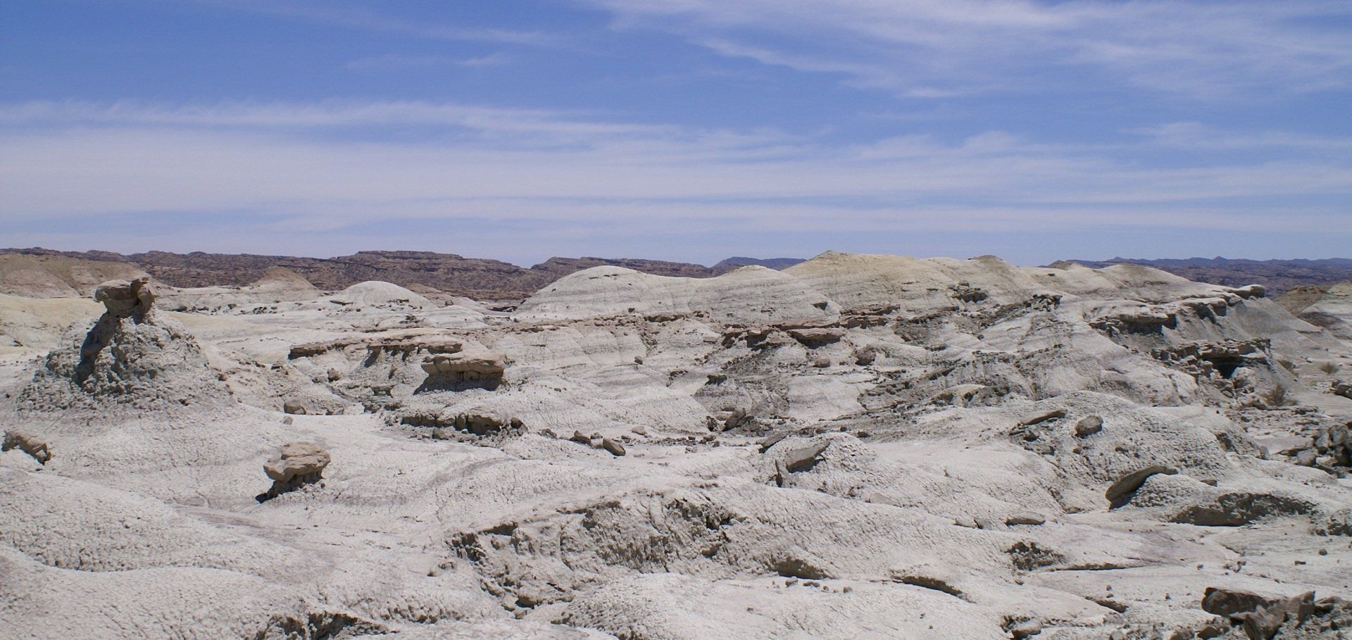 Blickt man von diesem Punkt in die andere Richtung, erhebt sich hinter dem eher hellen, weiß-gräulichen Gebiet mit seinen skurrilen Formationen die sattrote Sandsteinwand der Barrancas Coloradas, die ihre Fortsetzung weiter nördlich im Parque Nacional Talampaya findet. Aber das ist noch längst nicht alles bei diesem Stopp, auch eine von der Natur geschaffene Sphinx gibt es hier zu sehen.