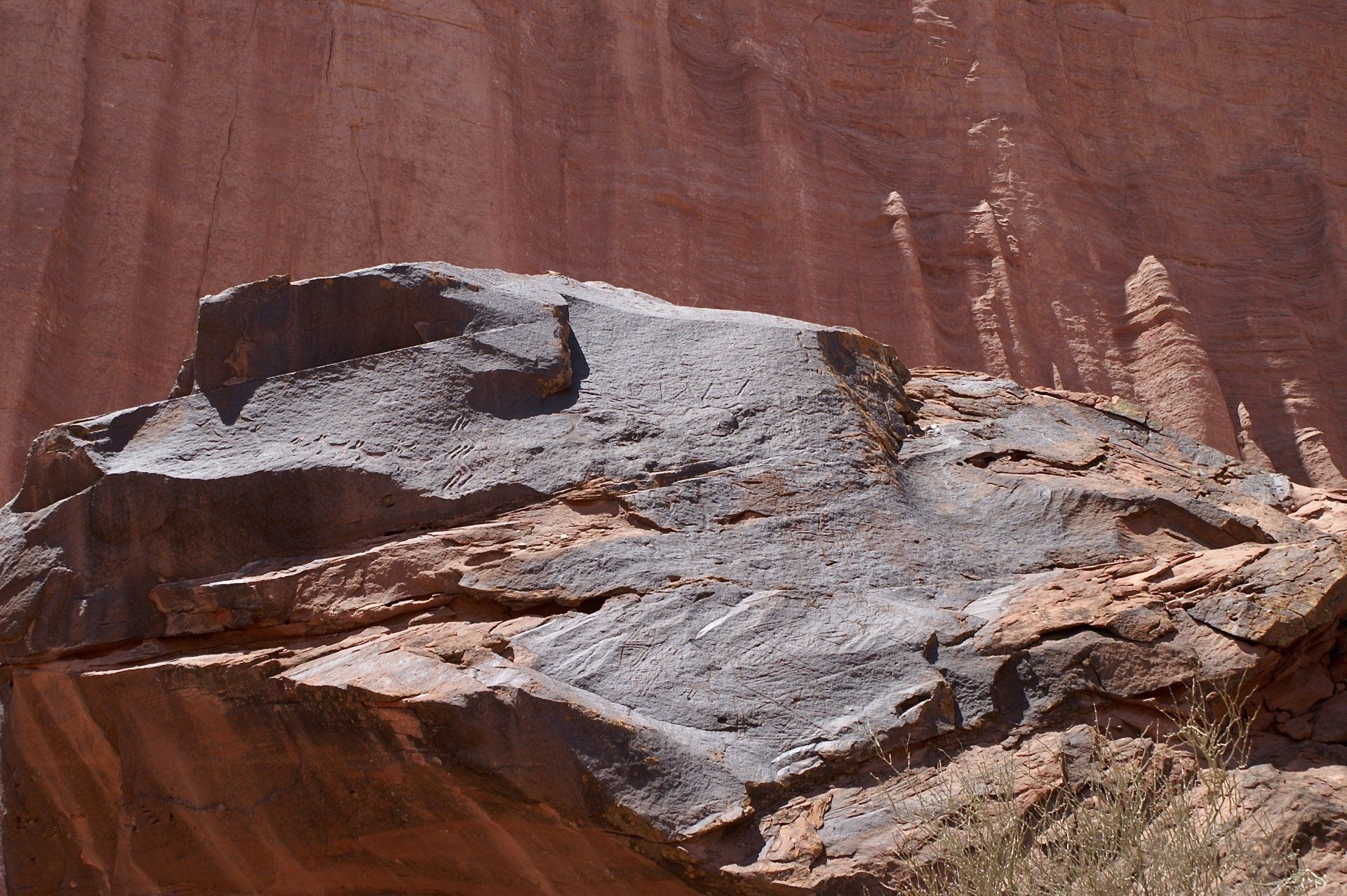Unsere Tour beinhaltet vier Stopps. Zuerst halten wir unterhalb einer hohen roten Sandsteinwand bei den Petroglifos. Wie der Name bereits sagt, gibt es eine Reihe von Petroglyphen zu sehen. Wir erfahren vom Guide, Schätzungen zufolge stammen die ersten aus etwa 500 v. C. Tatsächlich sind auf den Schautafeln zu den Petroglyphen einige Erklärungen auf Englisch. Der nächste Stopp führt uns zum Jardin Botánico, einem Garten, in dem unterhalb der allgegenwärtigen roten, zwischen 100 und 150 Meter hohen Sandsteinwände Pflanzen wachsen, denen Heilkräfte zugesprochen werden, auch der Chañar mit seiner gelbgrünen Rinde ist nicht zu übersehen. Hier am Felsen hinter dem Jardin Botánico befindet sich das Echo, eine senkrechte halbmondförmige Auskerbung inmitten der Wand aus Sandstein. Der dritte Stopp führt uns dann zur La Catedral, wohl das bekannteste Motiv, wenn man Bilder vom Parque Nacional Talampaya sieht. Die Piste führt entlang einer wunderschönen 400 Meter langen und 150 Meter hohen Felswand. Der vierte und letzte Stopp der Tour bringt uns zu einzeln stehenden Felsformationen, die passende Namen tragen, wie „El Monje“, der Mönch, „El Torre“, der Turm oder auch „El Tótem“.