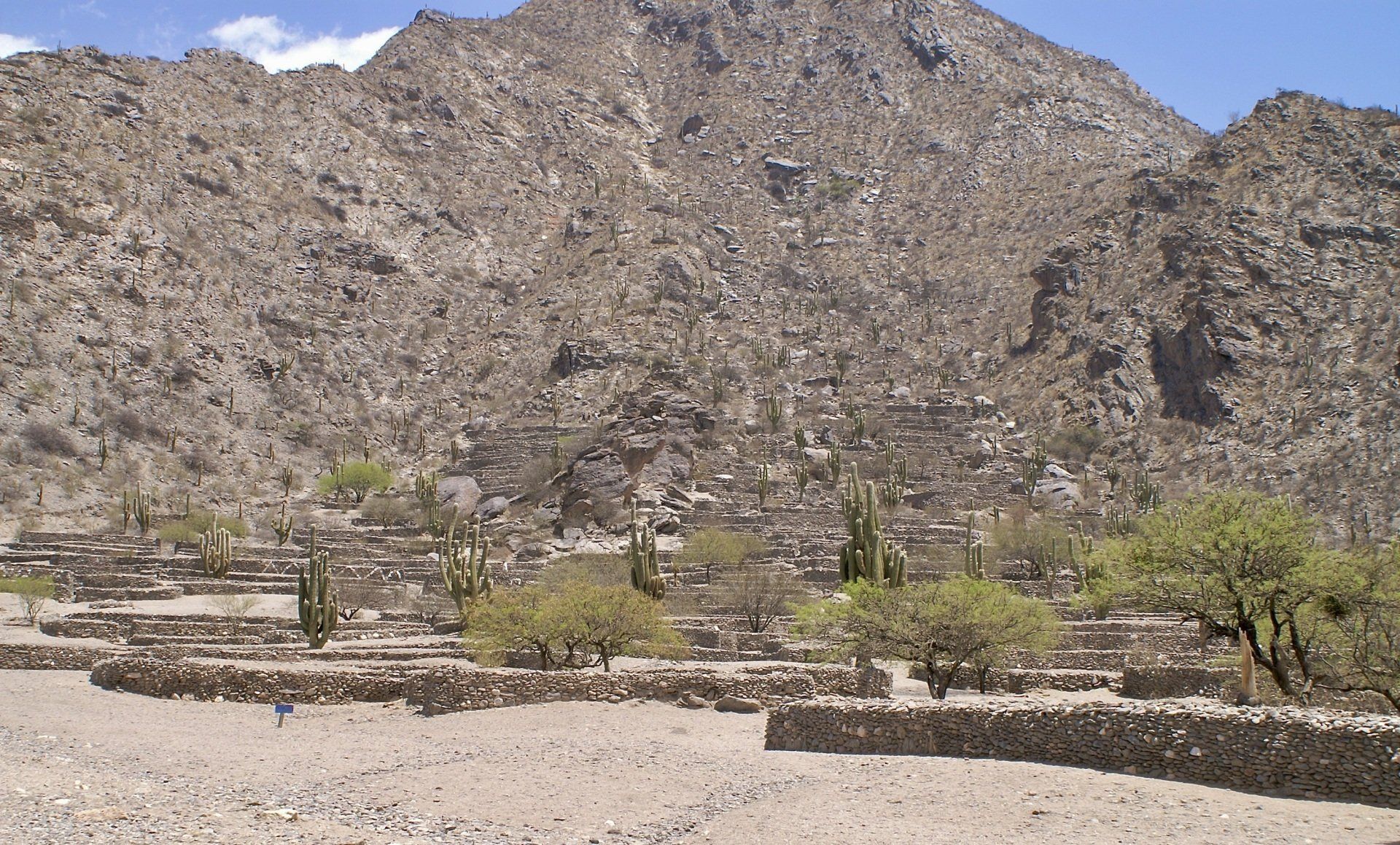 Im Ort Belén tanken wir. Das laut Reiseführer sehenswerte Museum hat jedoch geschlossen und so biegen wir kurz hinter Londres in einen Feldweg ab. Wir wollen zu den Ruinas Shincal. Es ist brüllend heiß, so heiß war es bisher auf der ganzen Tour noch nicht, die Geräusche aus den Büschen sind ohrenbetäubend. Wären wir nicht gerade mehr oder weniger von Staub umgeben, würde ich meinen, wir befinden uns irgendwo im Regenwald. Es gibt ein kleines Besucherzentrum, das auch besetzt ist. Wir sind die einzigen Besucher. Über die Ruinas Shincal findet man nicht allzu viel Informationen. Es handelt sich um eine der wenigen Inkastätten auf argentinischem Boden. Sicherlich ist die Anlage nicht zu vergleichen mit den weitaus bekannteren in Peru, aber wenn man schon einmal hier in der Gegend ist, lohnt auf jeden Fall ein Besuch. Wir schauen uns die Ruinen an, das bemerkenswerteste und auch bekannteste Motiv sind Abbildungen der Steintore, errichtet in der für die Inka typischen Bauweise, sie nutzten keinen Mörtel.