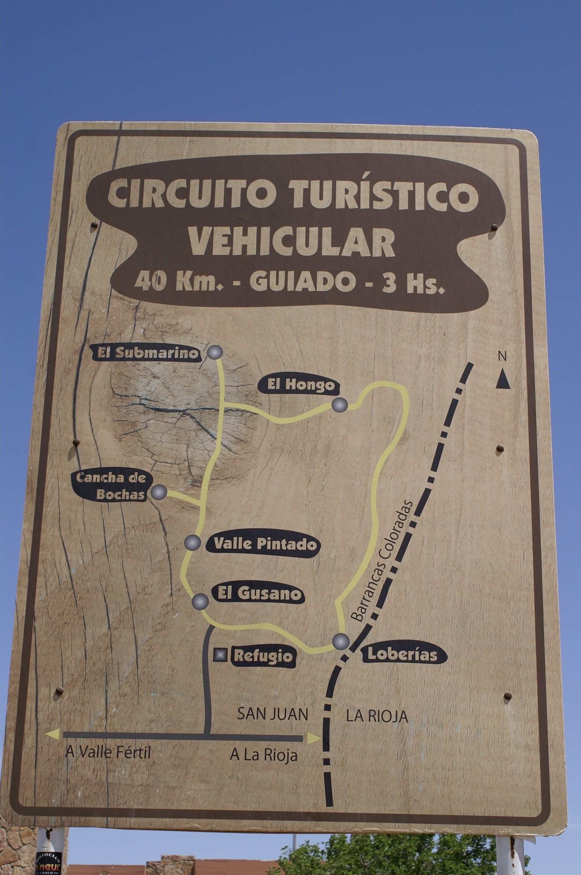 Um auch dieses Areal zu schützen, kann man den Park nicht individuell erkunden, anders als im Talampaya gibt es hier aber keine Touren mit dem Bus. Hier fährt man in seinem eigenen (Miet-)Wagen innerhalb eines Konvois. In das vordere Fahrzeug steigt ein Ranger, der an den verschiedenen Haltepunkten Erklärungen gibt. Wir erreichen gerade rechtzeitig für die nächste Tour den Park. Es bleibt noch Zeit, um die Eintrittskarten für 70 Pesos pro Person zu kaufen und schnell einen Biobreak zu machen und schon setzt sich unser kleiner Konvoi aus fünf Fahrzeugen, von denen wir zwei stellen, in Bewegung. Vor uns liegt eine 3-stündige, geführte Rundfahrt von 40 Kilometern.