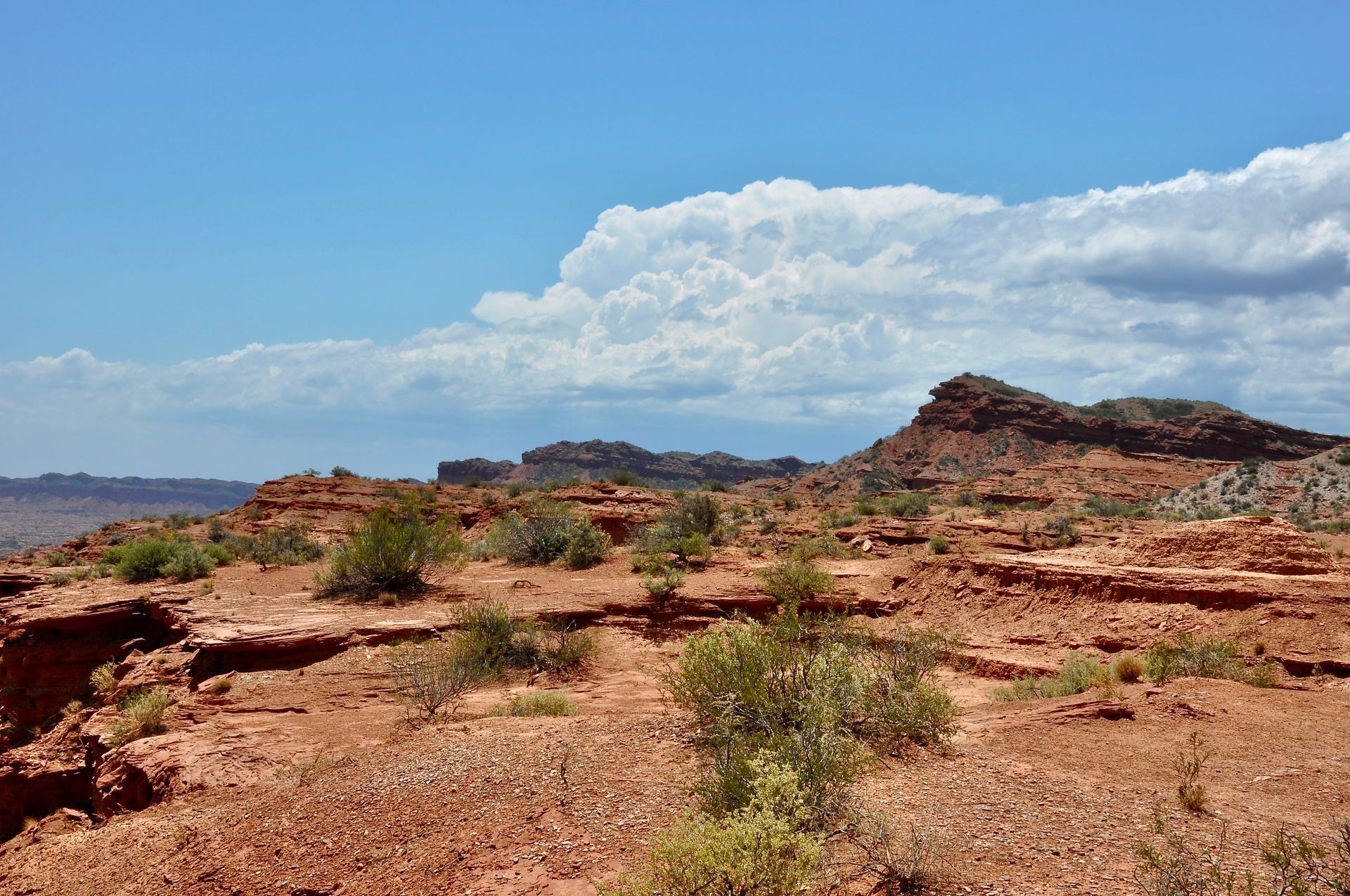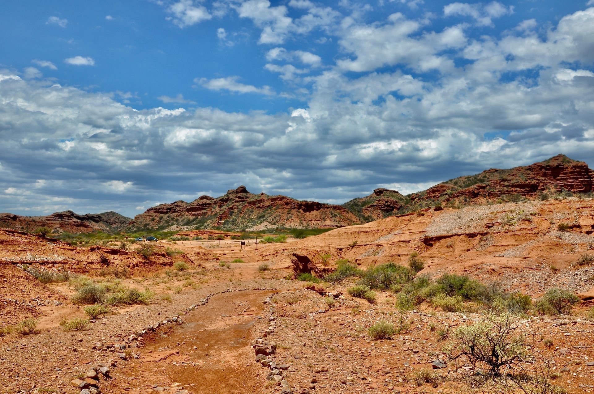 Die Strecke führt uns über kaum befahrene Straßen durch eine gänzlich andere Landschaft. Alles wird trockener. Nach einiger Zeit folgt die Abzweigung zum Parque Nacional Sierra de las Quijadas. Für uns bedeutet dies zwar einen Umweg, den wir aber gerne in Kauf nehmen. Dieser Park ist wenig besucht, zu weit abseits liegt er und für die nächste Unterkunftsmöglichkeit muss man eine größere Distanz zurücklegen. Umso mehr wundert es mich, ein kleines, jedoch sehr neues Besucherzentrum vorzufinden. Wir sind die einzigen Besucher. Der Parque Nacional Sierra de las Quijadas wird geologisch dem Parque Nacional Talampaya, den wir vor zwei Jahren besucht haben, zugeordnet. Er ist ein Kleinod und die rote, nur mit dem Grün der spärlichen Pflanzen versetzte Landschaft ist ein weiterer Kontrast zu allem Gesehenen auf der diesjährigen Route.