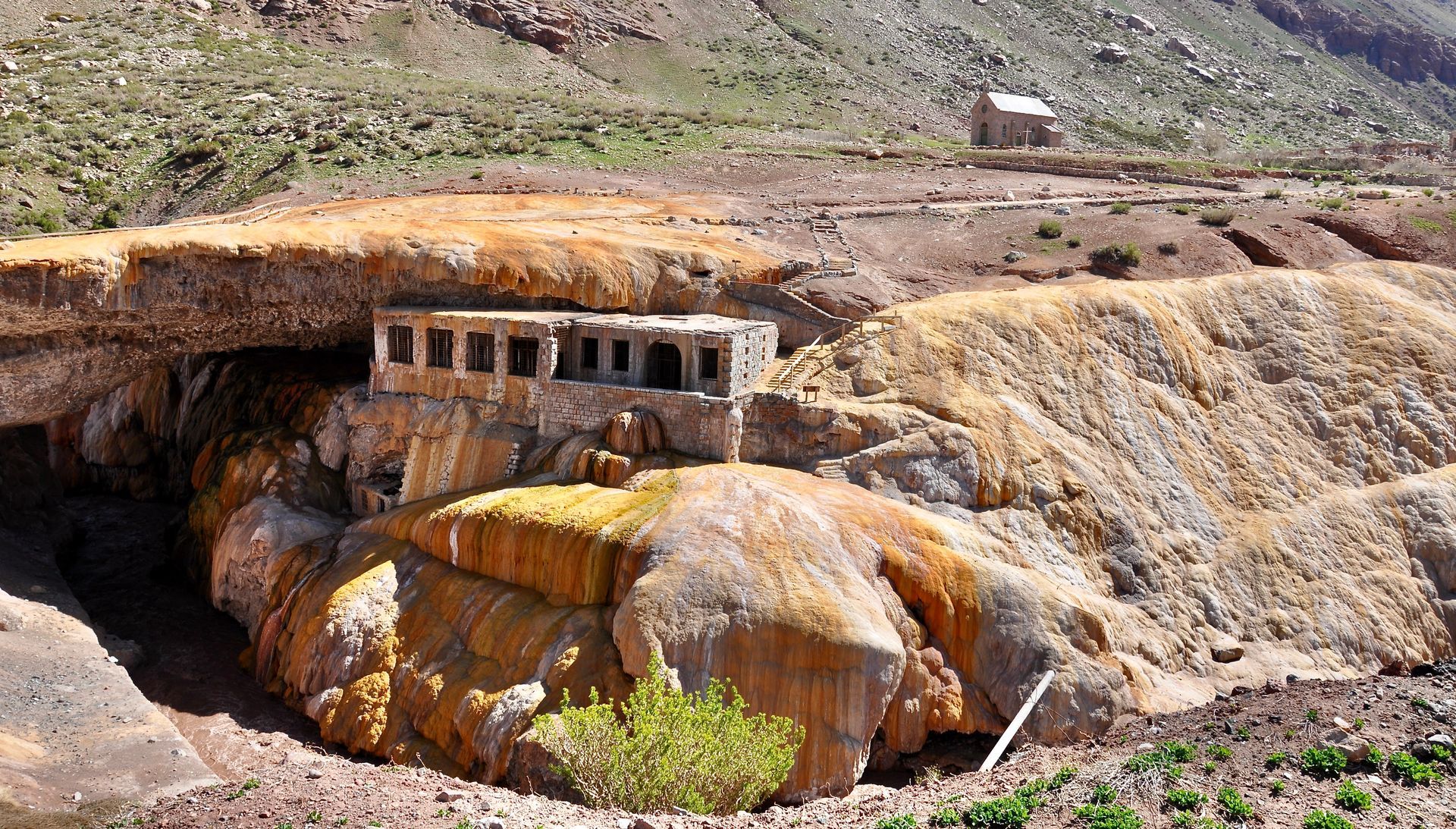 Ein weiterer obligatorischer Stopp folgt an der Puente del Inca. Wir befinden uns noch immer oberhalb von 2.700 Metern. Die Puente del Inca ist keine von den Inkas errichtete Brücke, wie der Name vermuten lassen könnte. Vielmehr handelt es sich um eine geologische Formation. Die natürlich entstandene Brücke überspannt mit 28 Metern den Río de las Cuevas, dessen schwefelhaltiges Wasser für die farbige Wunderwelt ringsum sorgt. Auf der gegenüberliegenden Seite der 47 Meter tiefen Schlucht stehen die Ruinen des ehemaligen Thermalhotels, nun ein UNESCO Naturdenkmal. Mitte der sechziger Jahre des vergangenen Jahrhunderts zerstörte eine Lawine den Ort der Erholungssuchenden, nicht aber die Quelle, aus der auch heute noch 34 Grad warmes Wasser sprudelt.