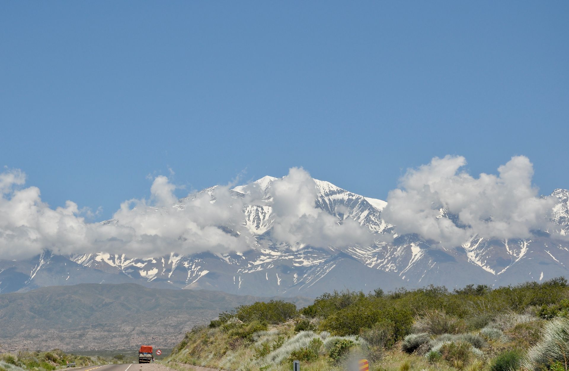 Der damalige Wintereinbruch sorgte dafür, dass wir uns weder die Puente del Inca noch die Laguna de Horcones zu Füßen des steinernen Wächters, des Aconcaguas, anschauen konnten. Lediglich flüchtige Blicke im Vorbeifahren konnten wir erhaschen. Mit zwei Jahren Verspätung wollen wir heute endlich nachholen, was wir seinerzeit verpassten. Obwohl wir sogar einige Tage im Kalenderjahr früher sind, ist uns das Wetter wohlgesonnen. Es könnte nicht besser sein. Bereits bei der Abfahrt aus Lujan können wir am Horizont die schneebedeckten Andengipfel sehen, die nicht selten die 6.000er Marke überschreiten.