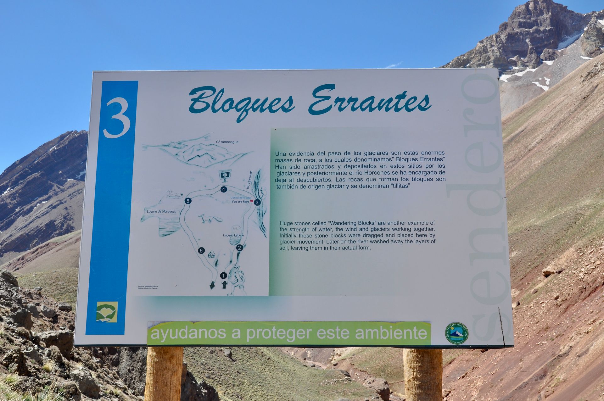 Der Parkplatz des Parque Provincial Aconcagua liegt nahe der Hauptverkehrsader. Von hier aus müssen wir uns per Pedes bewegen. Das geht nicht ganz so schnell, wir befinden uns nicht weit entfernt von der 3.000 Meter Marke und die Strecke führt bergauf. Zuhause ständen wir beinahe schon auf dem Gipfel der Zugspitze. Nachdem wir die zwar nicht allzu heftige, jedoch atemraubende Steigung hinter uns gebracht haben, beginnt ein zwei Kilometer langer Rundkurs, der uns an der Laguna Espejo und der Laguna de Horcones entlangführt und am Wendepunkt mit einem nicht weniger atemberaubenden Blick auf den Giganten bei bestem Wetter belohnt. Wir sehen die Südseite des Berges und die Seraks, Gletscher, die 300 Meter hoch sind. Von hier unten kann ich mir diese Größe kaum vorstellen. Dieses Panorama finde ich überwältigend.