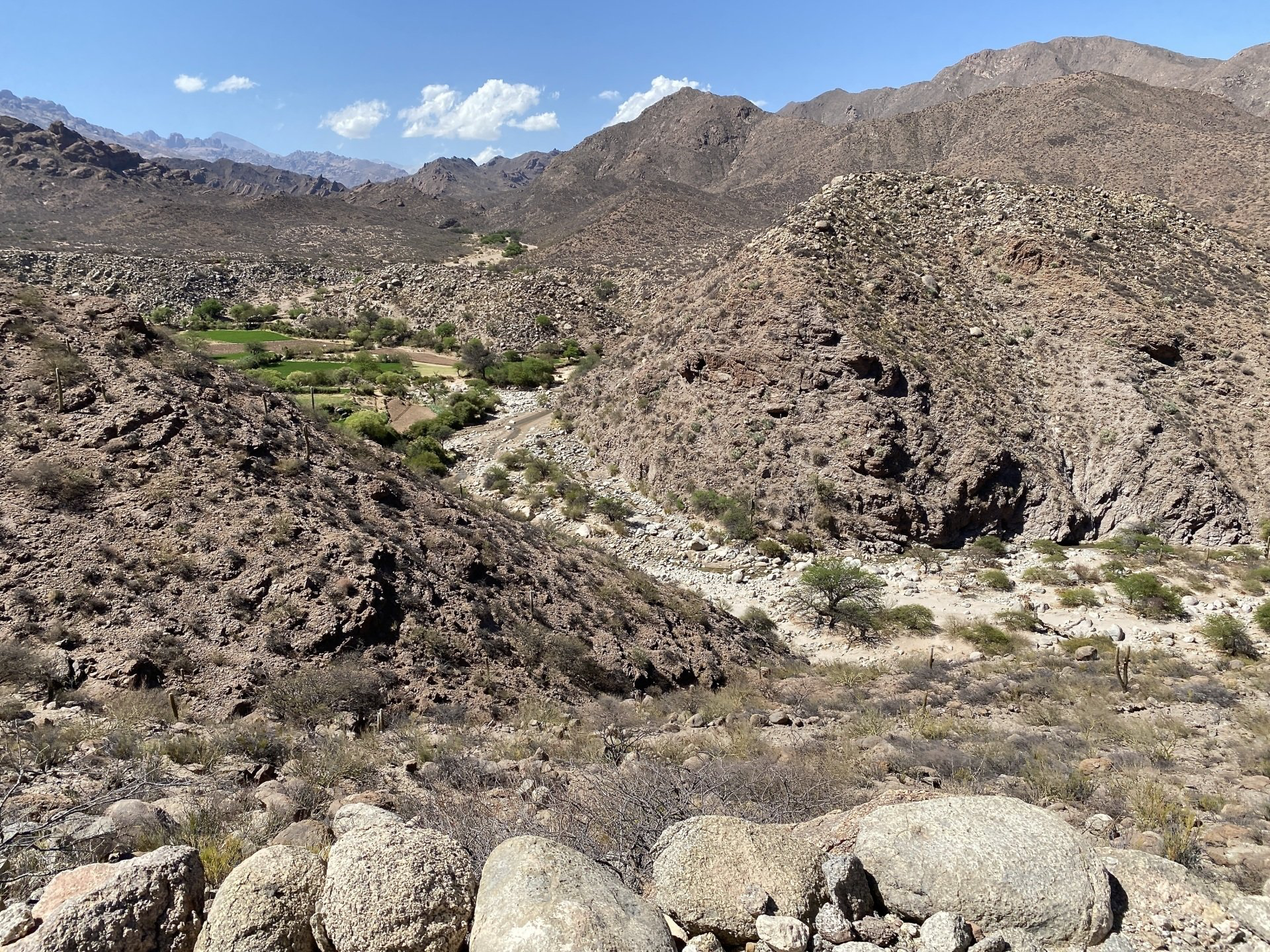Nachdem wir einen kleinen Pass bewältigt haben, bietet sich mir ein wunderschöner Blick ins Tal auf Tacuil. Ich bin begeistert, welch ein Idyll liegt da vor meinen Augen; rundherum sand- und graufarbene Felsen, unten im Tal leuchten die Weinreben und Bäume in Grün. Die verbleibende Strecke ist nichts für Personen mit Höhenangst. Die Piste ist gerade breit genug für ein Fahrzeug und neben mir auf der Beifahrerseite blicke ich in einen ungeschützten Abgrund. Wie ich mir schon dachte, ist diese Piste während der Regenzeit oftmals nicht passierbar. Ich frage mich einmal mehr, was machen die Menschen nur bei einem Notfall, die in solcher Abgeschiedenheit leben.