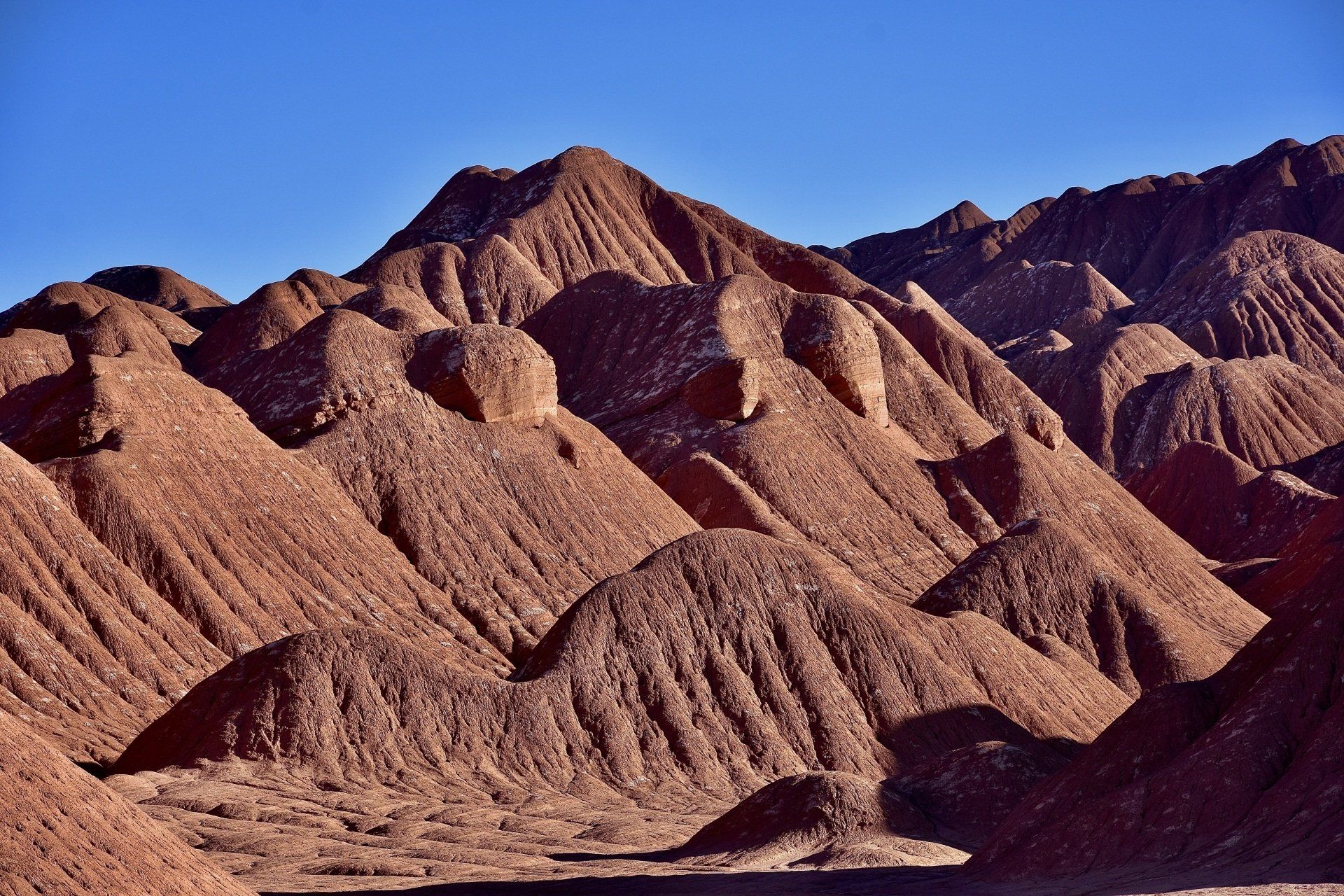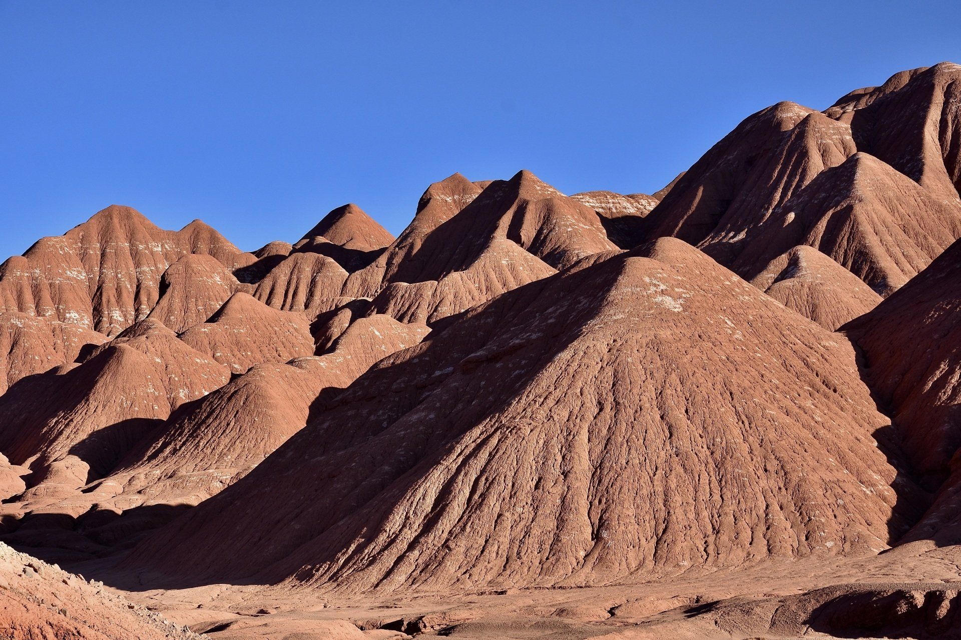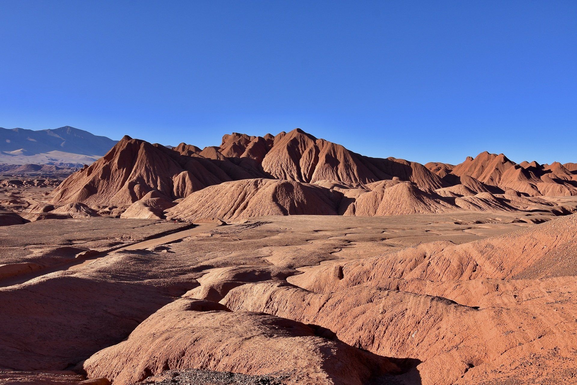 Dann erreichen wir die Labyrinth Wüste. Wieder lässt mich mein Guide mehrmals aussteigen. Ich laufe alleine durch eine Passage auf der Straße, die sich an dieser Stelle direkt durch die bizarren Hügel windet. Nur der kalte Wind pfeift unaufhörlich. Später klettere ich einen Aussichtshügel empor, den mein Guide mir gezeigt hat, denn ausgeschildert ist hier nichts. Ich muss zeitweise aufpassen, dass mich der Wind nicht wegbläst. Diese Gegend, die anderswo wahrscheinlich längst ein überlaufener Nationalpark wäre, ist einfach nur unglaublich und wir haben scheinbar mit meiner Planung den idealen Tageszeitpunkt für den Besuch getroffen. Die langen Schatten, das Licht, was für eine Gegend. Wir befinden uns auf 3.700 Metern Höhe und diese Wüste gehört zu den Kaltwüsten. Temperaturen unter minus 30 Grad sind möglich. Hier sollte man besser nachts nicht unterwegs sein oder eine Panne haben, aber das gilt für die gesamte Puna, in den noch höheren Gebieten umso mehr.