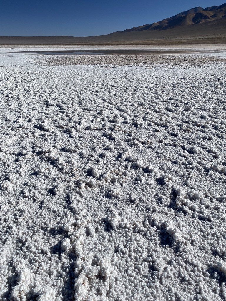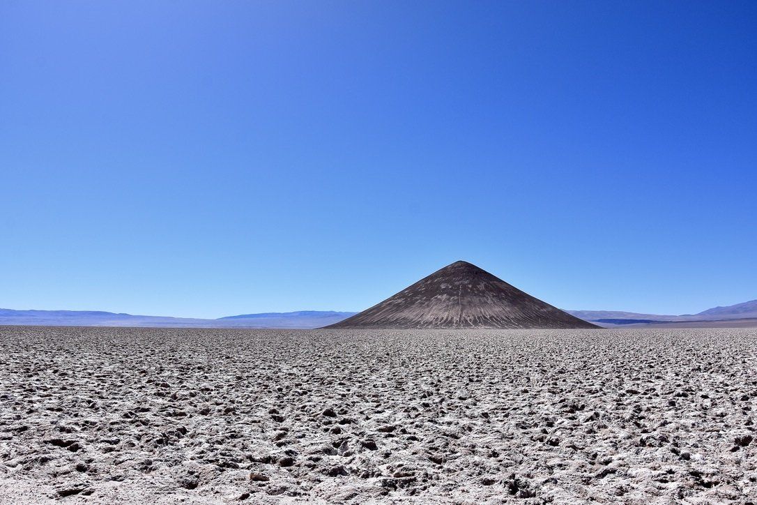 Nachdem wir gestern „den Ort, an dem jeder dem Tod geweiht ist“ von Osten nach Westen und vice versa gequert haben, biegen wir heute auf die Salzpiste Richtung Süden ab. 70 Kilometer beträgt die Nord-Süd-Ausdehnung des Salars de Arizaro. Etwa 90 Minuten fahren wir bis zu dem Highlight, das ich zuvor schon auf Bildern gesehen habe, den Cono de Arita. Mit einer fast perfekten Kegelform erhebt sich der Vulkan 70 Meter hoch aus der ebenen, gräulichen Salzpfanne. Alle Maße an diesem Ort scheinen mit der Zahl 70 in Verbindung zu stehen. Es ist äußerst mühsam, auf dem Salzsee zu laufen, besonders weit komme ich nicht, aber das ist mir auch nicht wichtig.