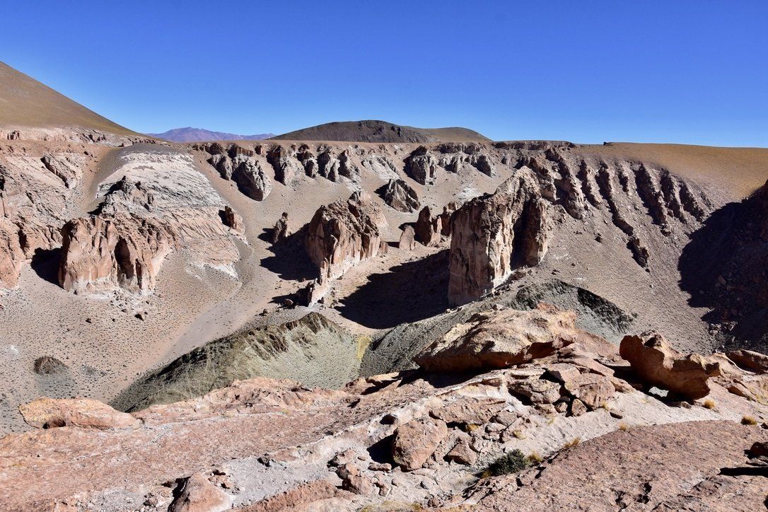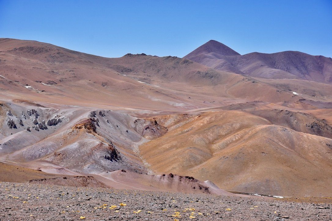 Wir verlassen den Salzsee und fahren mal auf etwas breiteren Pisten, mal auf einspurigen Pisten, dann auf Tracks und manchmal ist kaum eine Fahrspur zu erkennen. Immer wieder gibt es Abzweigungen, allen gemeinsam ist, dass keine beschildert ist. Teilweise sind die Tracks sehr übel und nur mit 4 x 4 zu passieren, über Stunden werde ich durchgeschüttelt, zum Glück habe ich keine Bandscheibenprobleme. All diese Mühe wird mit einer atemberaubenden Szenerie um mich herum belohnt. Ständig wechseln die Ausblicke, es ist unbeschreiblich, was vulkanische Aktivität hier geschaffen hat. Immer wieder staune ich über diese Landschaft, die eher vermuten lässt, der Palette eines Malers entsprungen zu sein, als dass sie tatsächlich Realität ist. Wir passieren den Volcán Antofalla, selbstredend auch ein 6.000er, genau genommen finde ich Höhenangaben von 6.409 Metern. Dieser Vulkan ist besonders gut zu sehen, wenn man die Strecke von Norden nach Süden fährt.