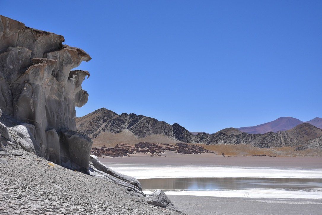 Wir fahren auf steilen Pisten hinunter zum Salar. Unser Ziel ist der kleine Weiler Antofalla, wo wir zu Mittag essen werden. Seit wir am Morgen Tolar Grande verlassen haben, habe ich kein anderes Fahrzeug gesehen, geschweige denn irgendeine Form menschlicher Ansiedlung, einzig an eine Goldmine in der Nähe des Salars de Arizaro kann ich mich erinnern. Ich möchte mir nicht vorstellen, was passiert, wenn man sich hier für eine falsche der unzähligen Abzweigungen entscheidet und/oder eine Panne hat, wir befinden uns größtenteils auf über 4.000 Metern Höhe. Schlimmstenfalls ist Niemand über den Aufenthaltsort unterrichtet, man hat kein entsprechendes Kommunikationsgerät an Bord, weitab vom Mobilfunknetz befindet man sich ohnehin und fehlende Spanischkenntnisse könnten zu einer zusätzlichen Hürde werden. Ich denke darüber nach, wen ruft man an, falls man als Individualtourist mit nur einem Wagen unterwegs ist und zumindest ein Satellitentelefon mit sich führt? Den argentinischen Automobilclub? In welcher Sprache kommuniziert man, wenn man nicht gut genug Spanisch spricht? Allerspätestens auf dieser heutigen Etappe weiß ich, dass diese Strecke definitiv nichts für uns wäre, um sie alleine als Selbstfahrer zu bereisen. Vielleicht ändert sich meine Einstellung dazu in einigen Jahren, wenn die Strecken mehr frequentiert sein sollten, nur im Hier und Jetzt weiß ich, wie meine Entscheidung ausfällt.