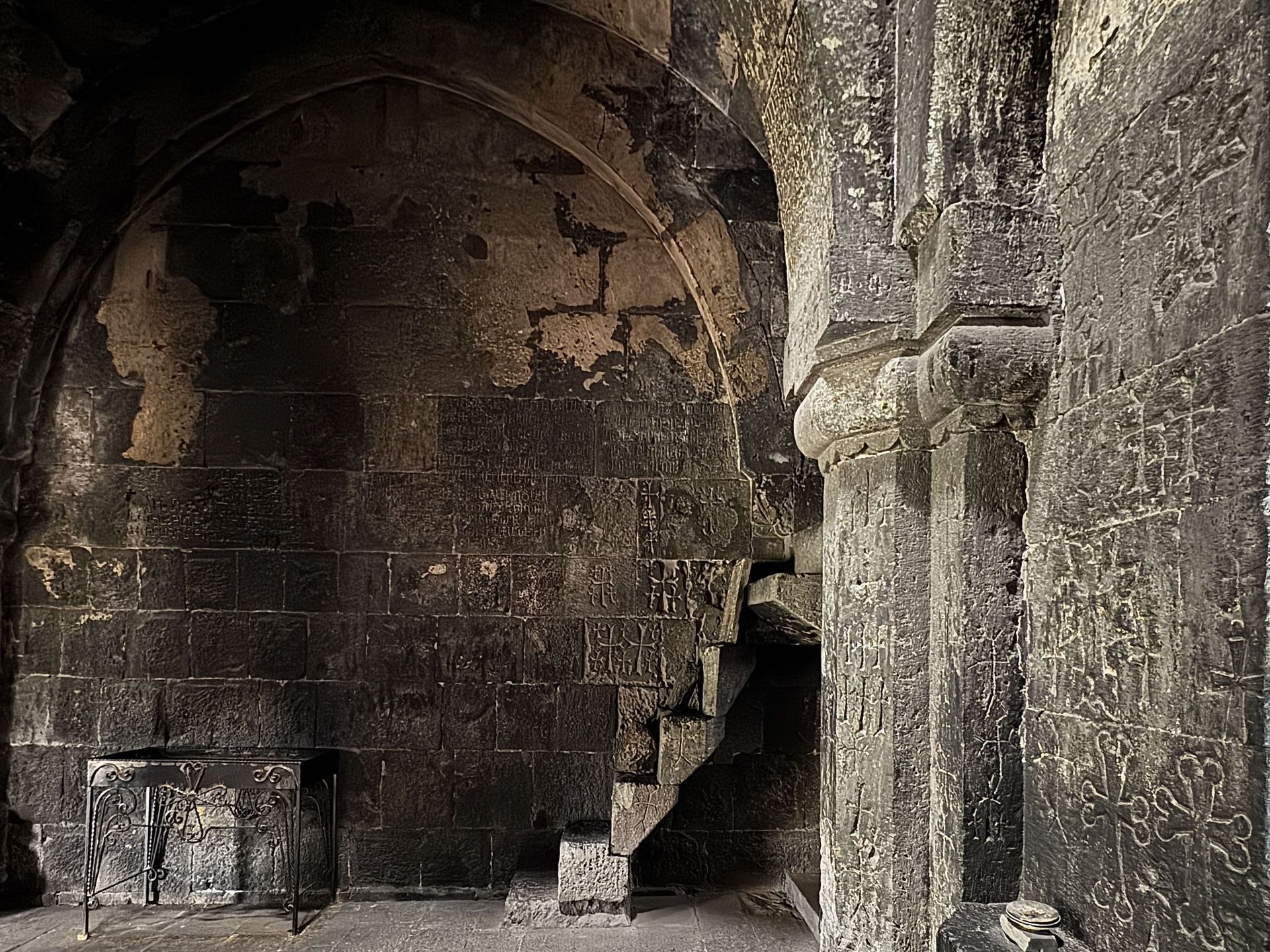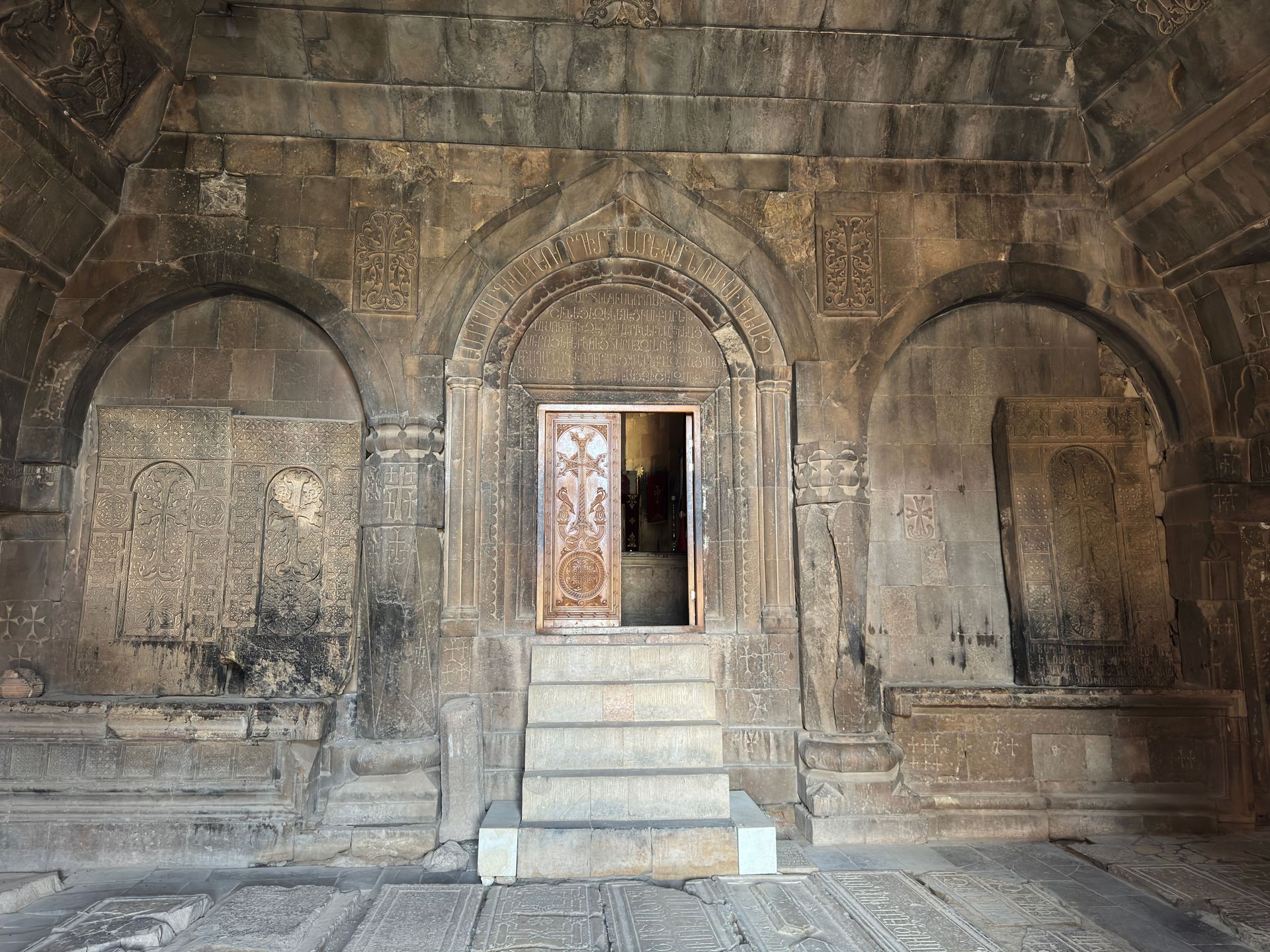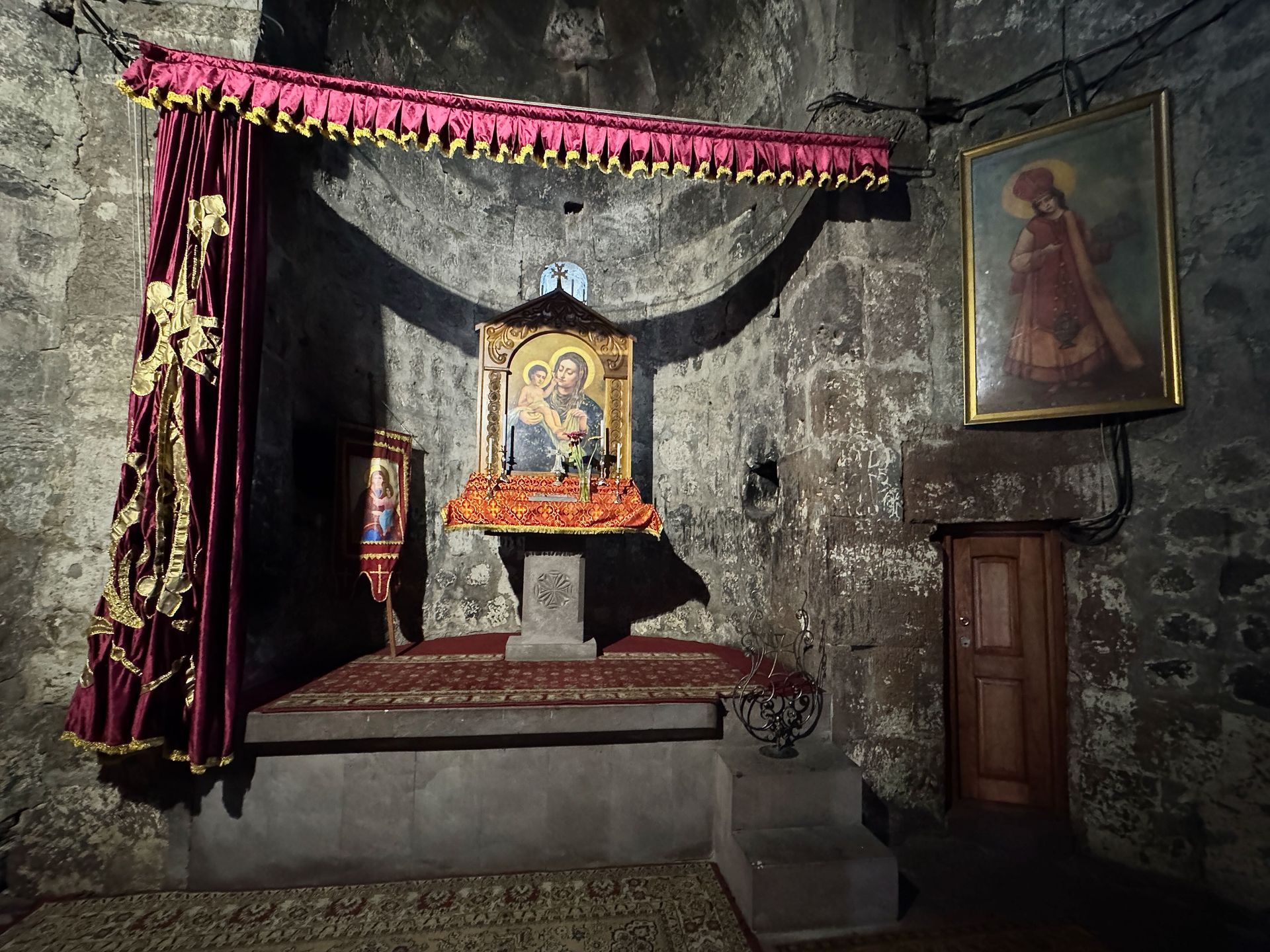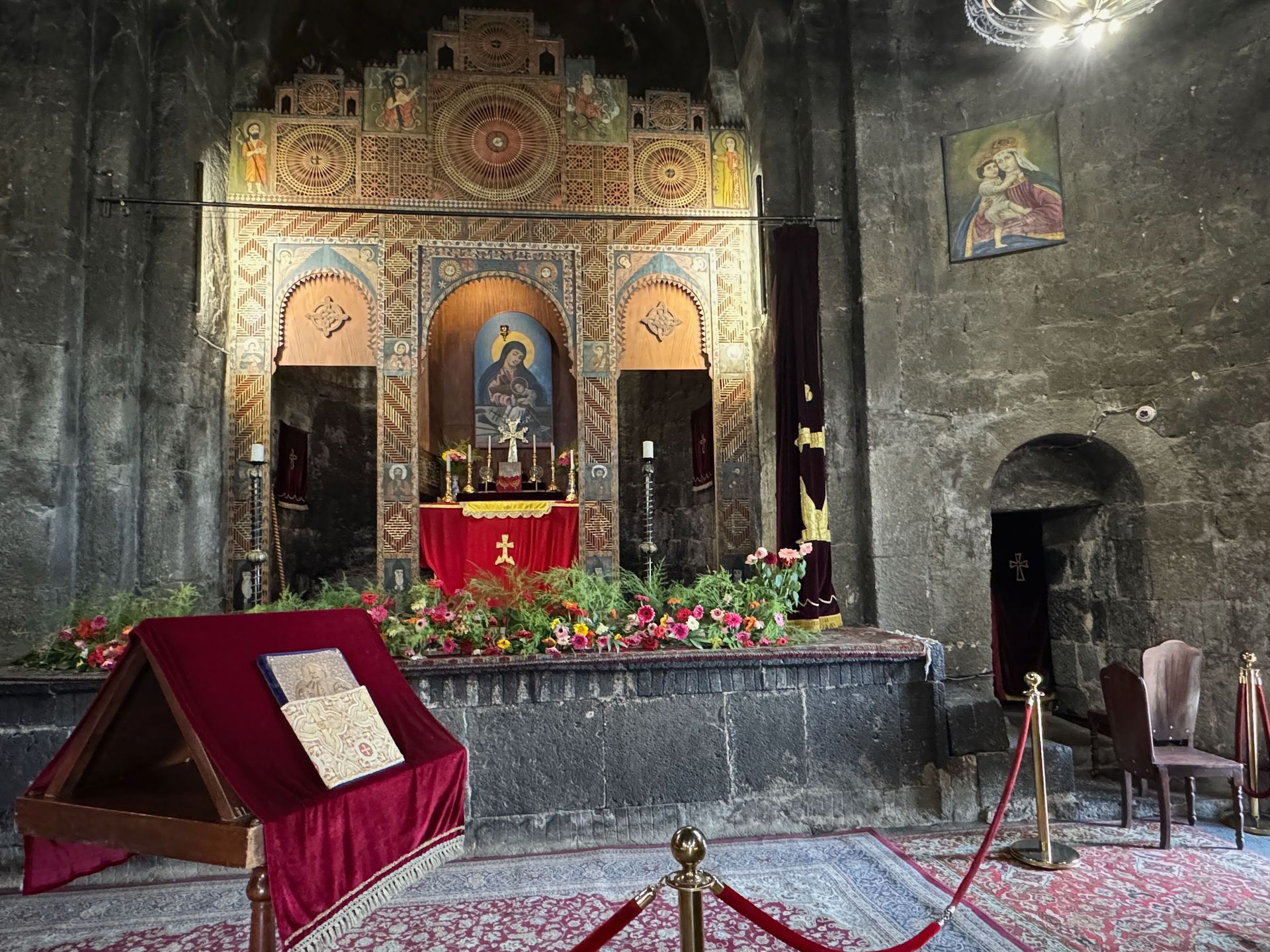 Wir fahren zum Kloster Hajrawank, das aus dem 9. Jahrhundert stammt. Durch den Gavit gelangen wir zur Kirche mit dem Altar. Wir hören, dass der dort hängende Vorhang ein Zeichen dafür ist, dass noch regelmäßig Gottesdienste stattfinden. Der Vorhang wird immer für 40 Tage nach Ostern verschlossen. Wer nach Armenien reist und Altare sehen möchte, sollte besser die Zeit bis Himmelfahrt meiden.