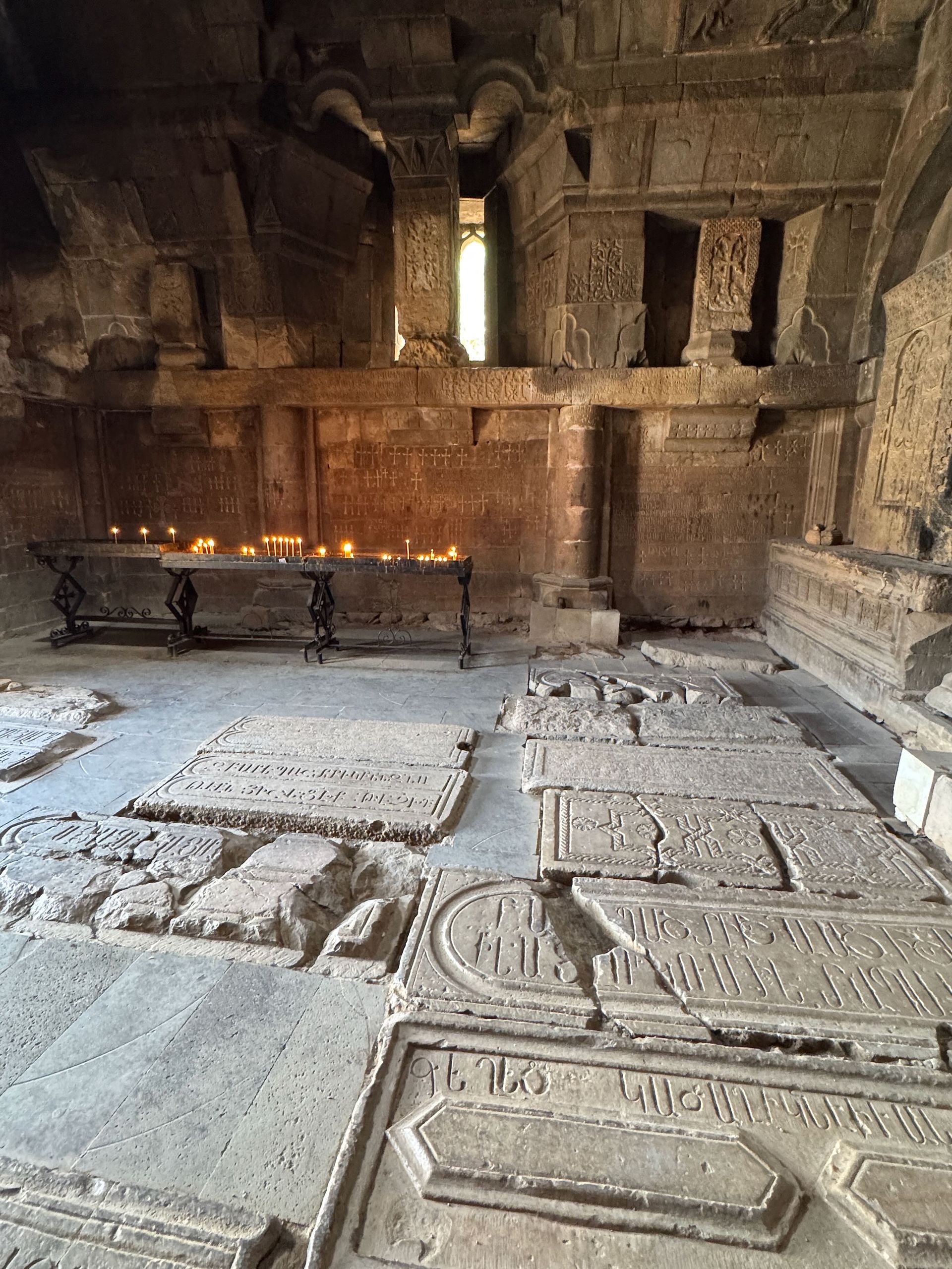 Zum einen ist es die phantastische Lage, zum anderen sind es die Reliefs, die uns beeindrucken, aber auch die Räume im Inneren, deren Boden von vielen Jahrhundert alten Gräbern geprägt sind. Norawank ist absolut besuchenswert. Wir haben zudem das Glück, dass wir früh genug vor Ort sind, bevor die Reisegruppen eintreffen.