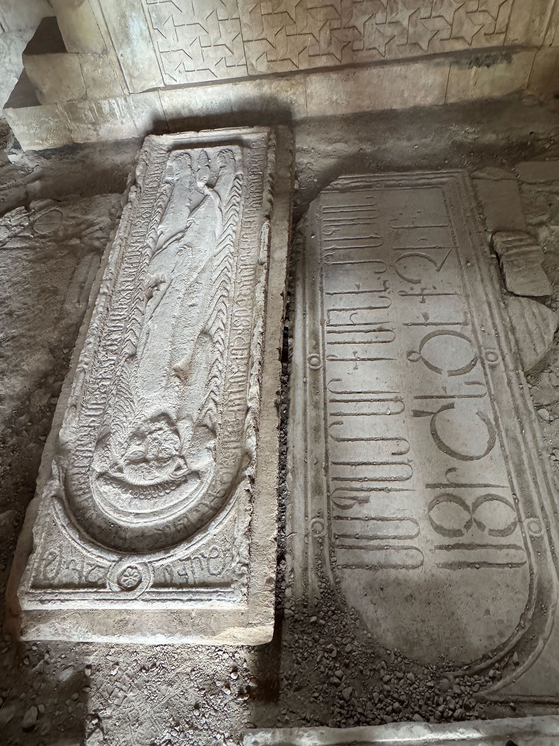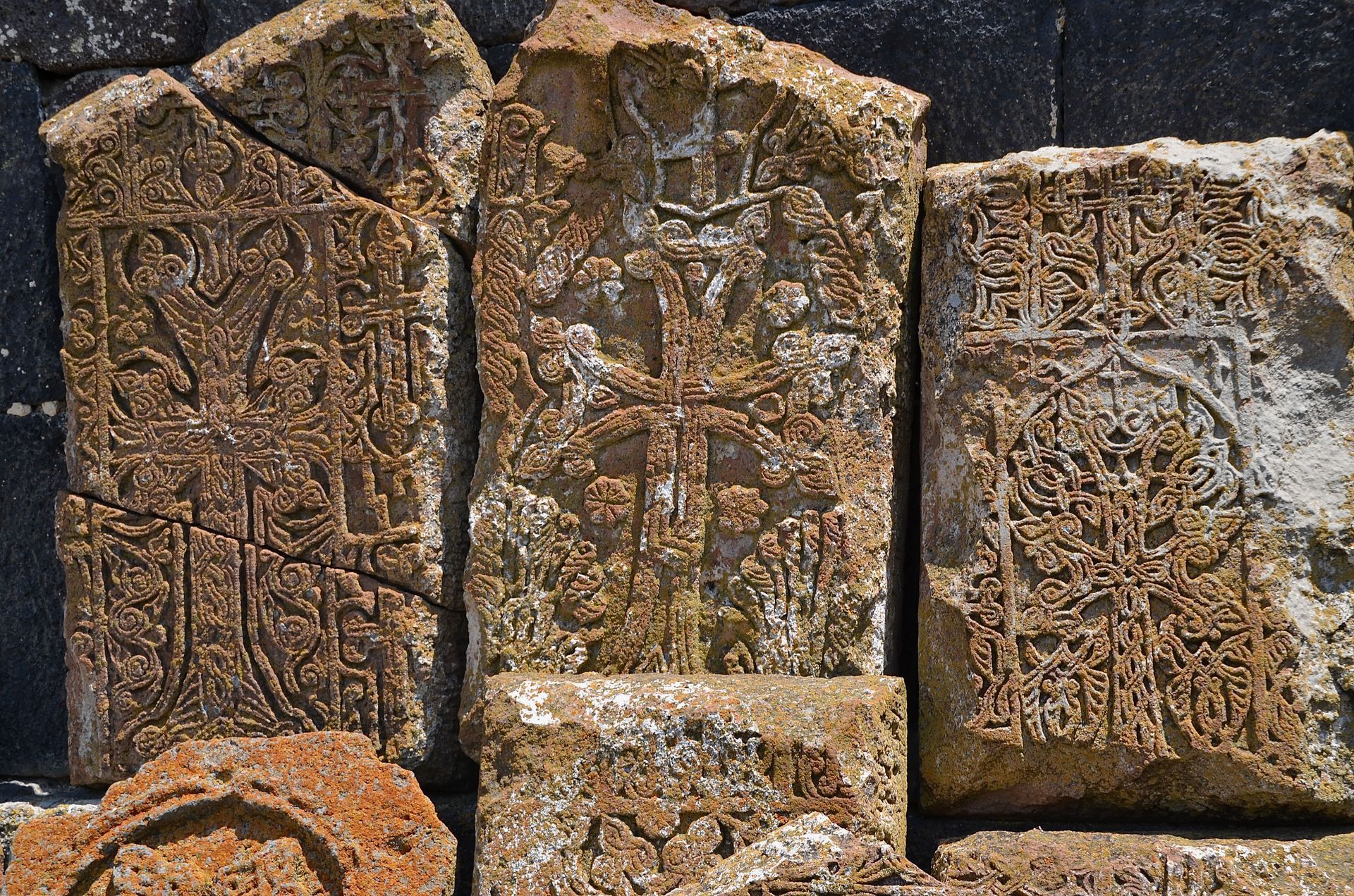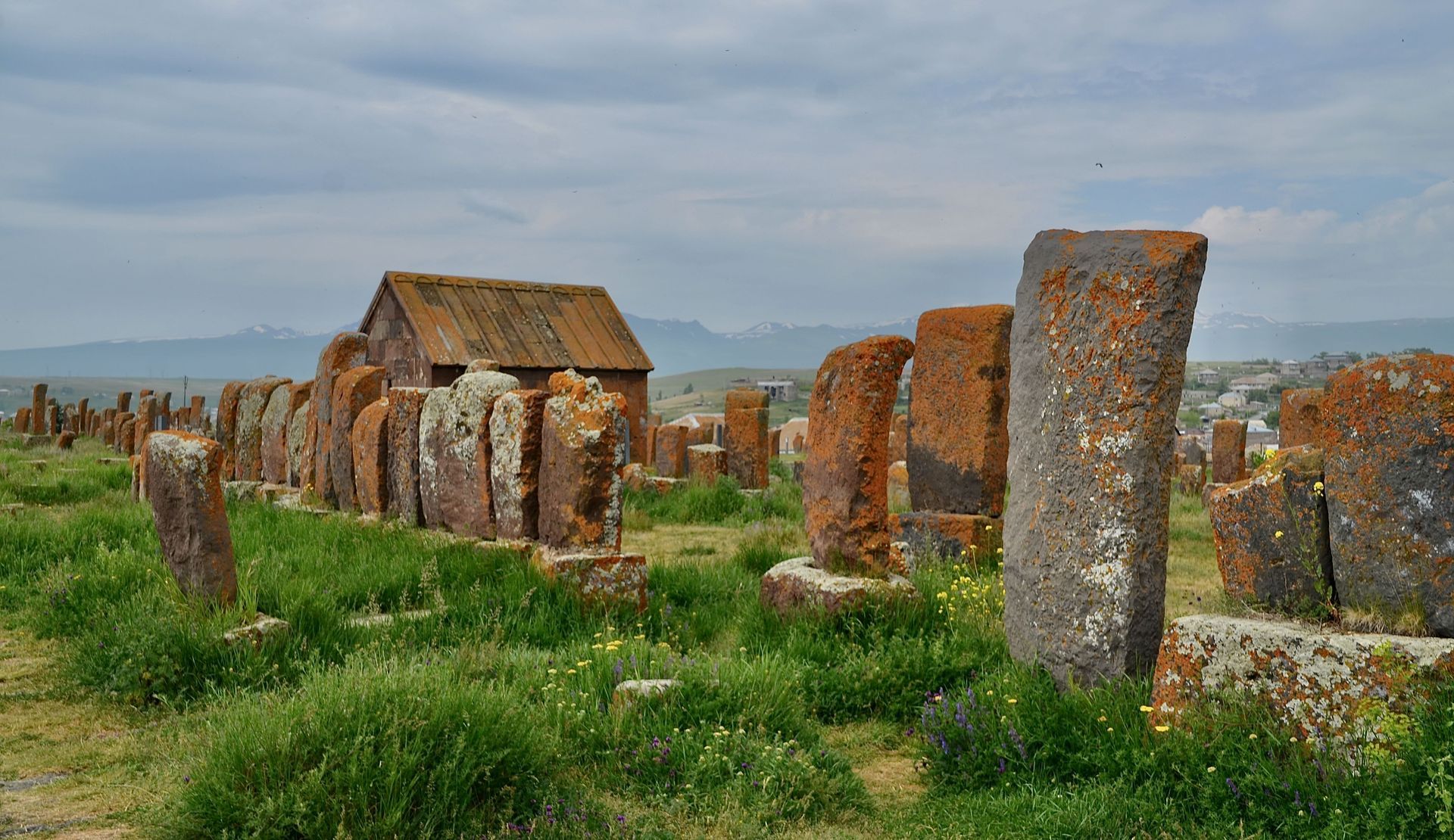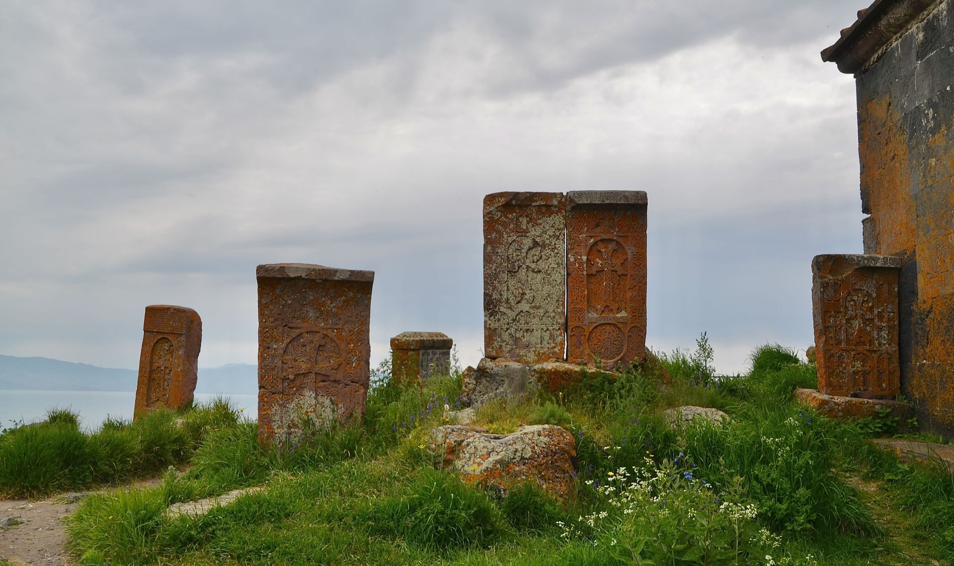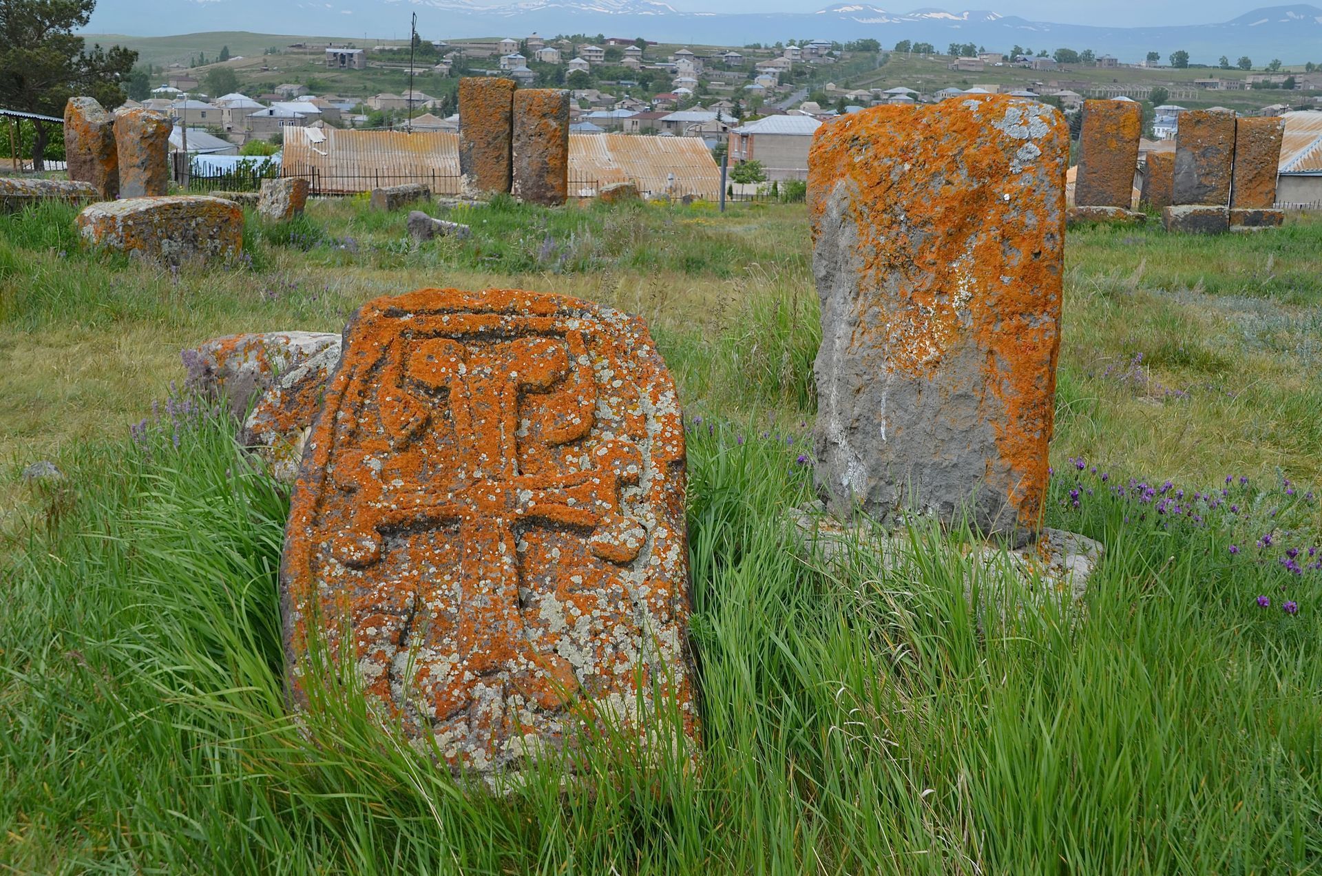 Bis noch vor gar nicht allzu langer Zeit, ganze zwei bis drei Jahrzehnte zurückliegend, existierte ein Feld mit Kreuzsteinen, das über 2.700 Exemplare verfügte. Wie gewaltig muss dieses gewesen sein, wo wir von dem Kreuzsteinfeld hier in Noratus schon tief beeindruckt sind. Das größere Feld lag in Aserbaidschan, wurde aber zerstört. Mir war das nicht bewusst, und ich kann mich auch nicht erinnern, darüber etwas in den Nachrichten gehört zu haben. Das ist so traurig und immer wieder vernahmen wir in den letzten Tagen das tiefe Bedauern der Armenier darüber.