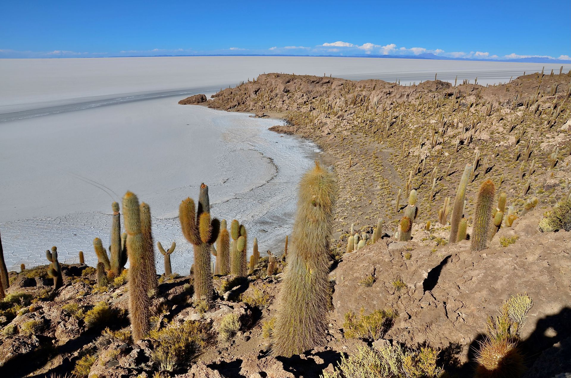 Mitten aus dem unwirklichen, endlosen Weiß ragen mehrere dieser Felsinseln empor. Die Isla Incahuasi ist wahrscheinlich die meistbesuchte von allen. Die Geländewagen zu Füßen der Insel können wir bereits aus der Entfernung erspähen, ein krasser Gegensatz zum nördlichen Bereich des Salzsees, von dem wir gerade kommen. Nichtsdestotrotz hat dieser Ort etwas Wundervolles. Auf der Insel stehen unzählige, bis zu 10 Meter hohe Kakteen der Gattung Trichocereus, die pro Jahr maximal 1 cm wachsen. Daher geht man davon aus, dass manche dieser Kakteen bereits 1.000 Jahre alt sein könnten. Über die Insel aus Granit führt ein felsiger Pfad, der mit 40 Minuten Dauer angegeben ist. Wir benötigen natürlich länger, die Aussicht ist ein ums andere Mal atem(be)raubend, dazu trägt das Nachmittagslicht mit den länger werdenden Schatten seinen Teil bei. In der Ferne ragt der Thunupa über das Weiß und die Erdkrümmung ist von hier oben nicht zu übersehen.