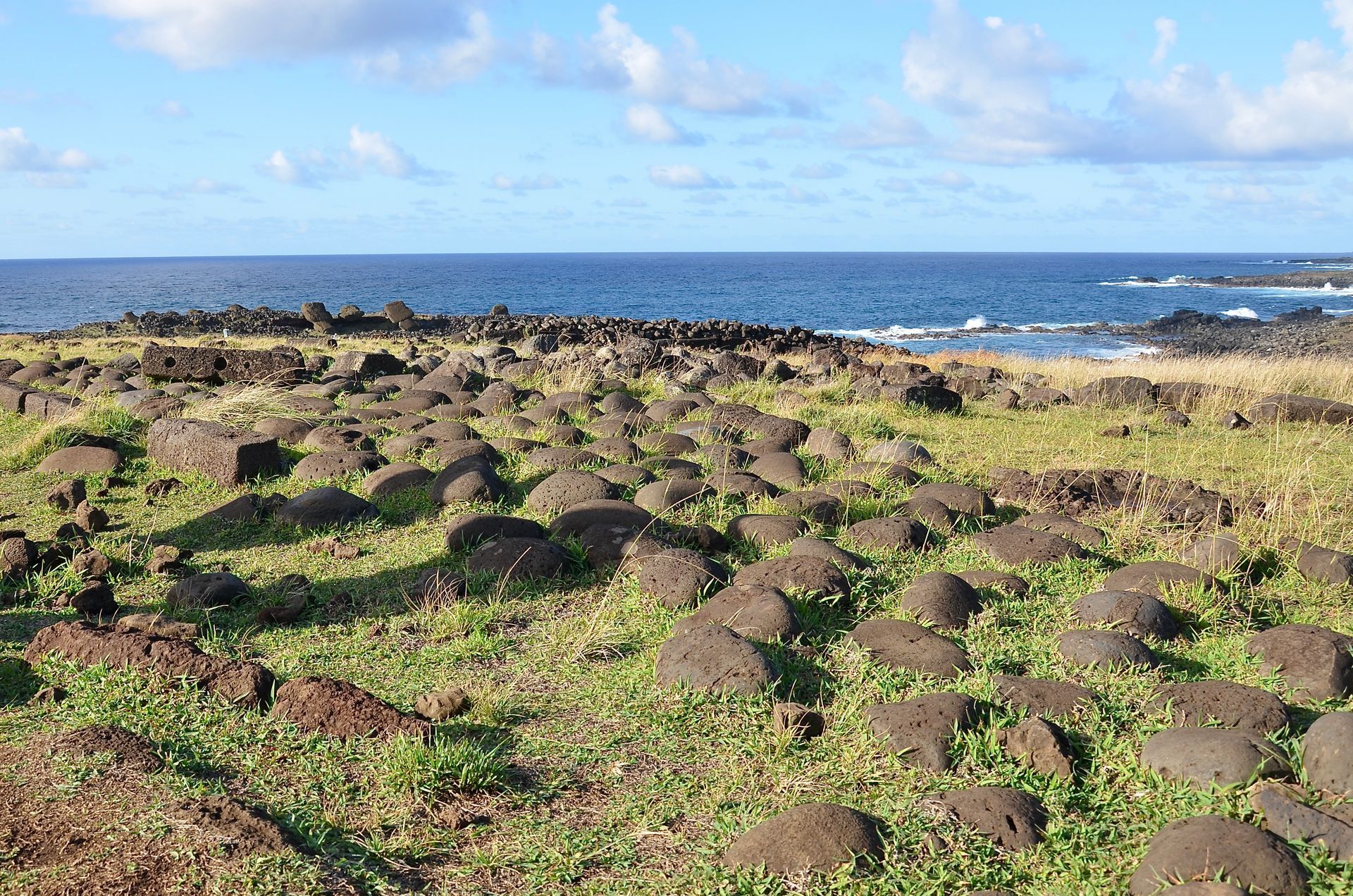 Der Moai Paro auf dem Ahu Te Pito Kura mit seinen 10 Metern Höhe und 80 Tonnen Gewicht, von denen alleine sein Pukao 12 Tonnen auf die Waage bringt, war der größte Moai, der jemals aufgestellt wurde. Heute liegt er wie so viele seiner Leidensgenossen mit dem Gesicht kopfüber im Gras, sein Pukao nur wenige Meter entfernt vom ihm. Irgendwann nach 1838 muss er umgefallen sein.