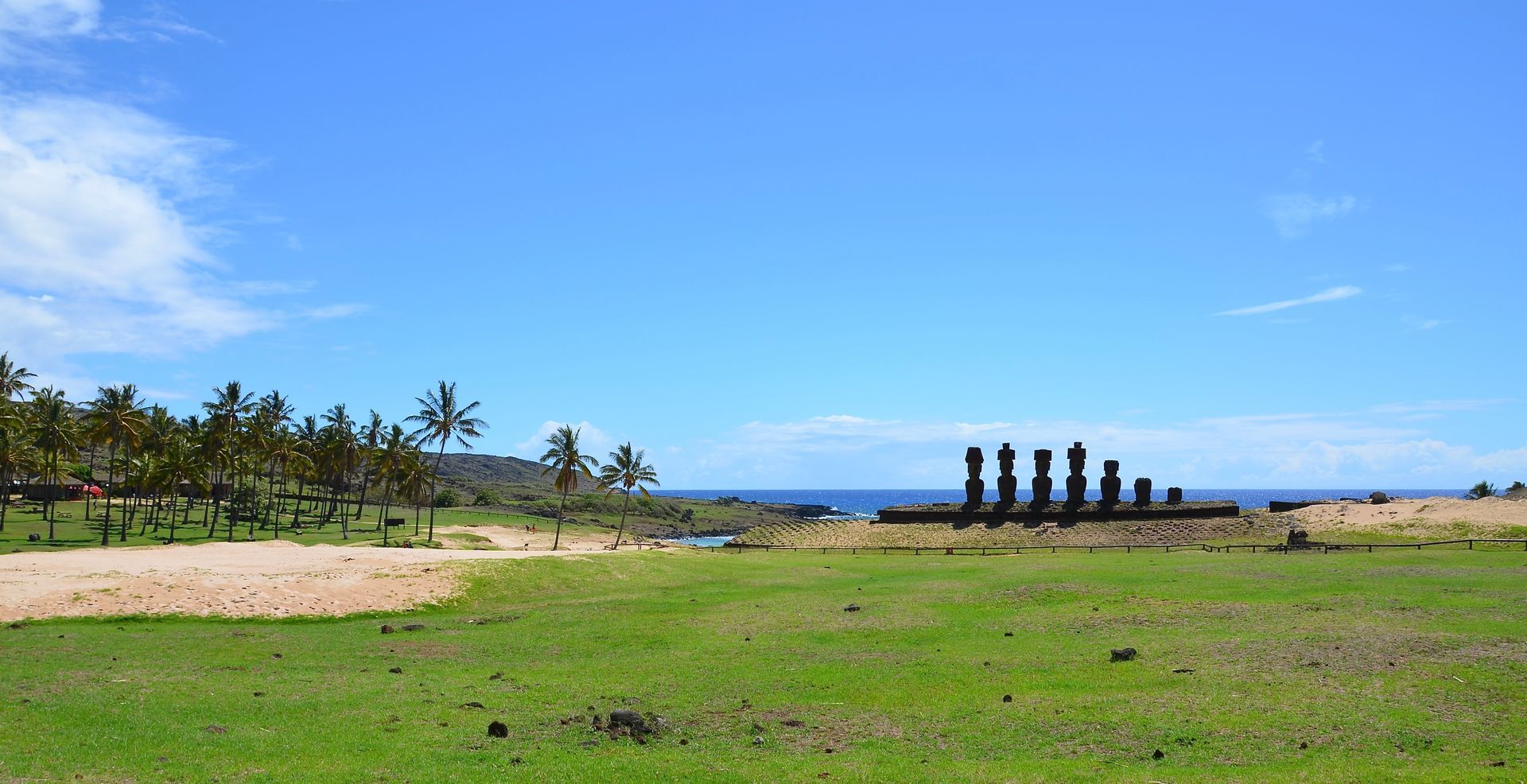 Mit seinen 15 aufgestellten Moais ist Ahu Tongariki die größte Plattform mit stehenden Moais auf Rapa Nui. Wie bei fast allen Moais schauen auch diese ins Landesinnere und stehen mit dem Rücken zum Meer. Jede der Statuen sieht anders aus, einige tragen einen Pukao, andere nicht. Im Jahr 1994 wurden diese 15 Moais von einer japanischen Firma aufgestellt.