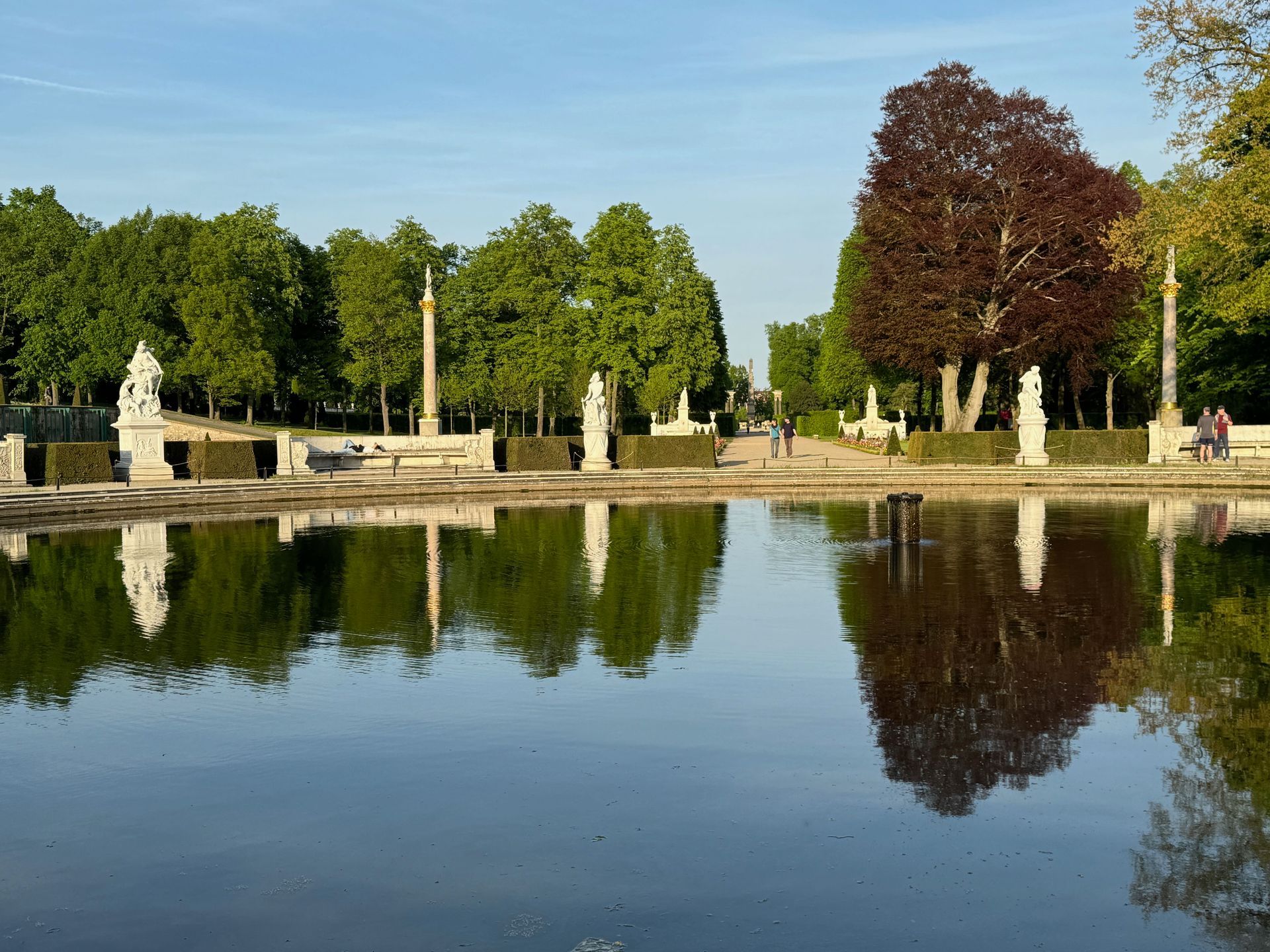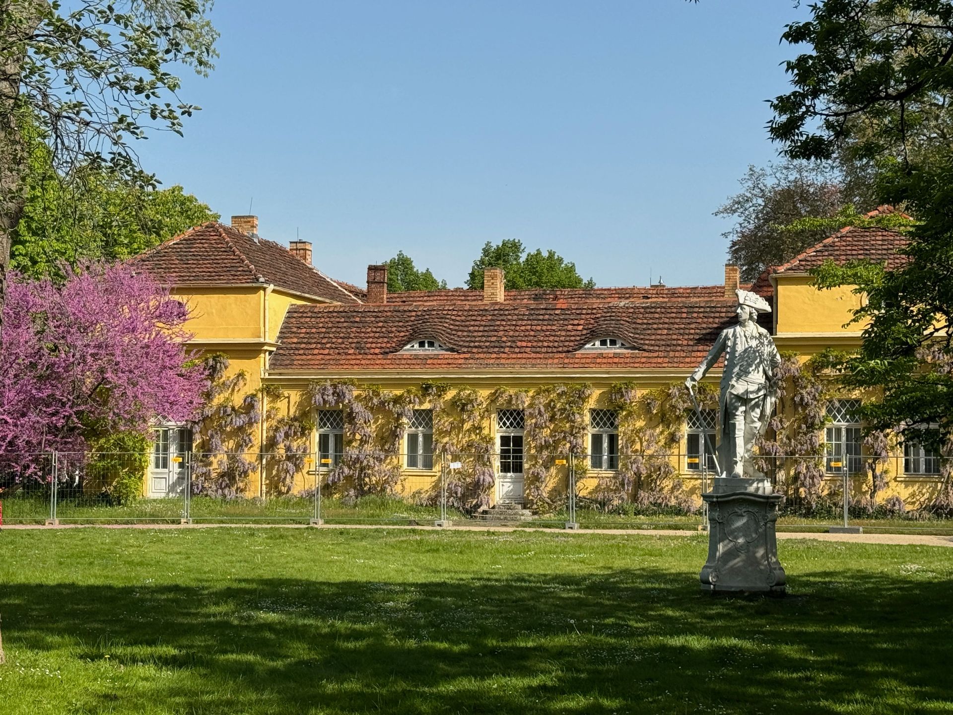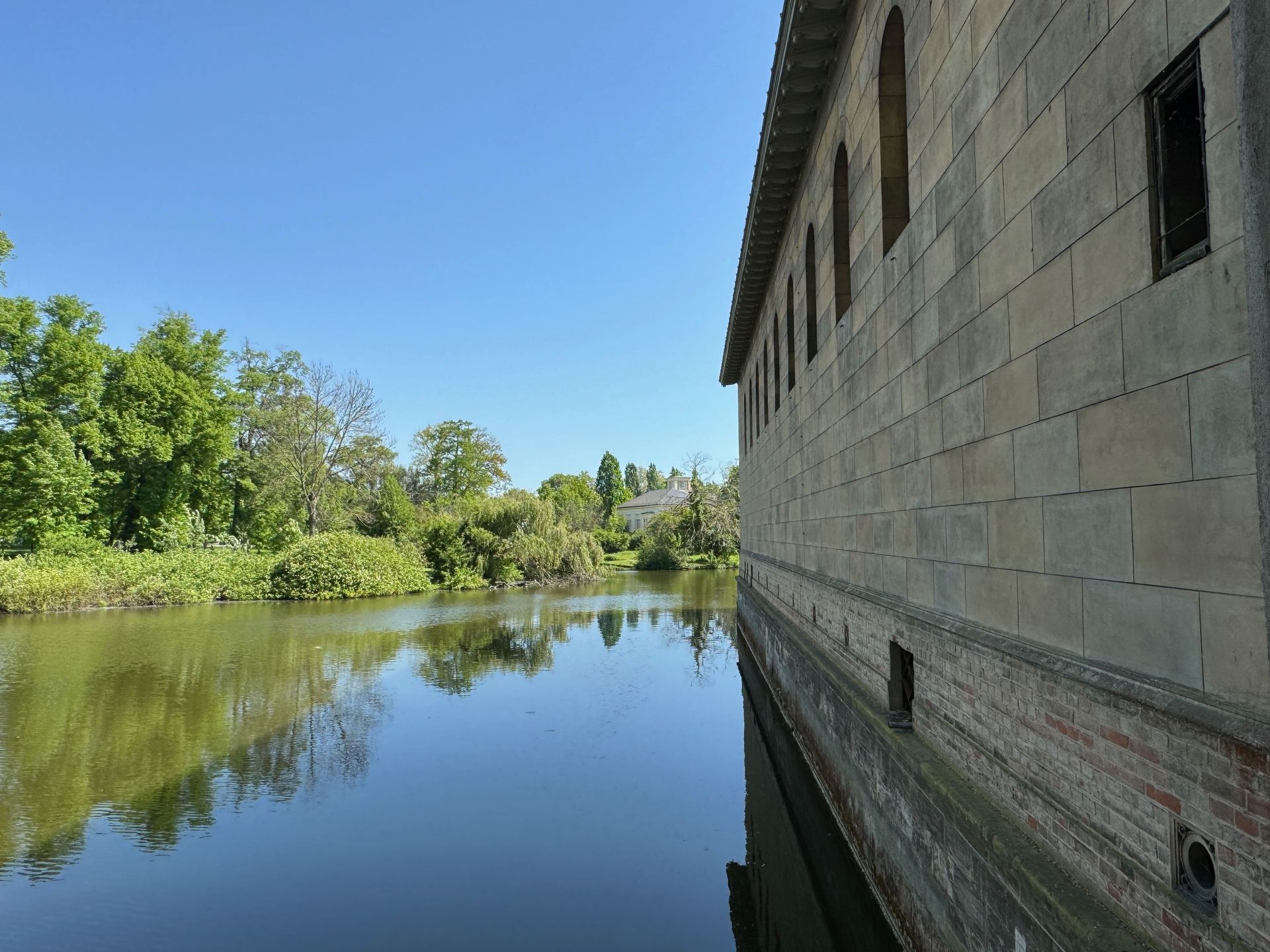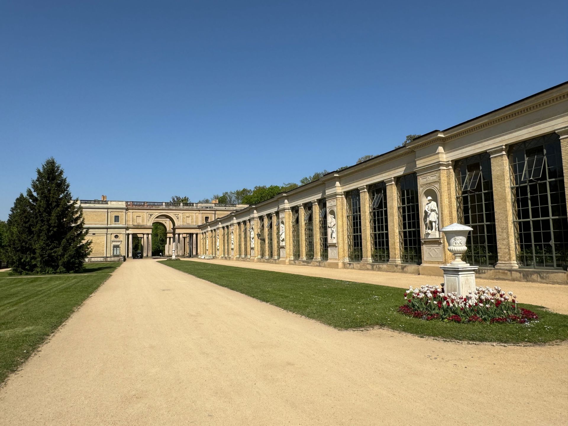 Unser Weg führt uns anschließend an der Mühle vorbei zum Orangerieschloss, das derzeit wegen Restaurierungsarbeiten geschlossen ist. Die Dichte an Schlössern und ähnlichen Bauten in diesem Park beeindruckt mich sehr.