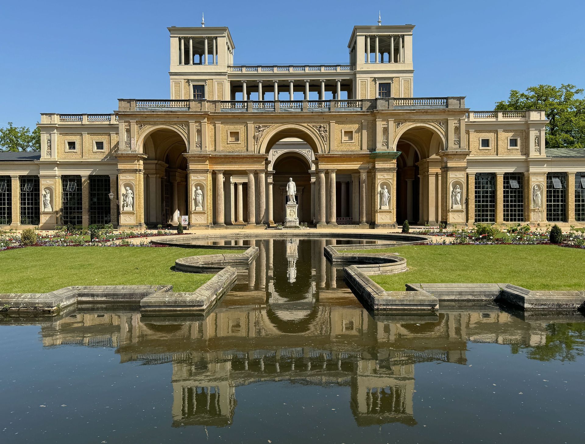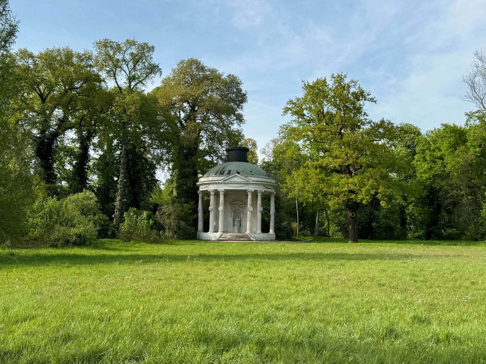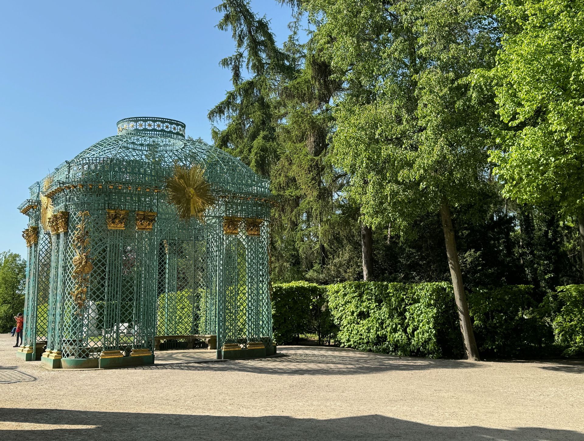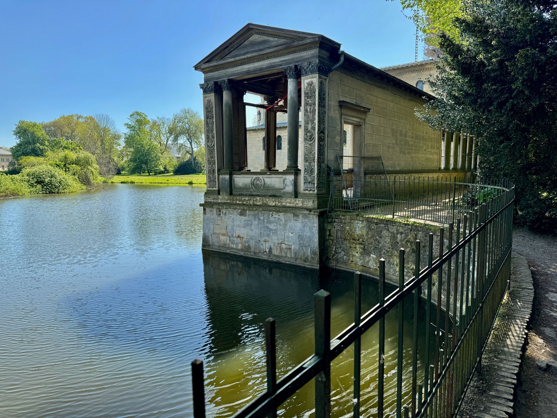 Unser Weg führt uns anschließend an der Mühle vorbei zum Orangerieschloss, das derzeit wegen Restaurierungsarbeiten geschlossen ist. Die Dichte an Schlössern und ähnlichen Bauten in diesem Park beeindruckt mich sehr.