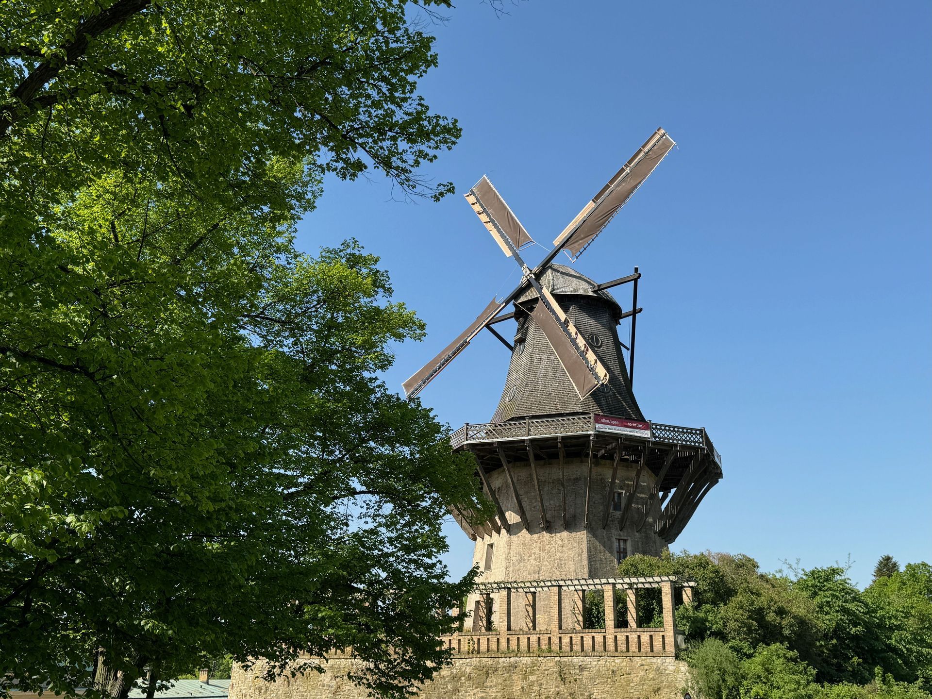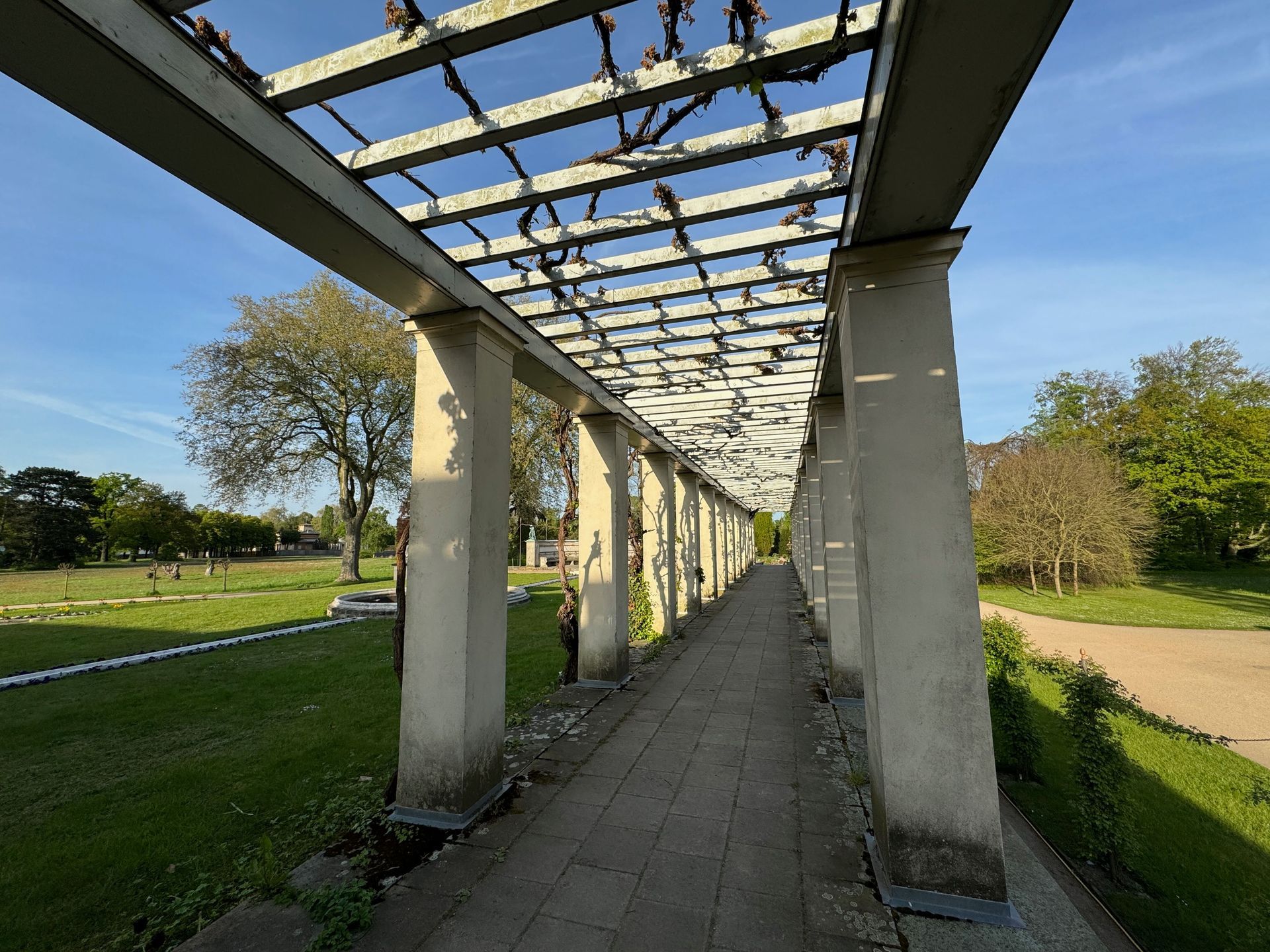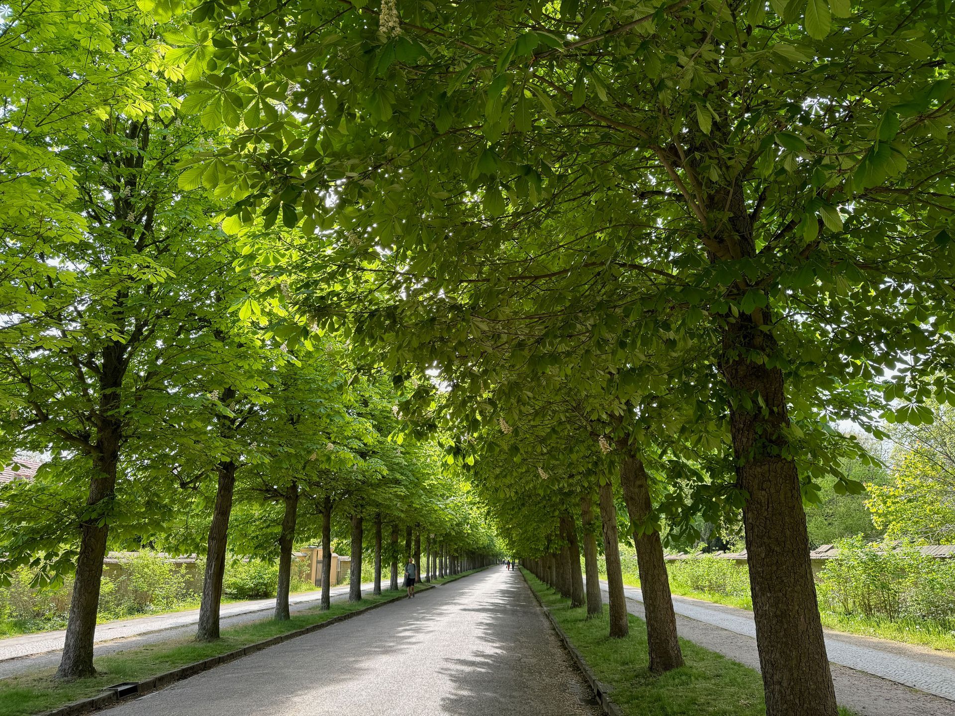 Mit dem Bus fahren wir die gleiche Linie wie gestern Nachmittag, nur steigen wir diesmal eine Haltestelle früher aus. Durch einen baumbestandenen schönen Pfad gehen wir durch einen Park stetig bergauf. Wir sind begeistert von all den Grünflächen und den Parkanlagen, die Potsdam zu bieten hat. Natürlich sind diese bei solch einem Traumwetter, wie es uns während der kleinen Auszeit begleitet, umso schöner.