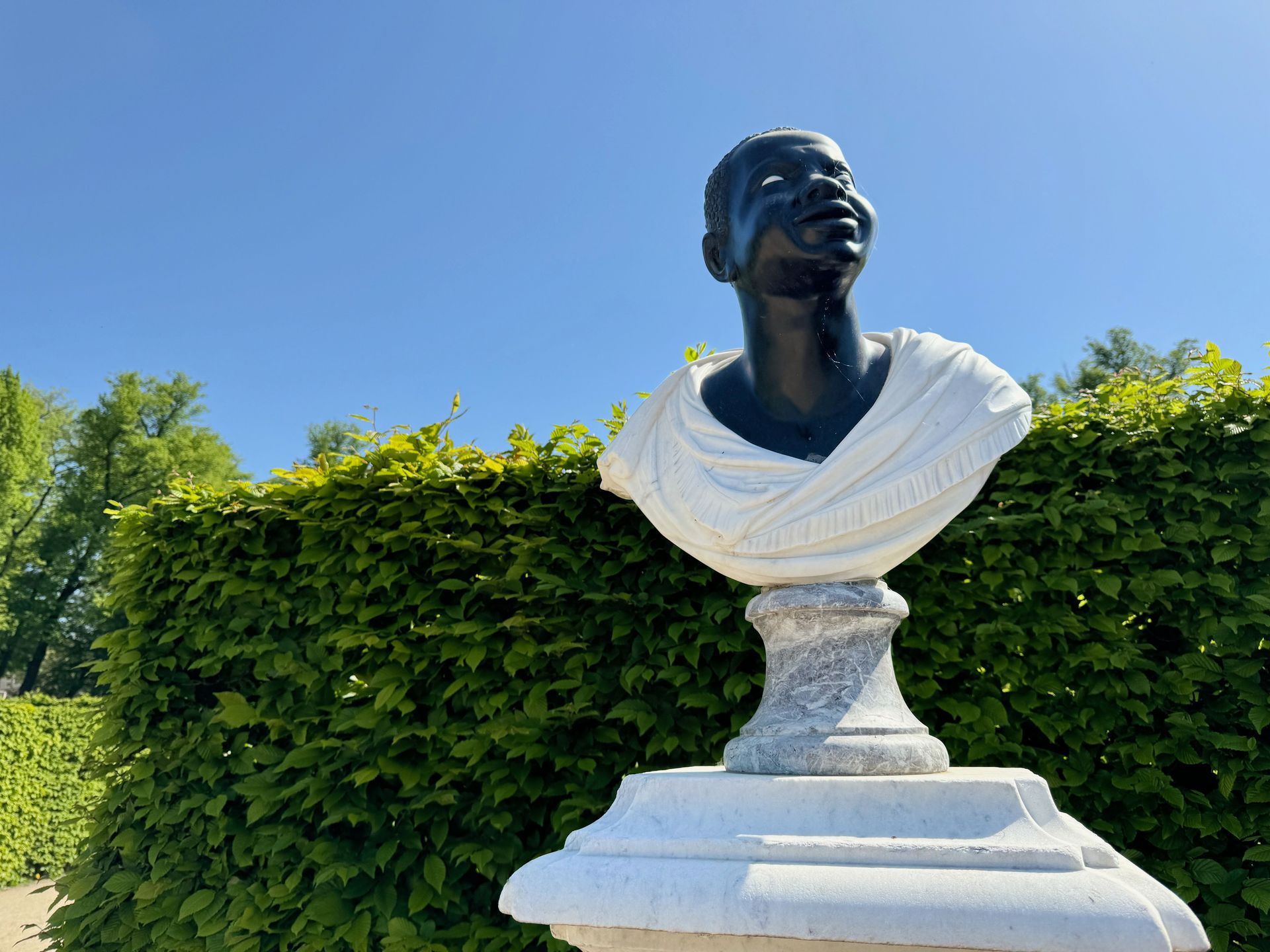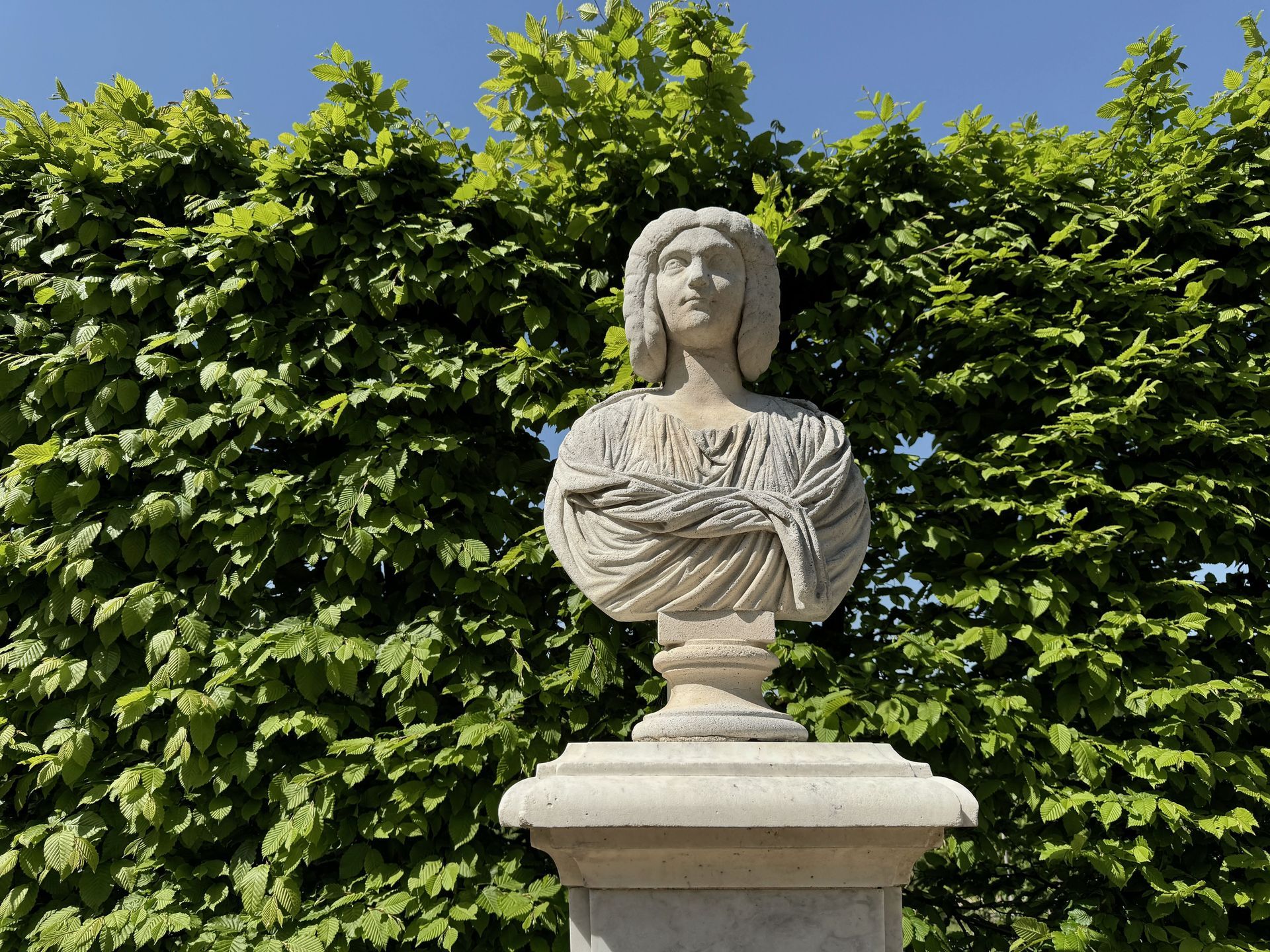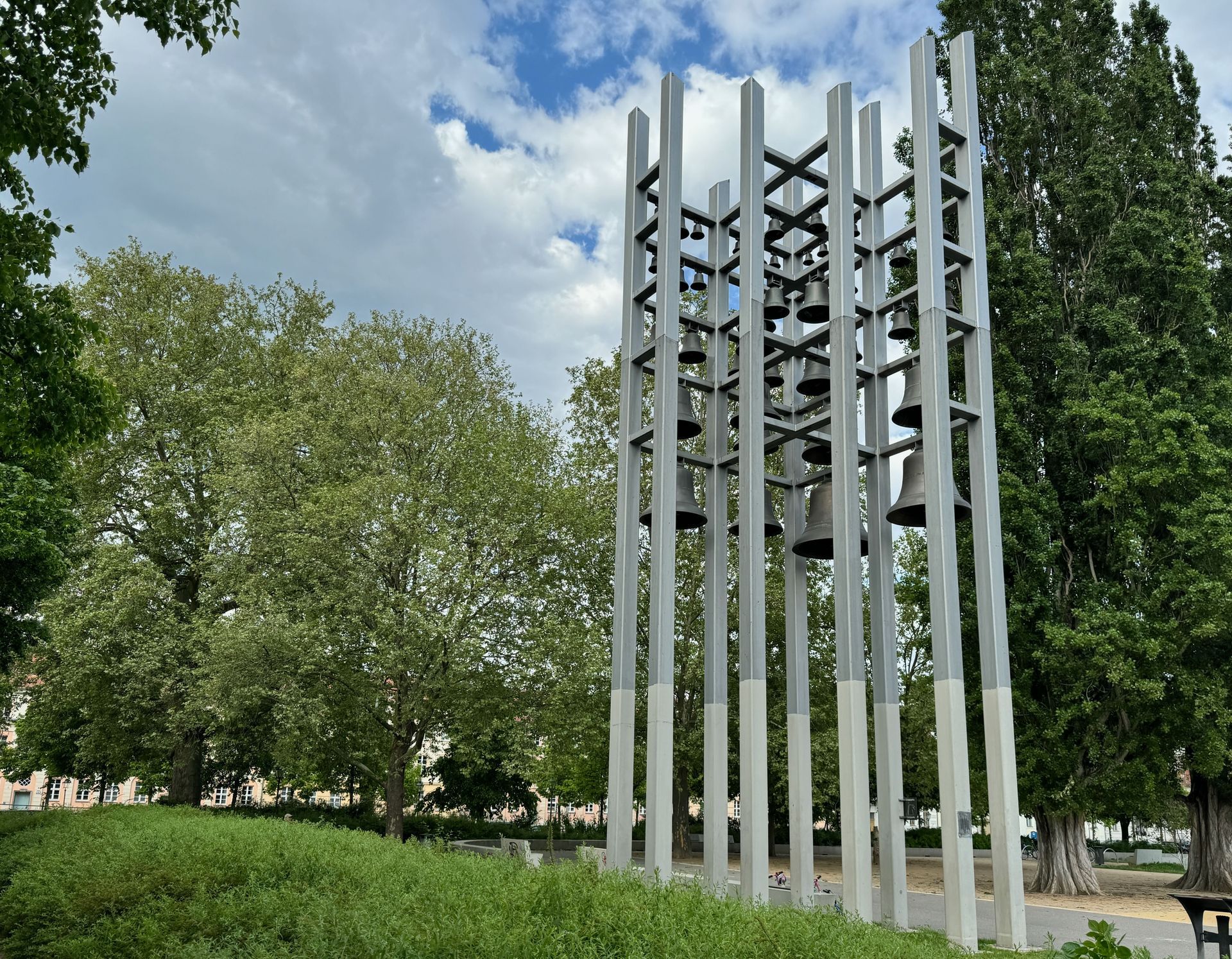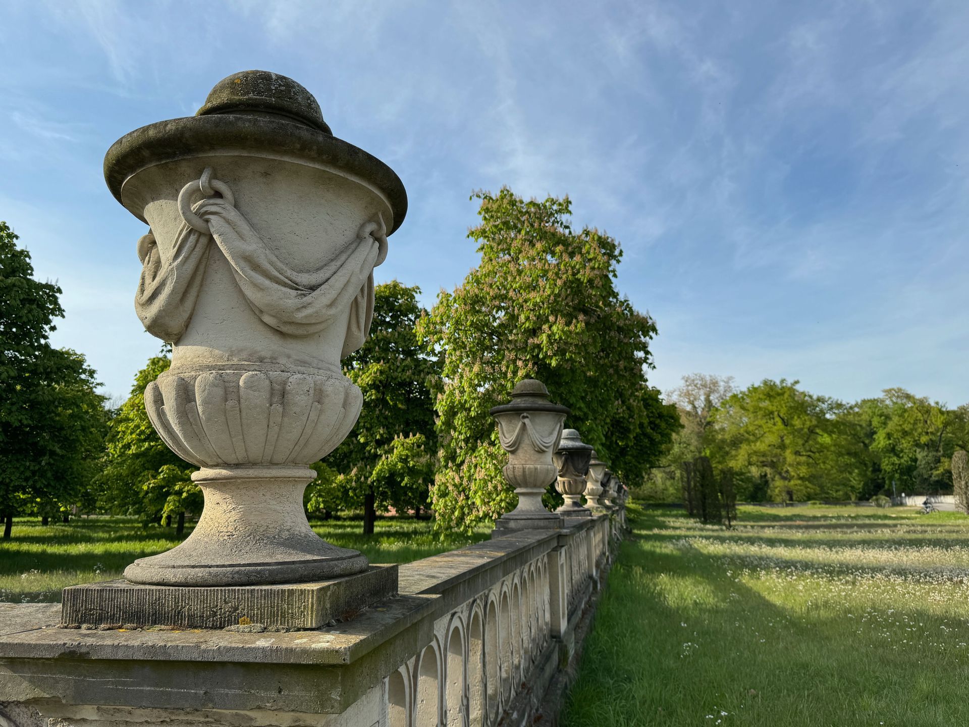 Mit dem Bus fahren wir die gleiche Linie wie gestern Nachmittag, nur steigen wir diesmal eine Haltestelle früher aus. Durch einen baumbestandenen schönen Pfad gehen wir durch einen Park stetig bergauf. Wir sind begeistert von all den Grünflächen und den Parkanlagen, die Potsdam zu bieten hat. Natürlich sind diese bei solch einem Traumwetter, wie es uns während der kleinen Auszeit begleitet, umso schöner.