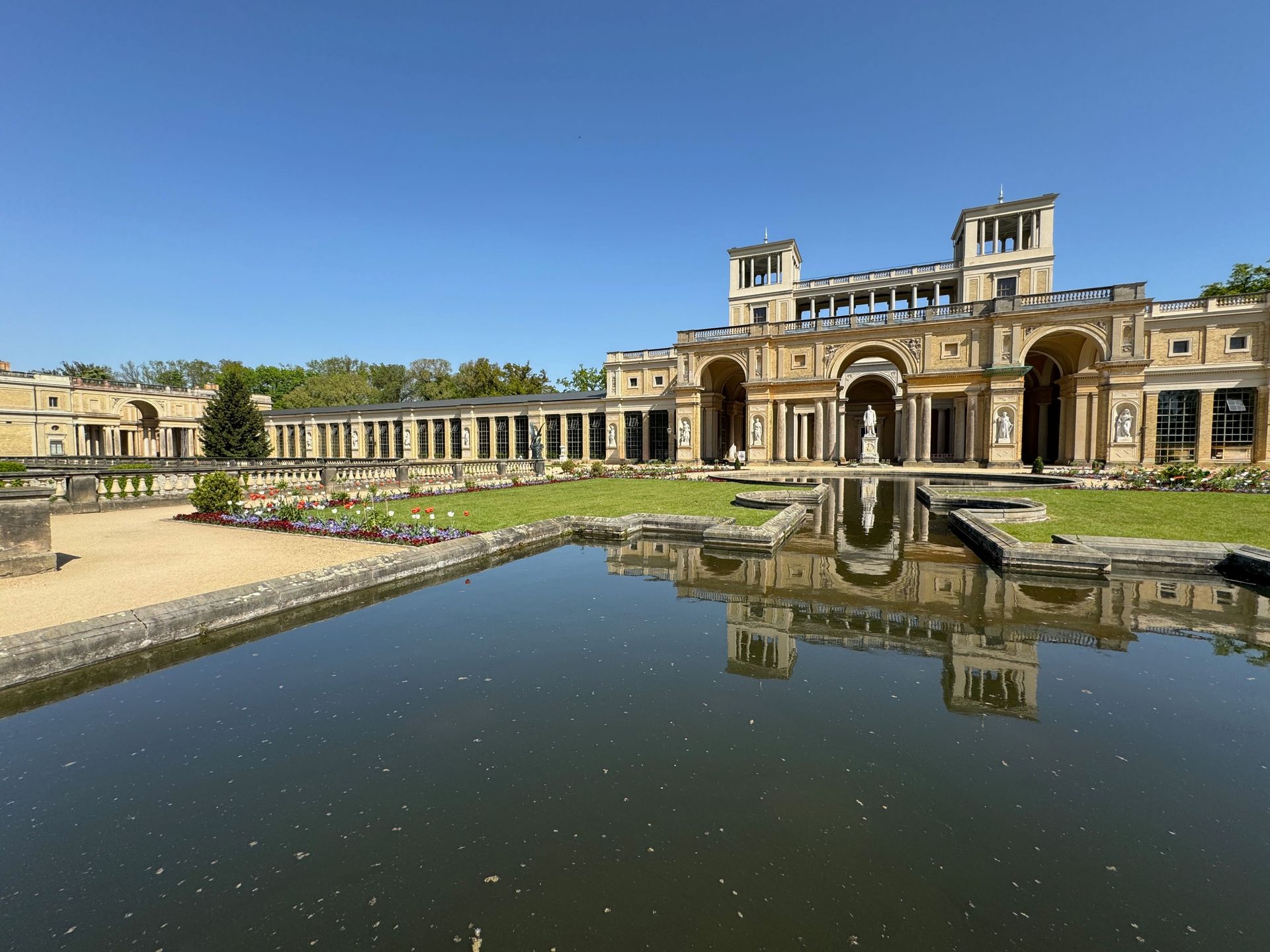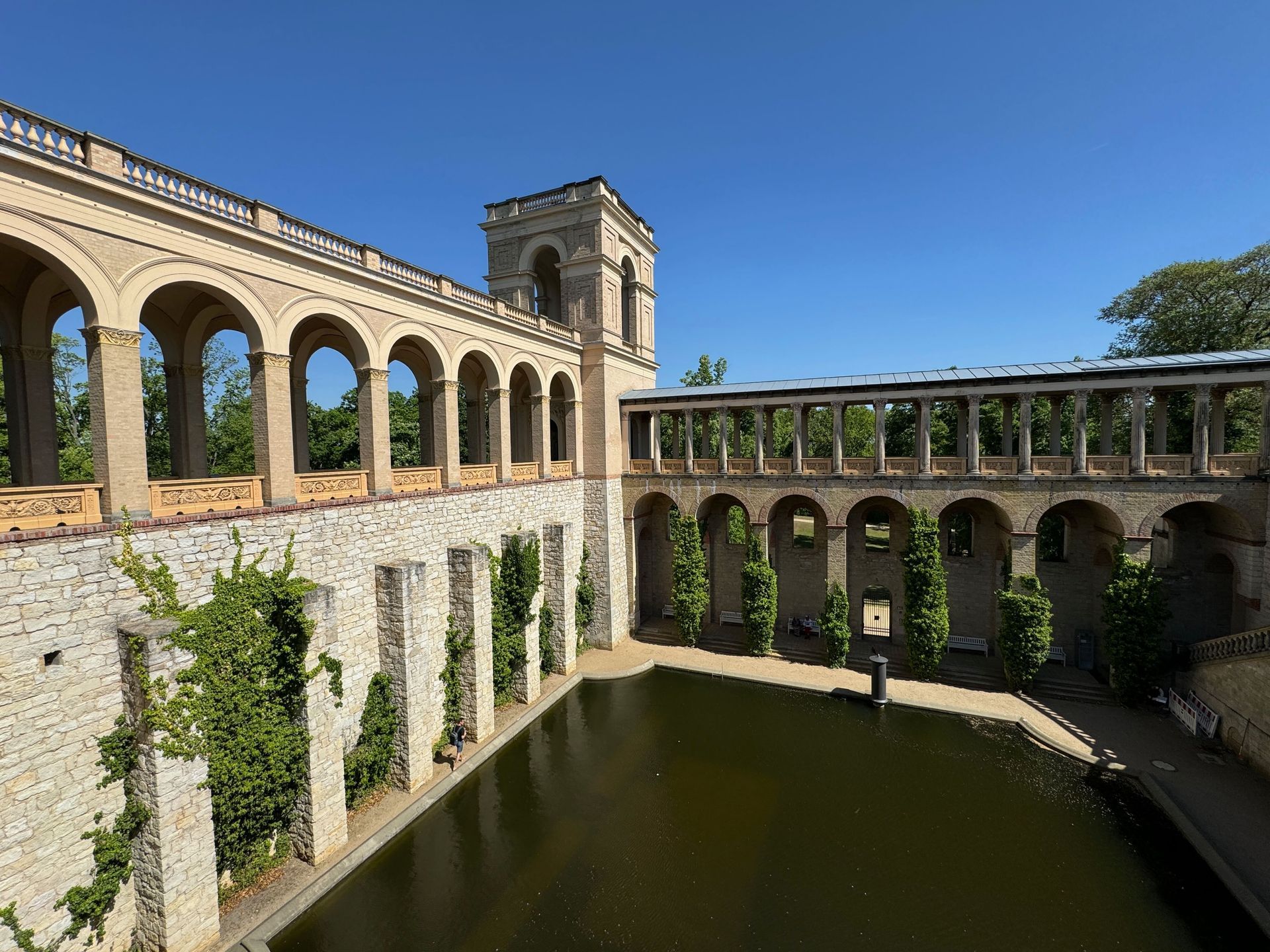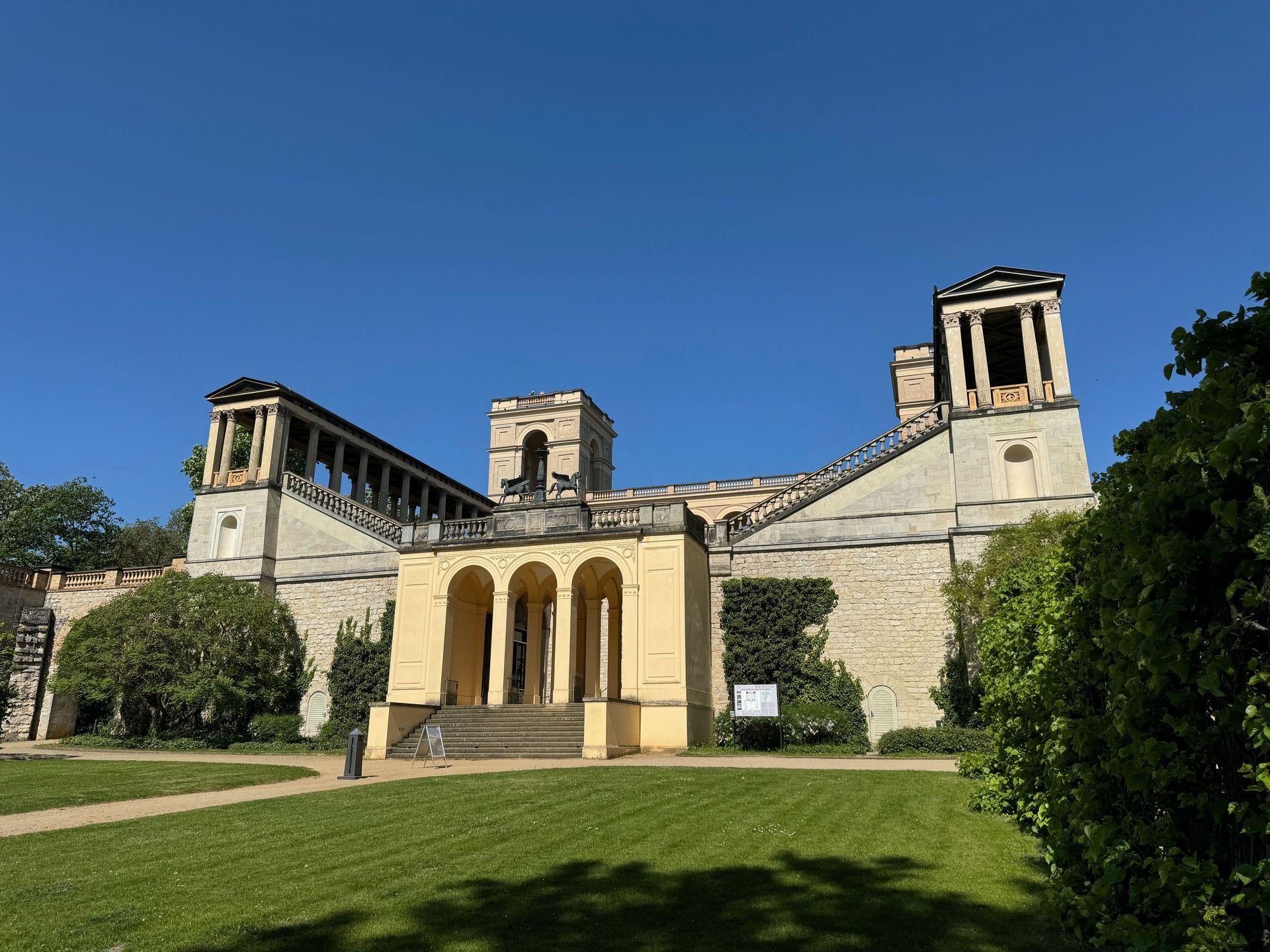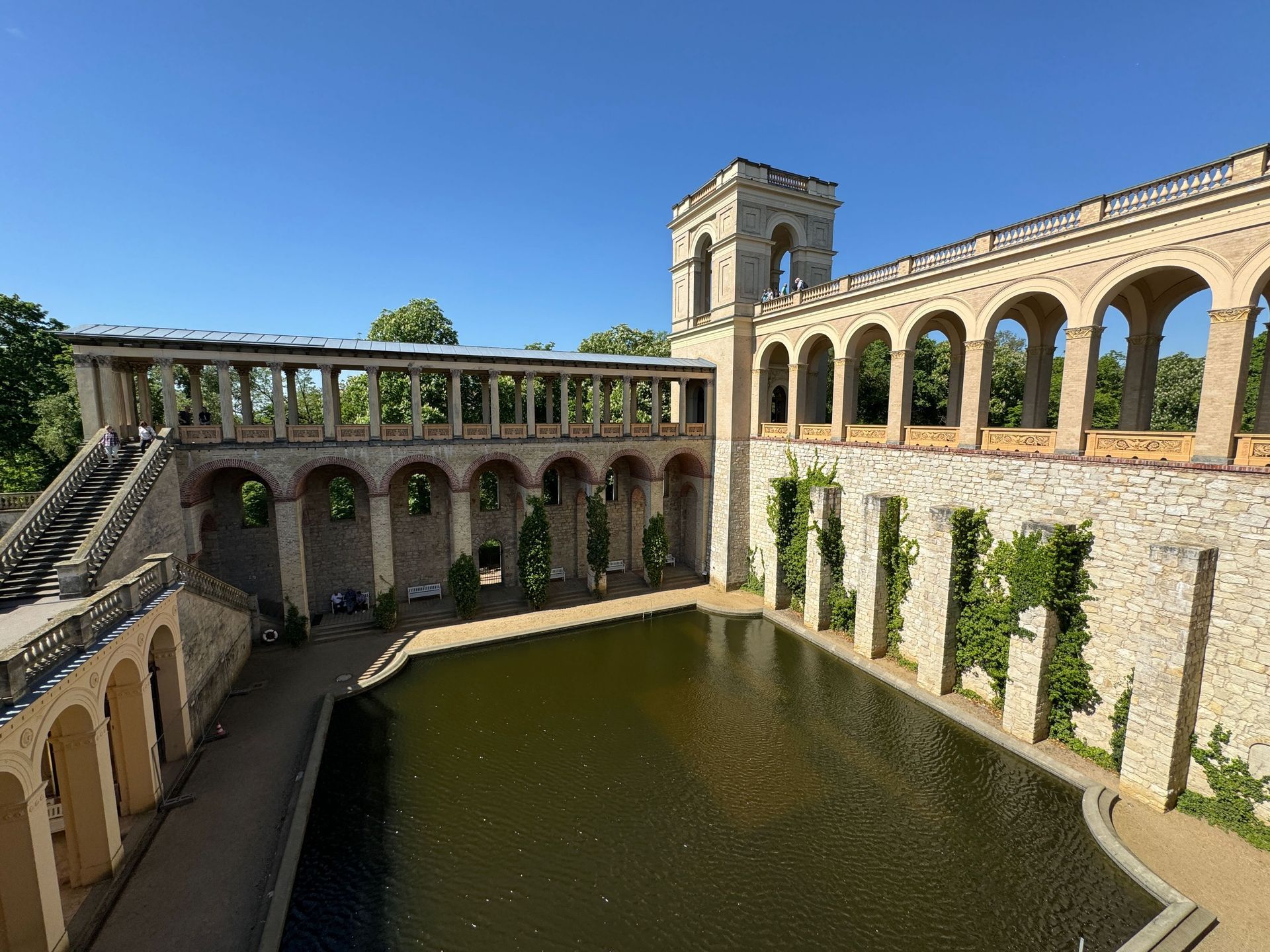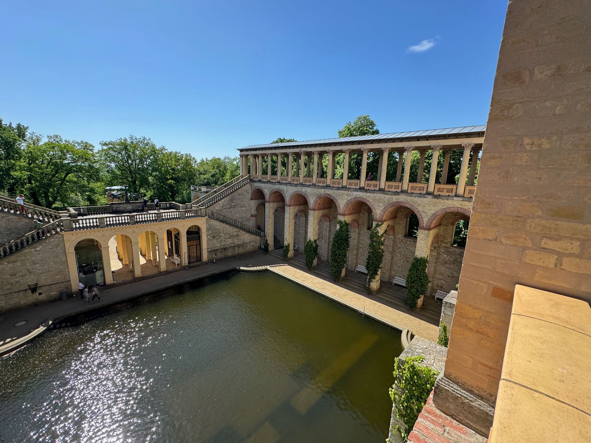 Mit einem Gebäude wie Belvedere auf dem Pfingstberg hatten wir in Deutschland so gar nicht gerechnet, vielleicht mag das naiv klingen, aber so ist es. Wir fühlen uns ein klitzekleinwenig an Andalusien und Italien erinnert bei all den Säulen, Verzierungen und dem Wasserbecken im Innenhof. Von den obersten Plattformen bietet sich ein grandioser Blick über Potsdam und sein Umland mit all dem Grün und seinen vielen Seen.