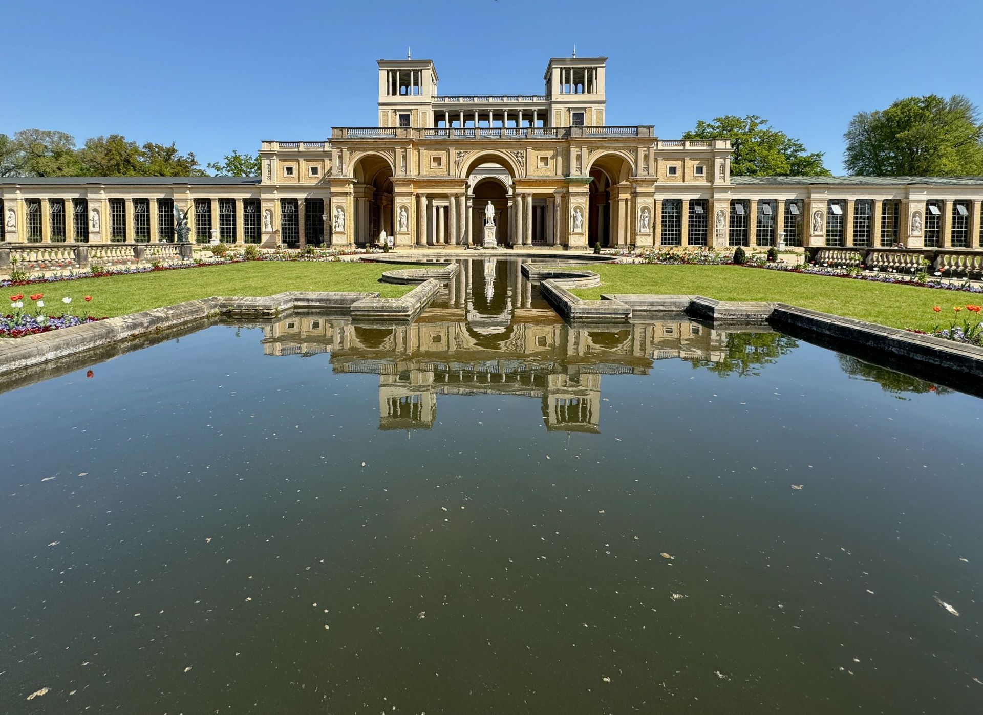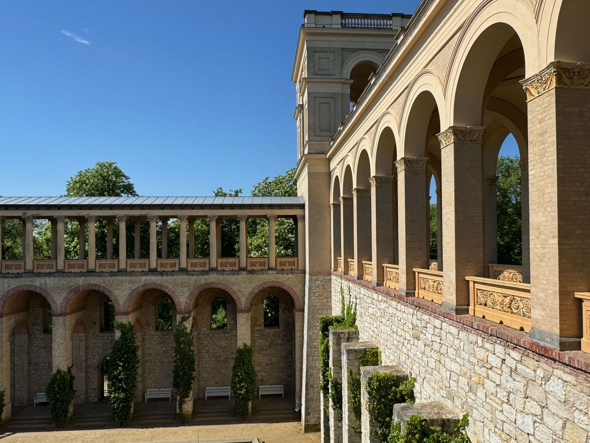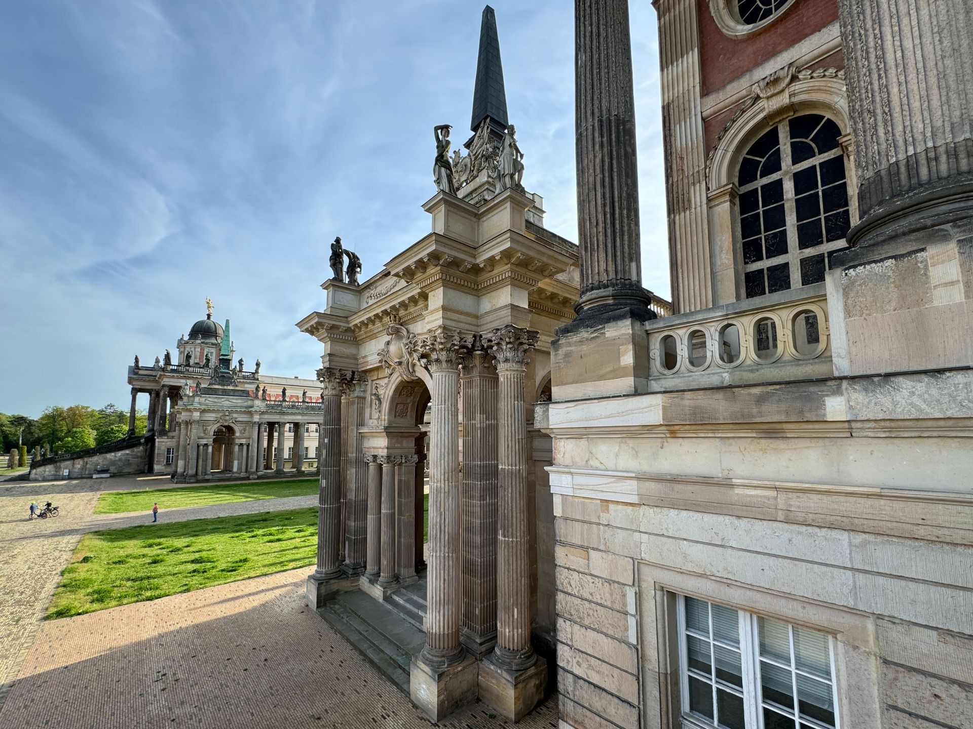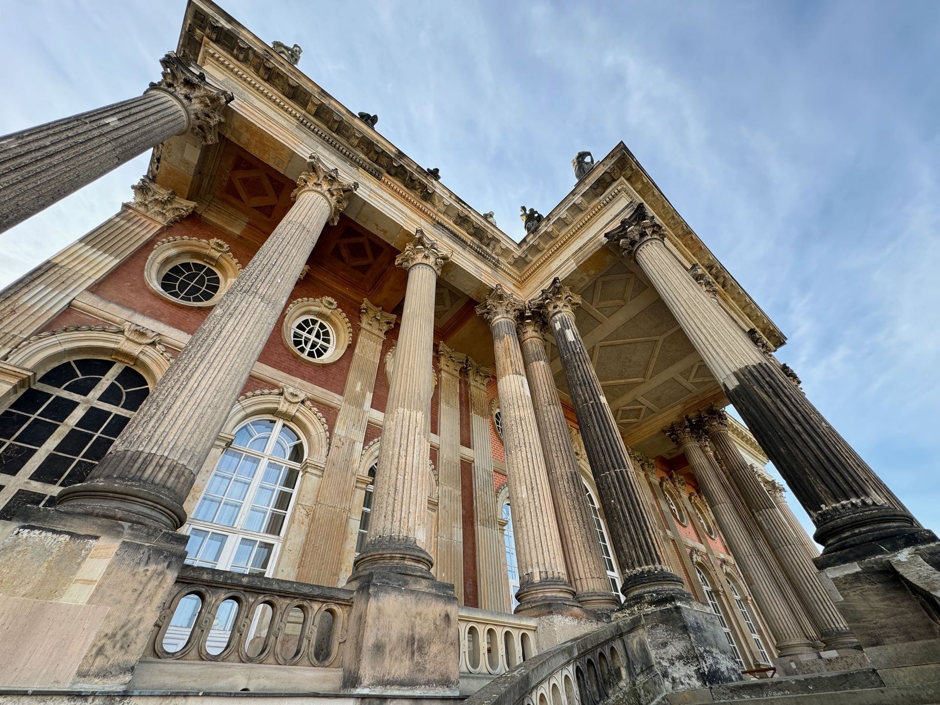 Mit einem Gebäude wie Belvedere auf dem Pfingstberg hatten wir in Deutschland so gar nicht gerechnet, vielleicht mag das naiv klingen, aber so ist es. Wir fühlen uns ein klitzekleinwenig an Andalusien und Italien erinnert bei all den Säulen, Verzierungen und dem Wasserbecken im Innenhof. Von den obersten Plattformen bietet sich ein grandioser Blick über Potsdam und sein Umland mit all dem Grün und seinen vielen Seen.