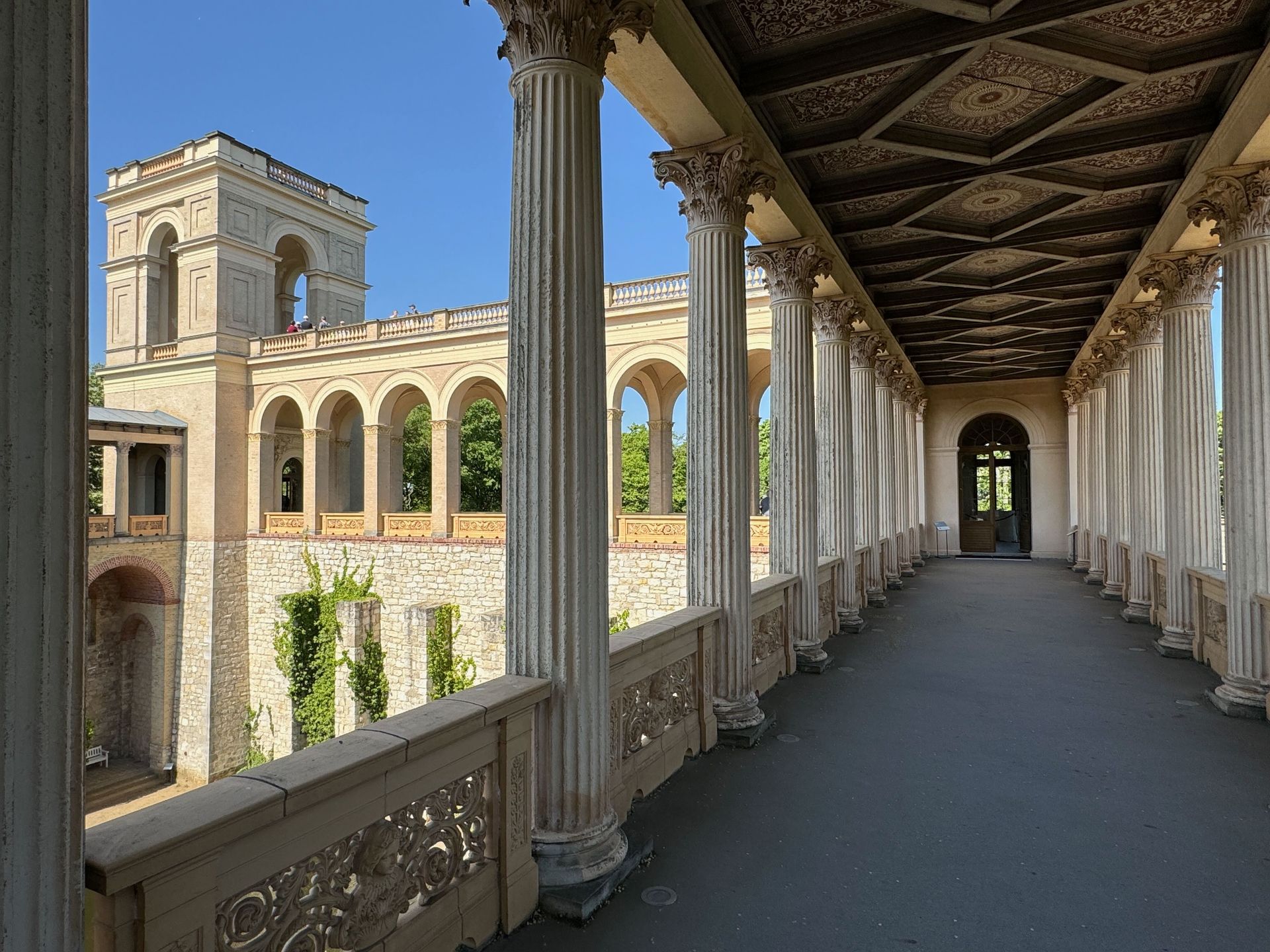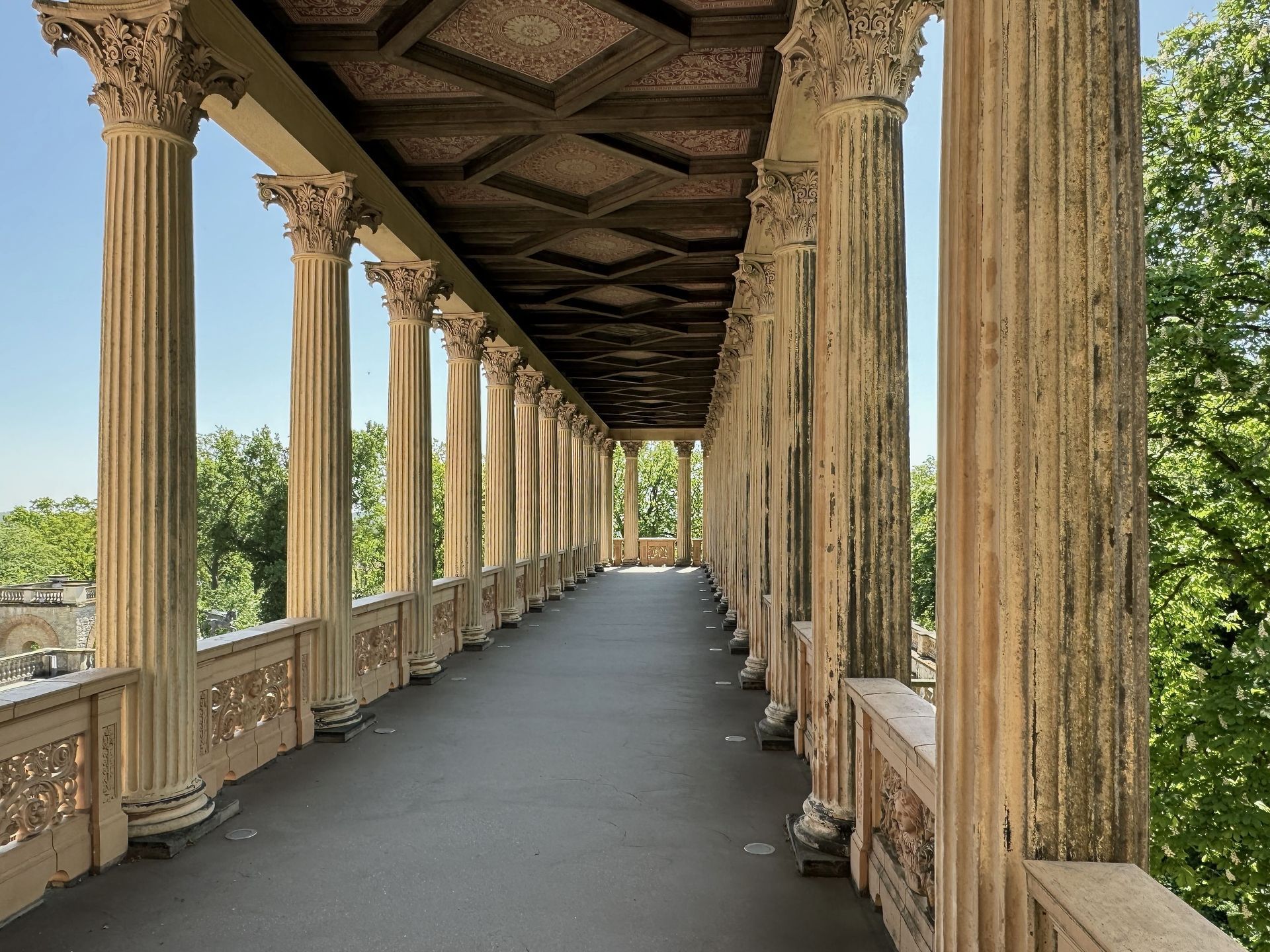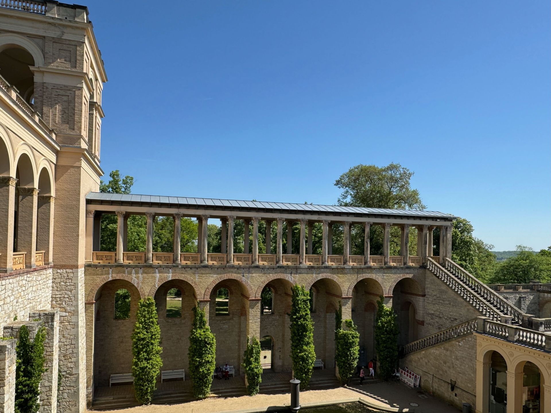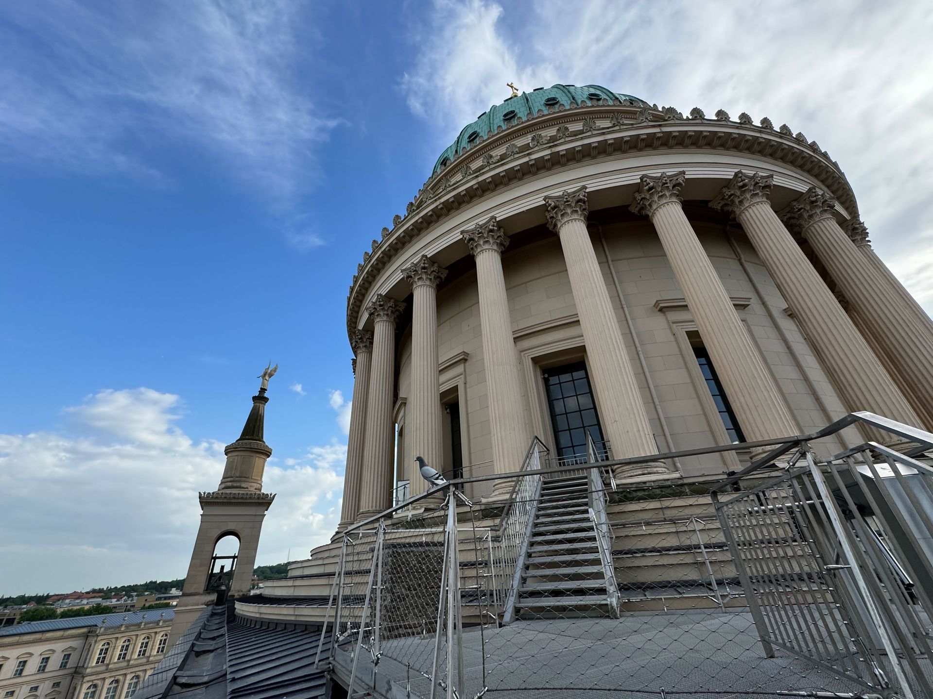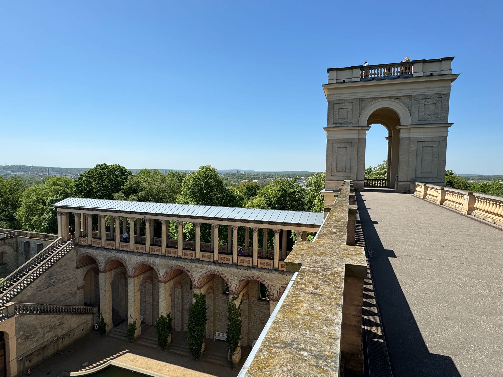Als allerletzte Besucherin des heutigen Tages darf ich noch die mehr als 200 Stufen erklimmen, die zum Kolonnadengang führen, währenddessen mein Mann unten auf dem Platz geduldig auf mich wartet. Von hier oben habe ich einen wunderbaren Blick über das so schöne Potsdam.