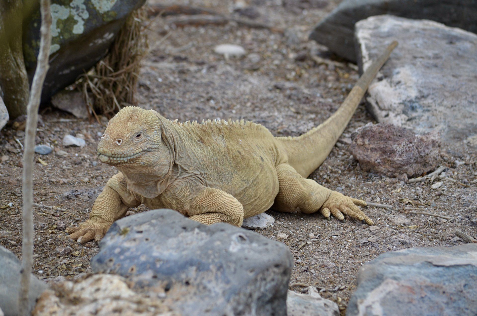 Das Besondere auf Santa Fe sind einerseits die Reisratten, die wir aber nicht zu Gesicht bekommen und andererseits die nur hier vorkommenden gelben Landleguane, deren Kennzeichnen neben der Farbe ein besonders ausgeprägter Rückenkamm ist. Letztere können sich nicht vor uns verstecken und wir können einige davon beobachten. Auch diese Leguane zeigen keinerlei Scheu vor uns, ganz im Gegenteil, wir haben eher den Eindruck, wir sind ihnen egal. Auf der Insel wachsen neben den Baumopuntien auch einige Scalesien.