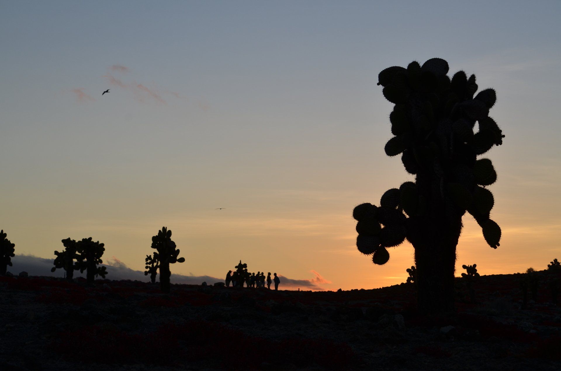 Der Boden der hügeligen Insel ist übersät von tiefroten Galápagos Sesuvien und mittendrin stehen Baumopuntien. Die Galápagos Sesuvien sind endemisch und nur in der Trockenzeit rot. Zur Regenzeit wechseln sie ihre Farbe und zeigen sich grün.