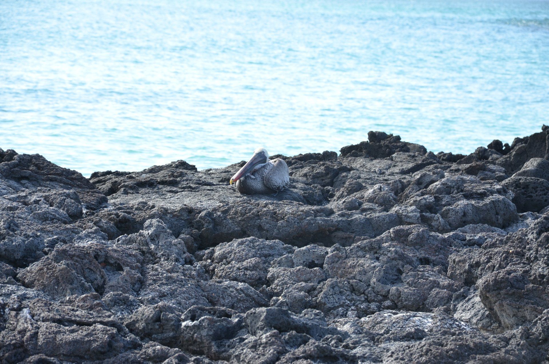Geübt mit Nassanlandungen nähern wir uns dem Cerro Brujo, ein langer, blendend weißer Traumstand, der unterhalb eines Tuffkraters liegt. Wir konnten wählen zwischen einer Schnorcheltour, Fahrt mit dem Glasbodenboot oder einem langen Spaziergang am Strand, der wieder viel Wildlife versprach. Wir wählten das Letztere. Überall entlang des Strandes halten sich Tiere auf, unzählige Seelöwen, Erwachsene und Babies, Leguane, die hier wieder ganz anders aussehen als die, die wir bisher auf den Inseln gesehen haben, braune Pelikane, die allgegenwärtigen Möwen und überall neugierige Spottdrosseln (Mockingbirds), die Vögel, die Charles Darwin zu seiner Evolutionstheorie veranlassten.