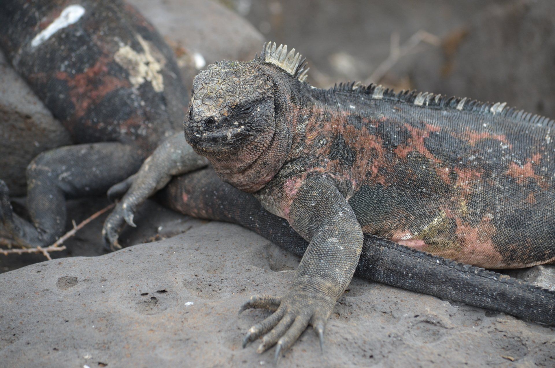 Aber die Albatrosse sind hier nicht die einzigen Sichtungen, die mir voller Begeisterung die Tränen in die Augen treiben. Große Kolonien von Nazcatölpeln und anderen Seevögeln bevölkern die Klippen, dazwischen liegen immer wieder, regelrecht übereinander gestülpt in mehreren Schichten, die bunten (hier auf der Insel zumeist rot/schwarzen) Meeresechsen. Aus diesen Haufen spritzt einem regelmäßig Meerwasser aus den Nasenlöchern der Echsen entgegen.