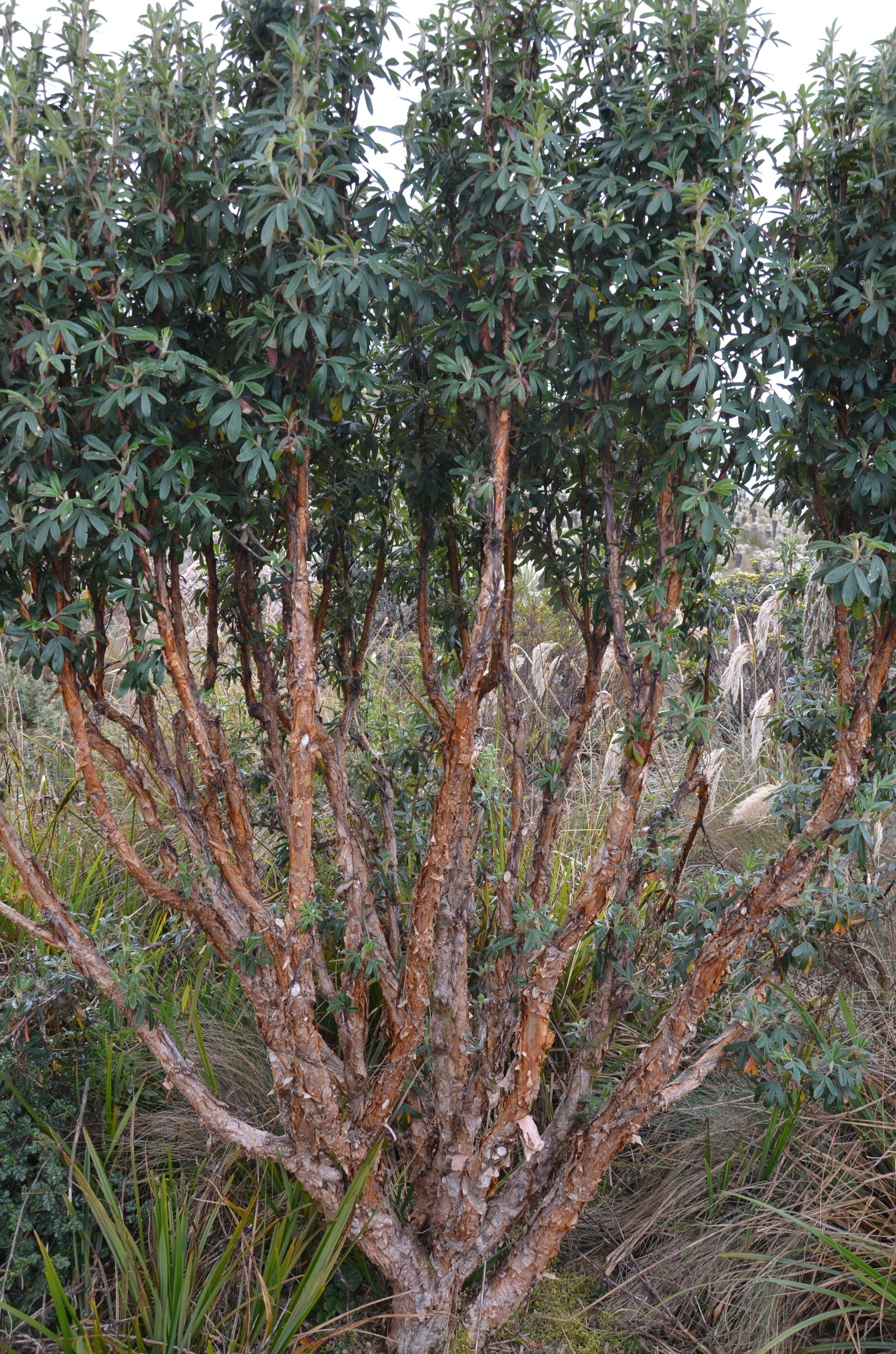 Im Park wächst neben den Frailejones noch ein anderes, sehr interessantes Gewächs – der Polylepis, der Papierbaum. Im Reserva gibt es das Areal „Bosque Polylepis“, wo man noch viel mehr von diesem Papierbaum sehen kann, aber selbst hier sind sie nicht zu übersehen. Dort, wo einmal kein Frailejones steht, steht er, der Papierbaum. Der Papierbaum, so vermutet man, kann bis zu 1.500 Jahre alt werden. Wie einige Wirbellose häutet sich auch der Papierbaum regelmäßig und wirft seine Rinde in Schichten ab. Damit schützt er sich unter anderem gegen Parasiten.