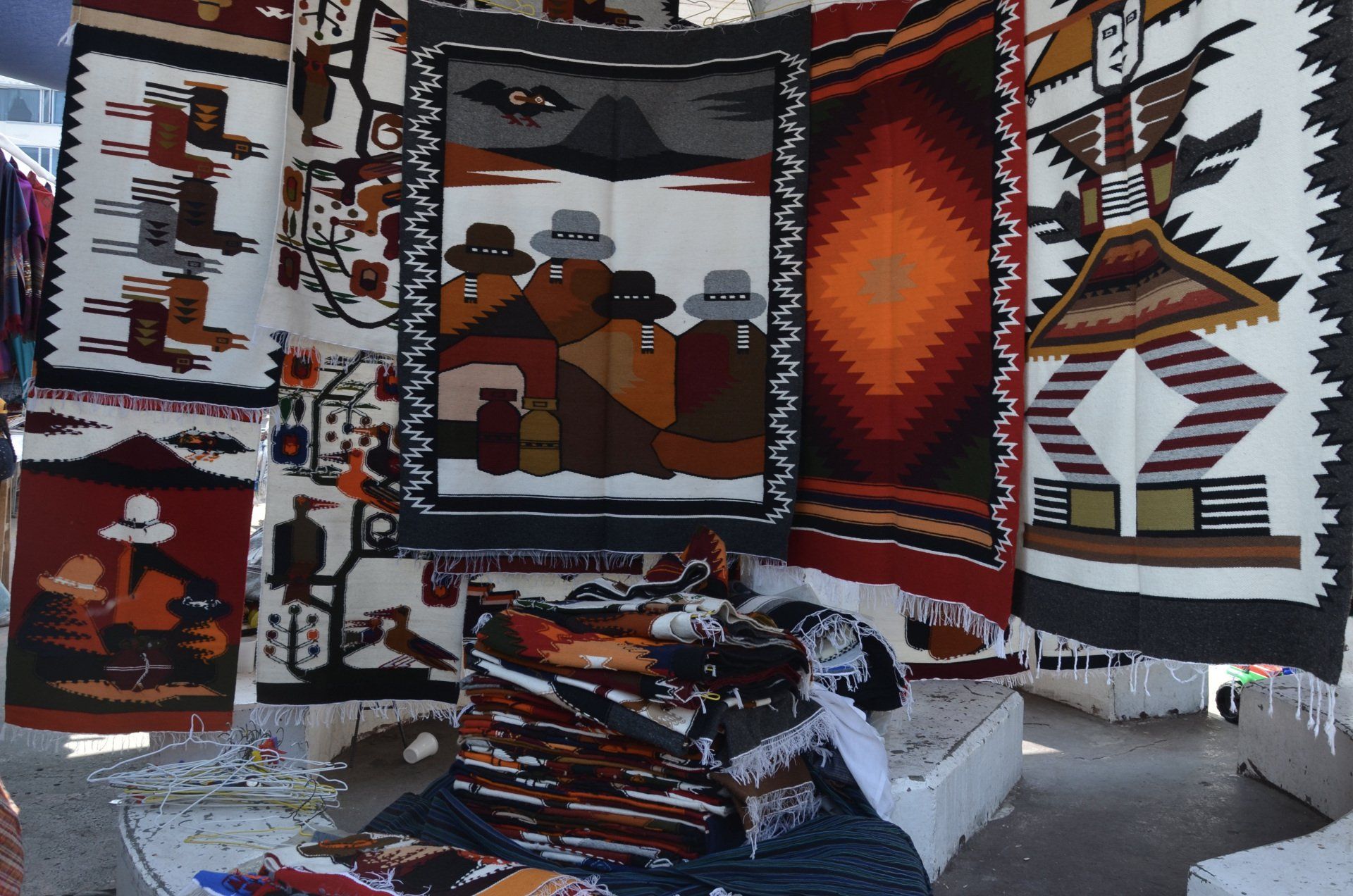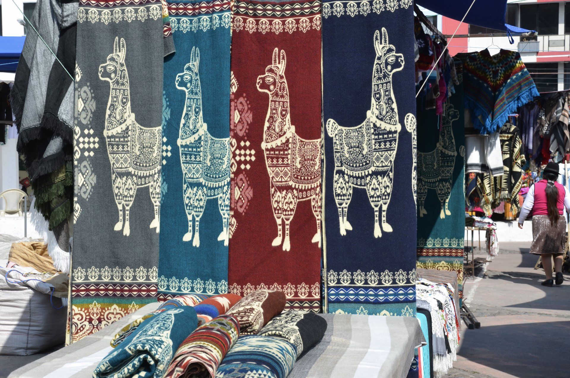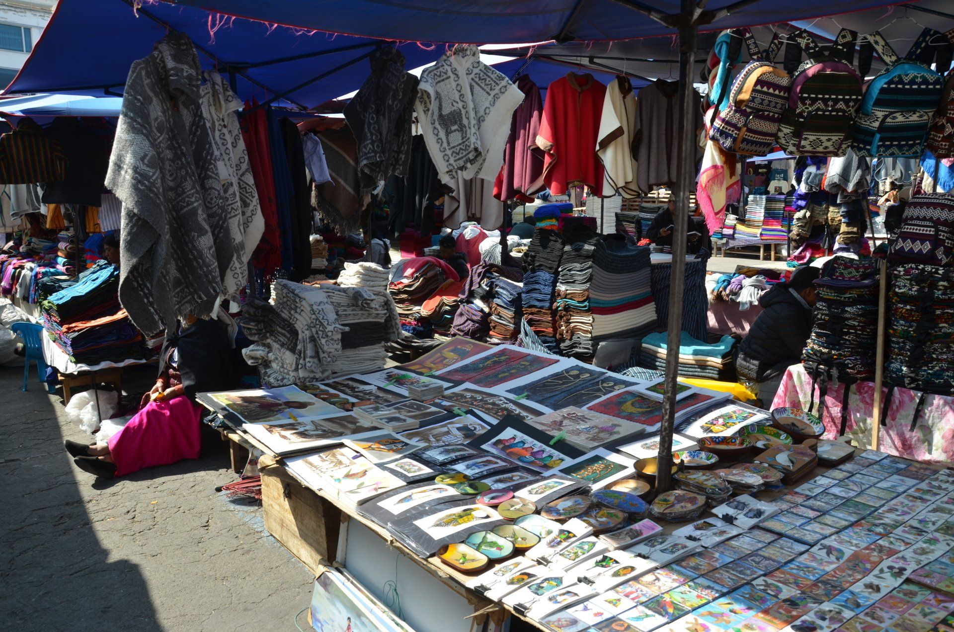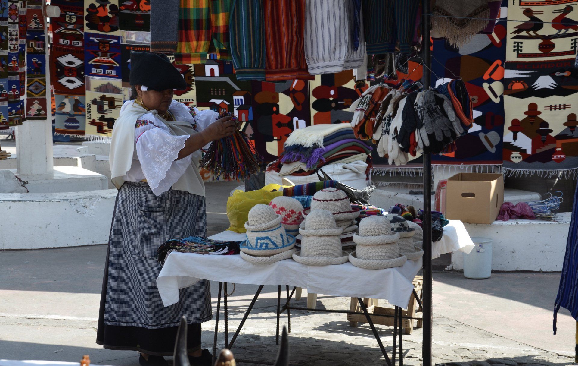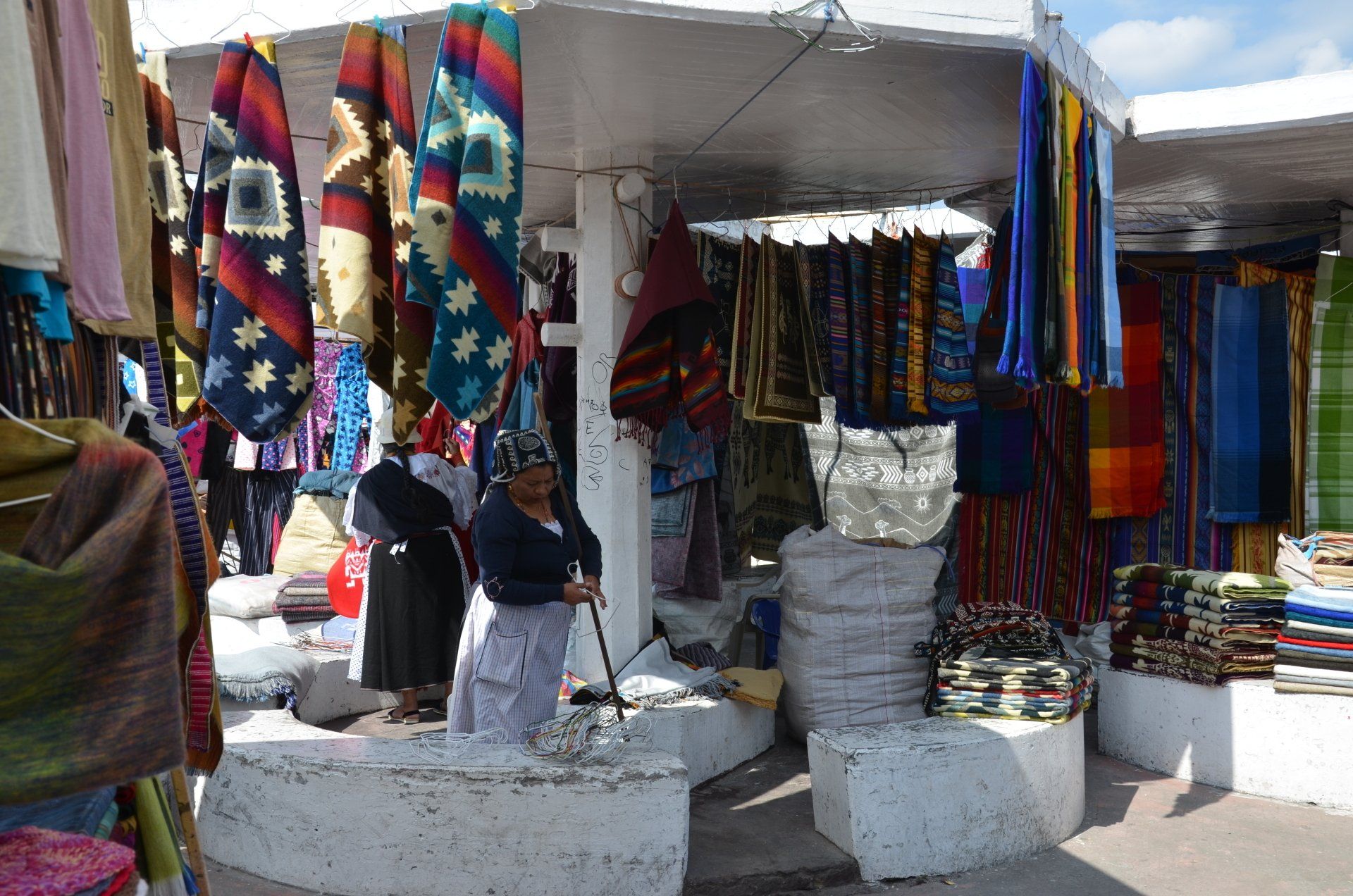 Der Tag startet nicht ganz früh - so ganz nach meinem Geschmack. Zur vereinbarten Zeit um 09:00 Uhr morgens werden wir abgeholt. Wir fahren direkt nach Otavalo ins Zentrum, wo wir dem Markt einen Besuch abstatten wollen. Um diese Uhrzeit ist hier so gut wie nichts los. Die Stände mit ihren Auslagen sind alle aufgebaut und die Verkäufer warten auf Besucher. Diese werden wohl eintreffen – hauptsächlich als Halb- oder Tagestouren aus Quito gebucht -, wenn wir Otavalo bereits schon wieder verlassen haben. Nur wenige andere Besucher, zumeist Touristen, aber auch ein paar Einheimische, sind hier unterwegs. Der Markt in Otavalo gehört bei organisierten Rundreisen nahezu immer zum Pflichtprogramm.
