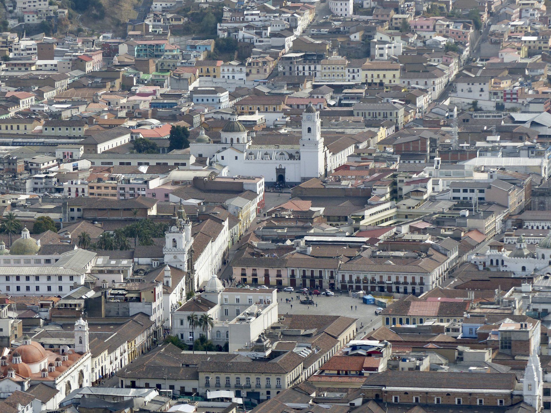 Die Aussicht vom Mirador el Panecillo ist auf jeden Fall grandios, man sieht von oben auf die Altstadt und kann sehr gut erkennen, wie die Stadt schachbrettartig angelegt wurde. Gekrönt wird das Ganze mit drei Vulkanen im Hintergrund: Cayambe (5.790 Meter), Antisana (5.704 Meter) und Cotopaxi (5.897 Meter). Wir haben Traumwetter erwischt. Pablo sagt uns, dass man ganz selten das Glück hat, diese drei Vulkane gleichzeitig zu sehen. Wir genießen noch ein wenig von diesem traumhaften Panorama und schlendern im Anschluss ein wenig auf dem Panecillo umher, bevor wir dann ins Auto steigen und Richtung Quitos Altstadt fahren.