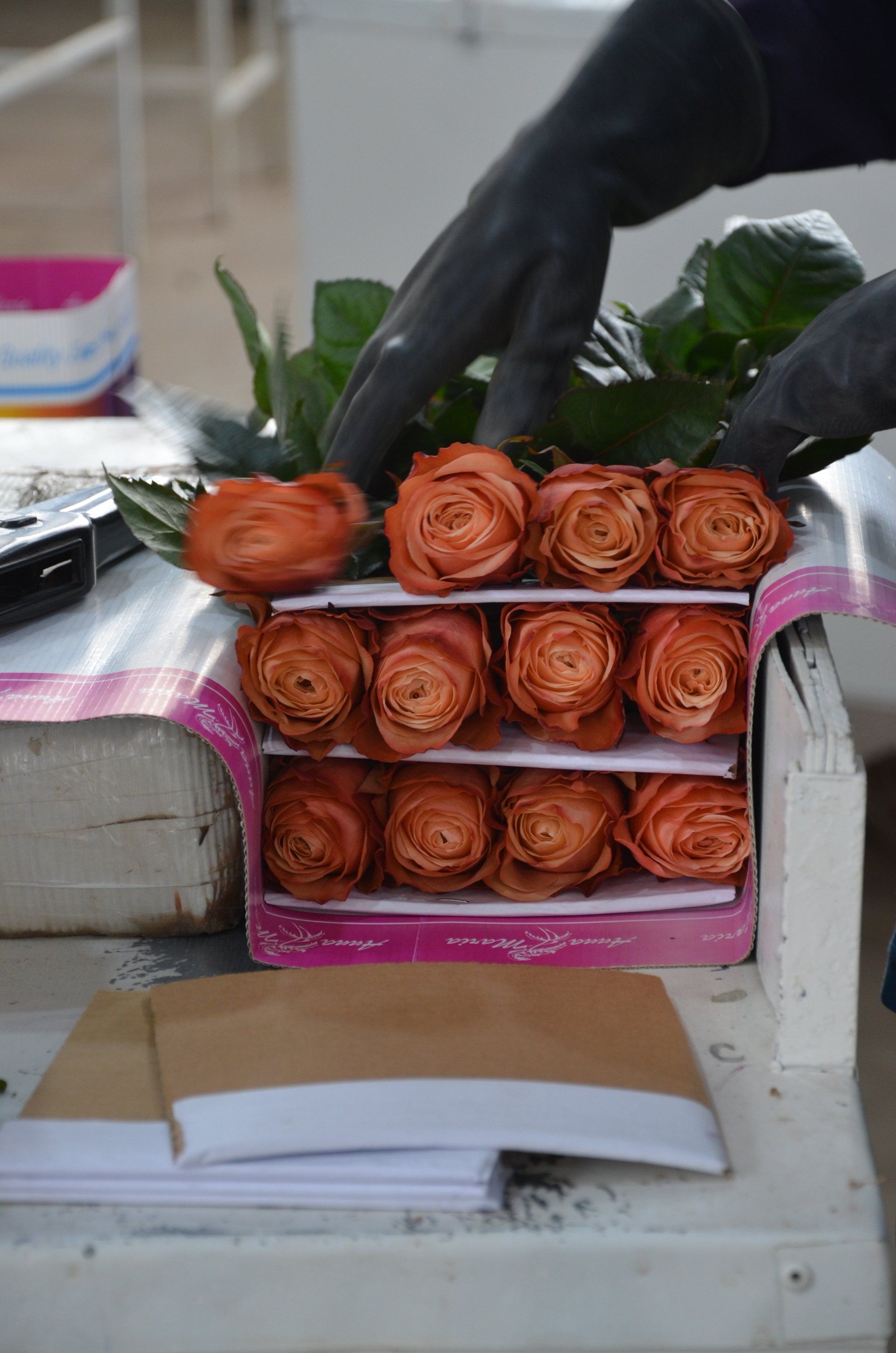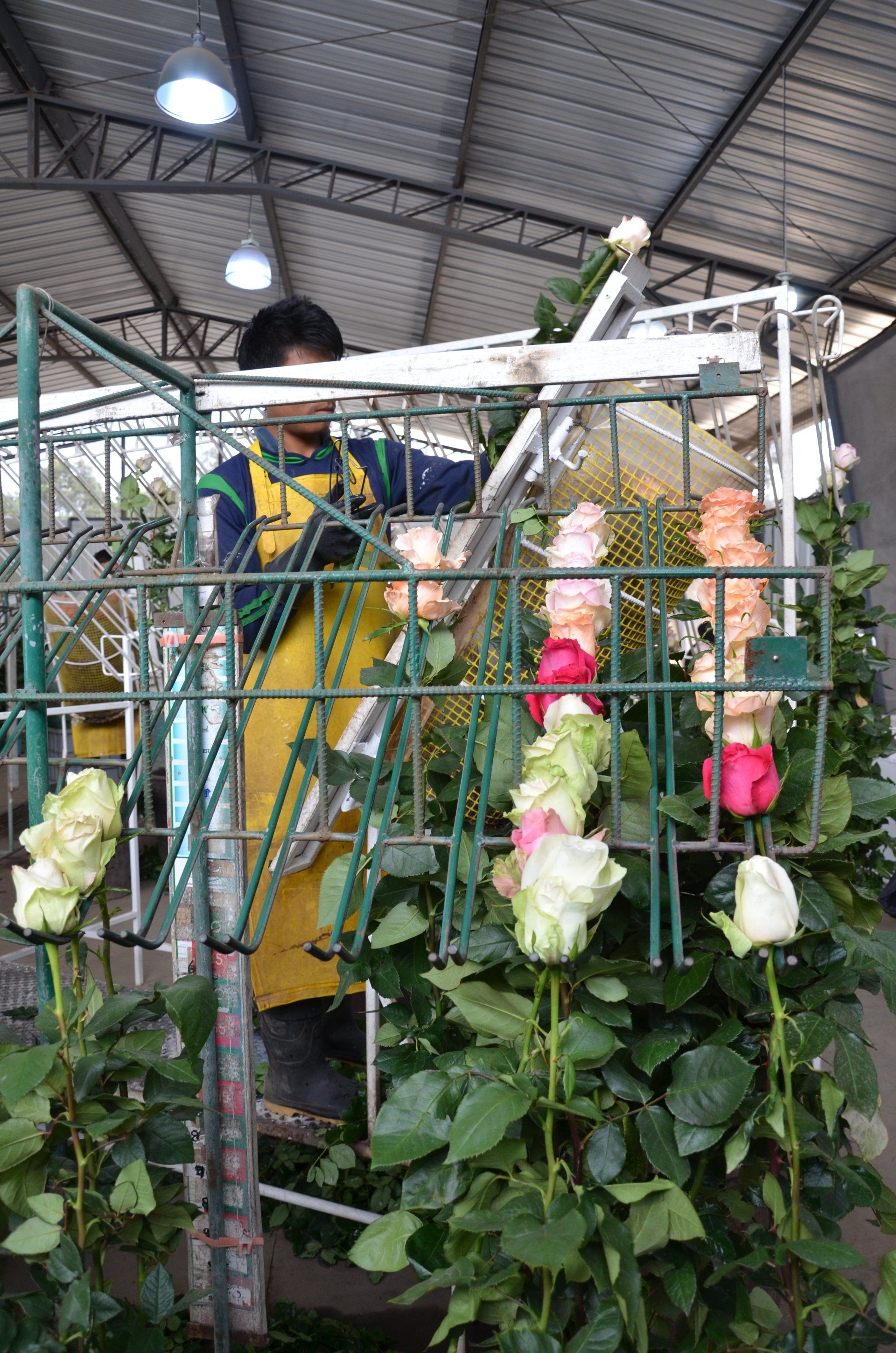 Nach der Sortierung werden diese zu jeweils 25 Stück verpackt und am Ende die Stile so abgeschnitten, dass alle die gleiche Länge haben. Die Nachfrage nach Farben und Länge der Rosen variiert in den Zielländern sehr. Die Geschmäcker sind eben sehr unterschiedlich.