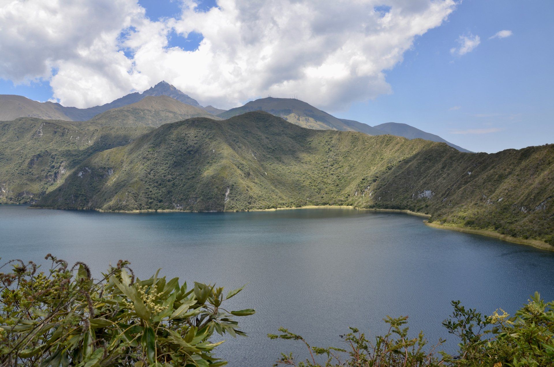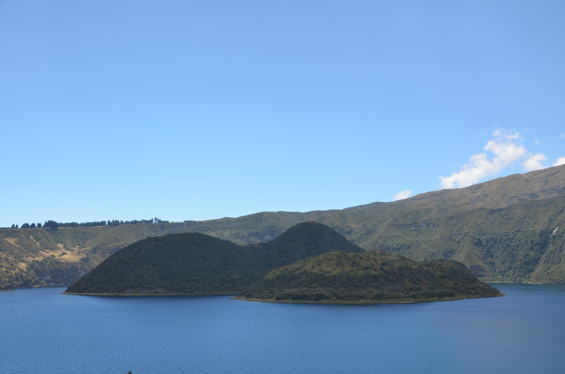 Unser nächstes Ziel ist der Kratersee Cuicocha (Meerschweinchen-See). In diesem Kratersee, unter dem es immer noch brodelt, gibt es kein Leben. Er liegt auf einer Höhe von 3.070 Metern und ist 170 Meter tief. Der See ist herrlich gelegen, mittendrin befinden sich zwei Inseln, die Isla Teodoro Wolf und die Isla Yerovi. Wer Lust und Laune hat, kann den Kratersee auf einem 12 Kilometer langen Pfad umrunden. Wir gehen ein ganzes Stück den See entlang, drehen dann aber wieder um. Die ganze Umrundung ist uns zu weit. Wir konnten auch bereits schon auf diesem Stück viele Perspektiven des Sees fotografisch einfangen und die Umgebung genießen. Uns gefällt hier auch ziemlich gut, dass nicht allzu viele Menschen unterwegs sind, uns begegnen zwar einige wenige Personen auf dem Pfad rund um den See, aber überlaufen ist hier nichts. Sicherlich war gestern am Sonntag wesentlich mehr los.